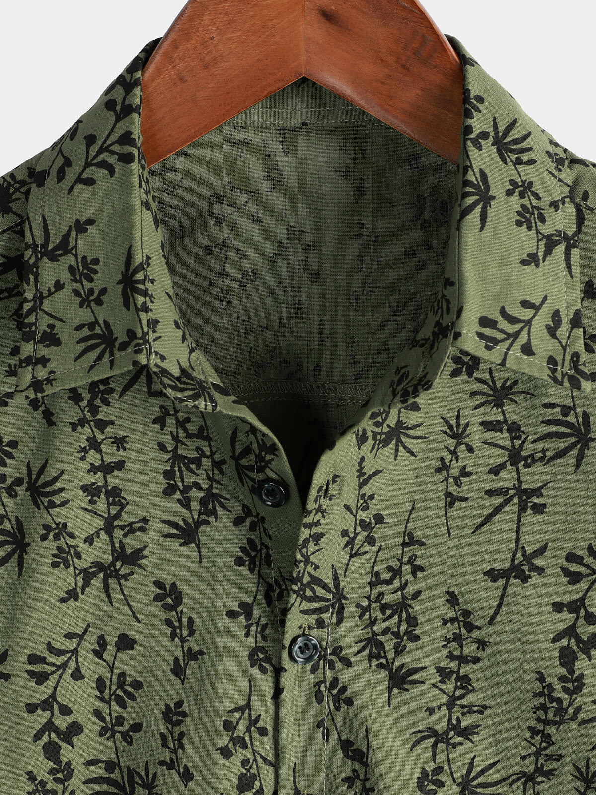 Men's Green Cotton Hawaiian Summer Vintage Floral Holiday Cruise Short Sleeve Button Up Shirt