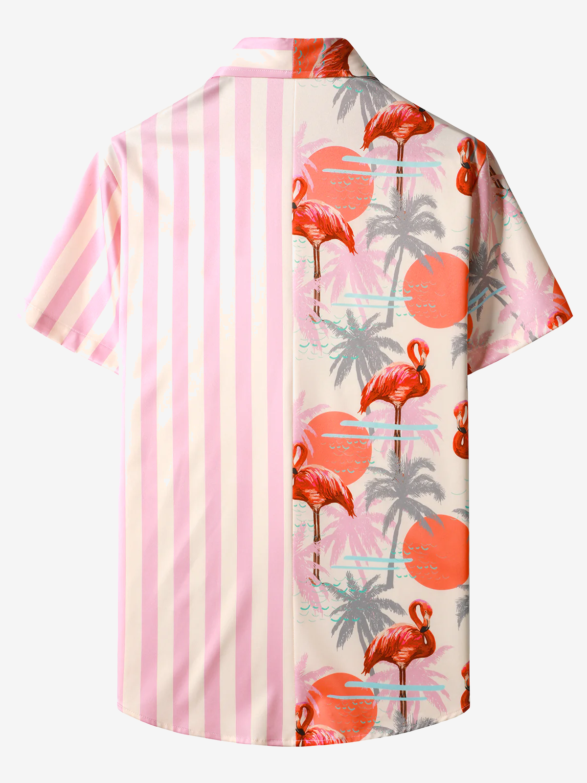 Men's Tropical Palm Tree Flamingo Print Striped Pink Animal Print Top Short Sleeve Shirt