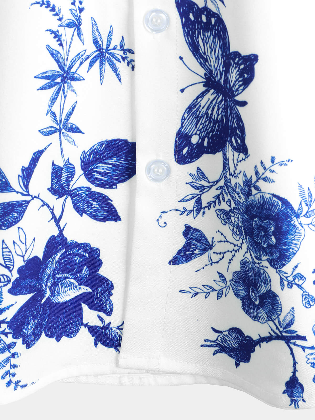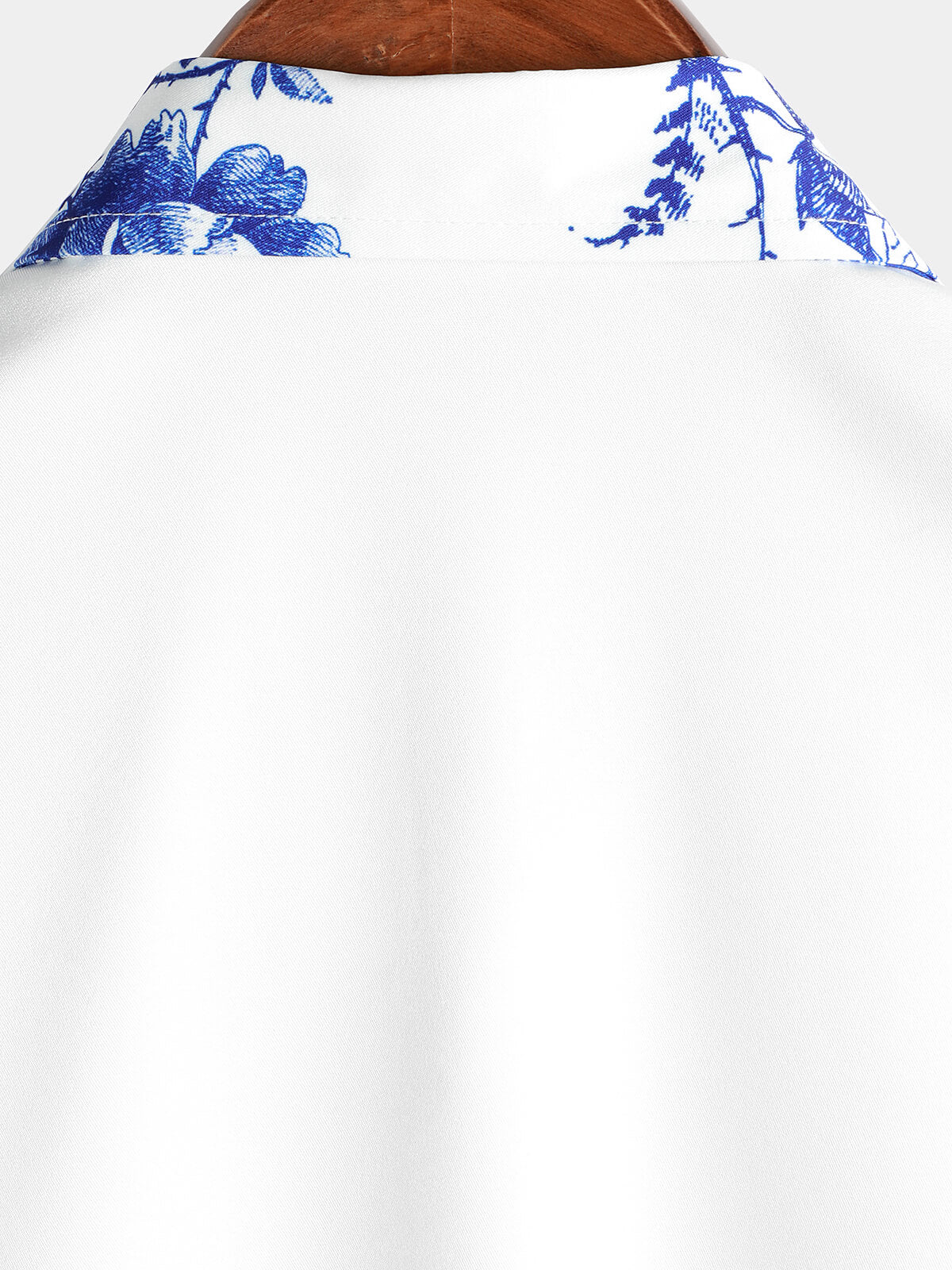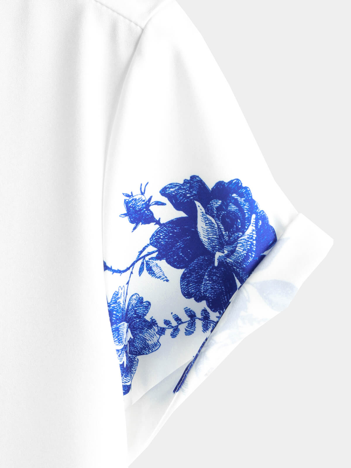 Men's Blue Floral Print Hawaiian Button Up Summer Beach Casual Collar Short Sleeve Shirt