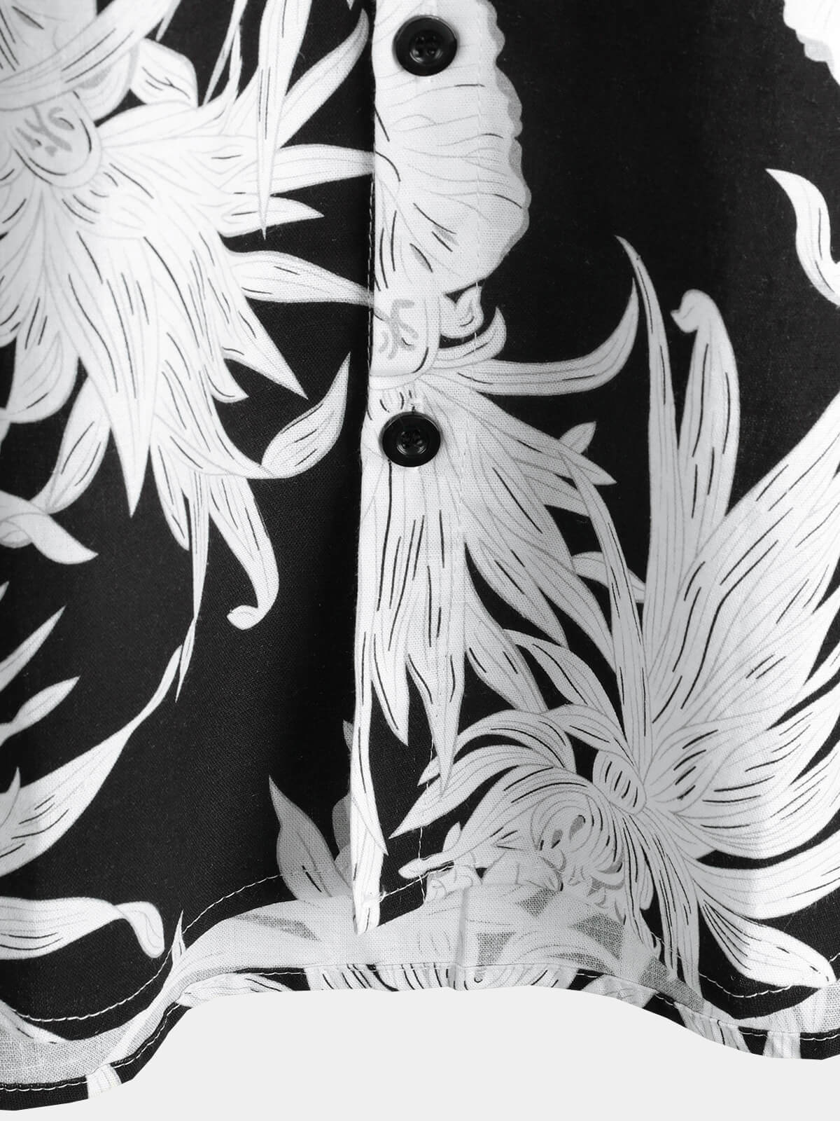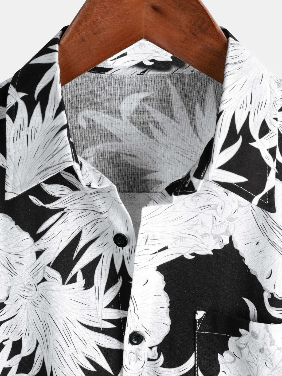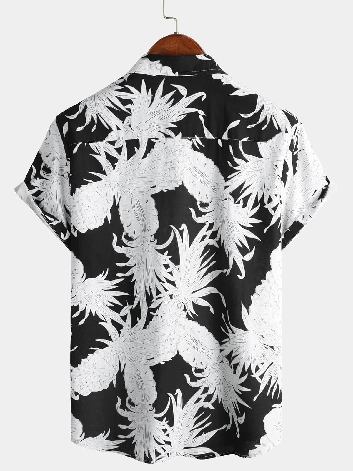 Men's Pineapple Print Cotton Linen Black and White Hawaiian Button Up Short Sleeve Shirt