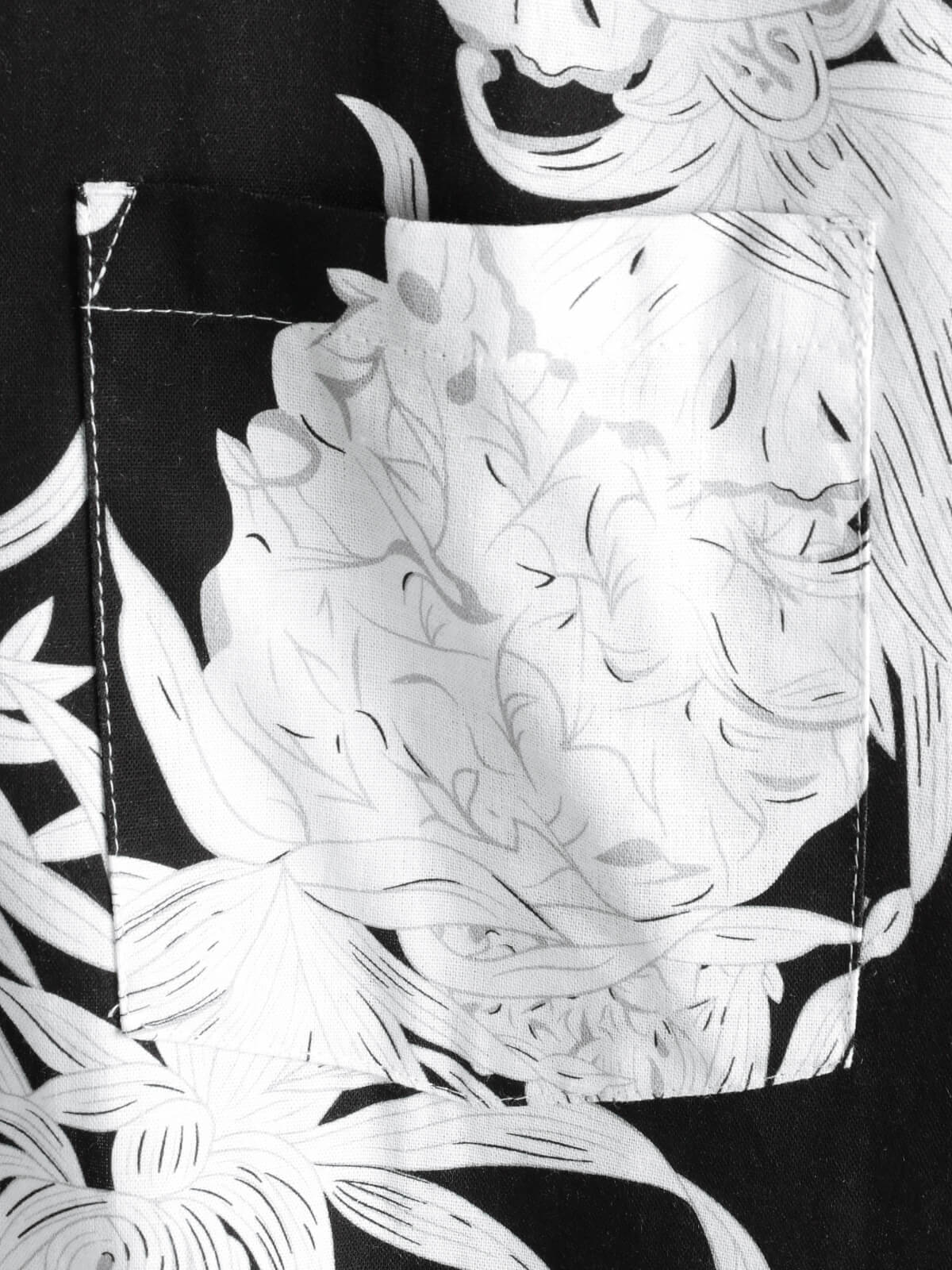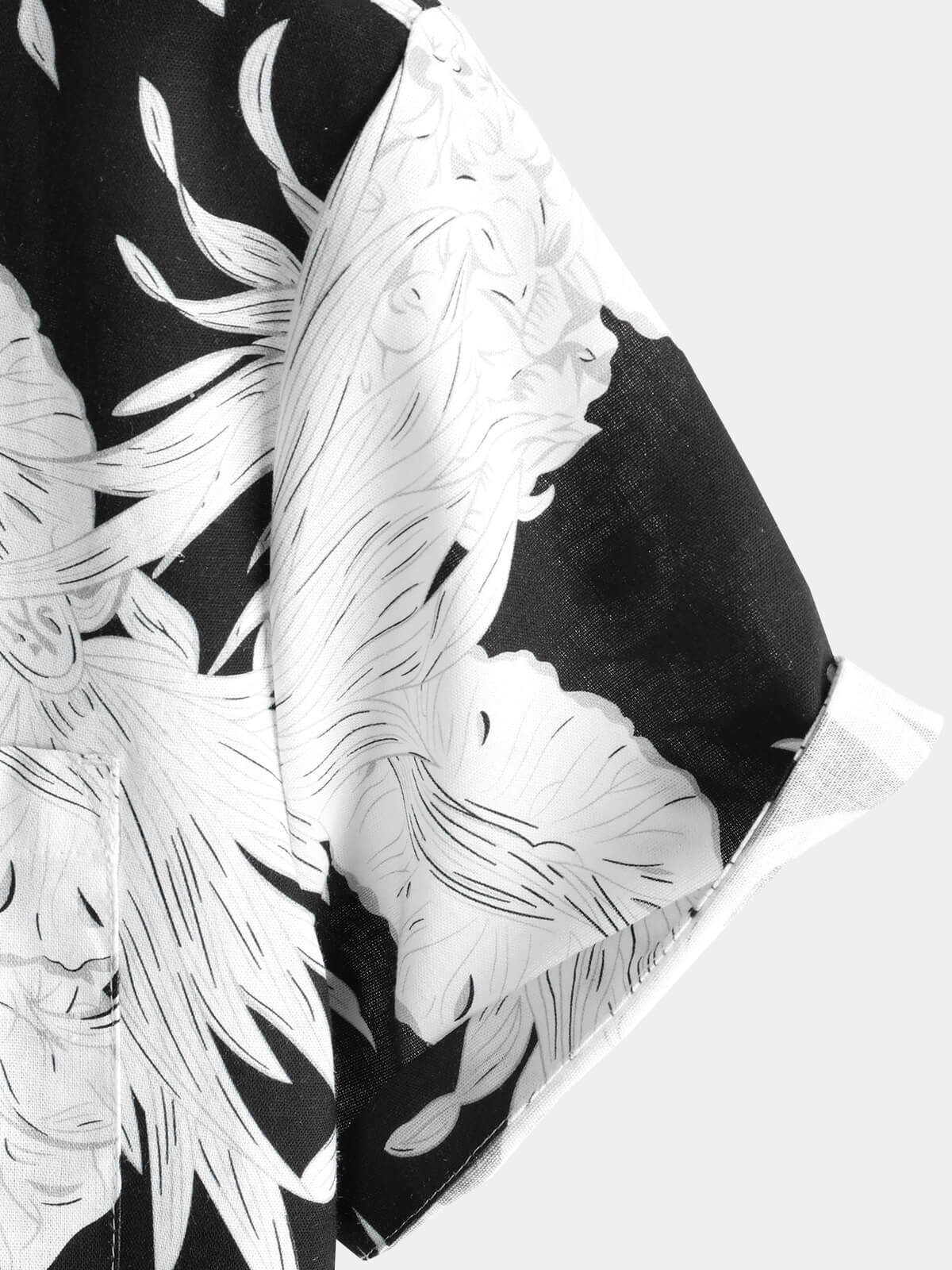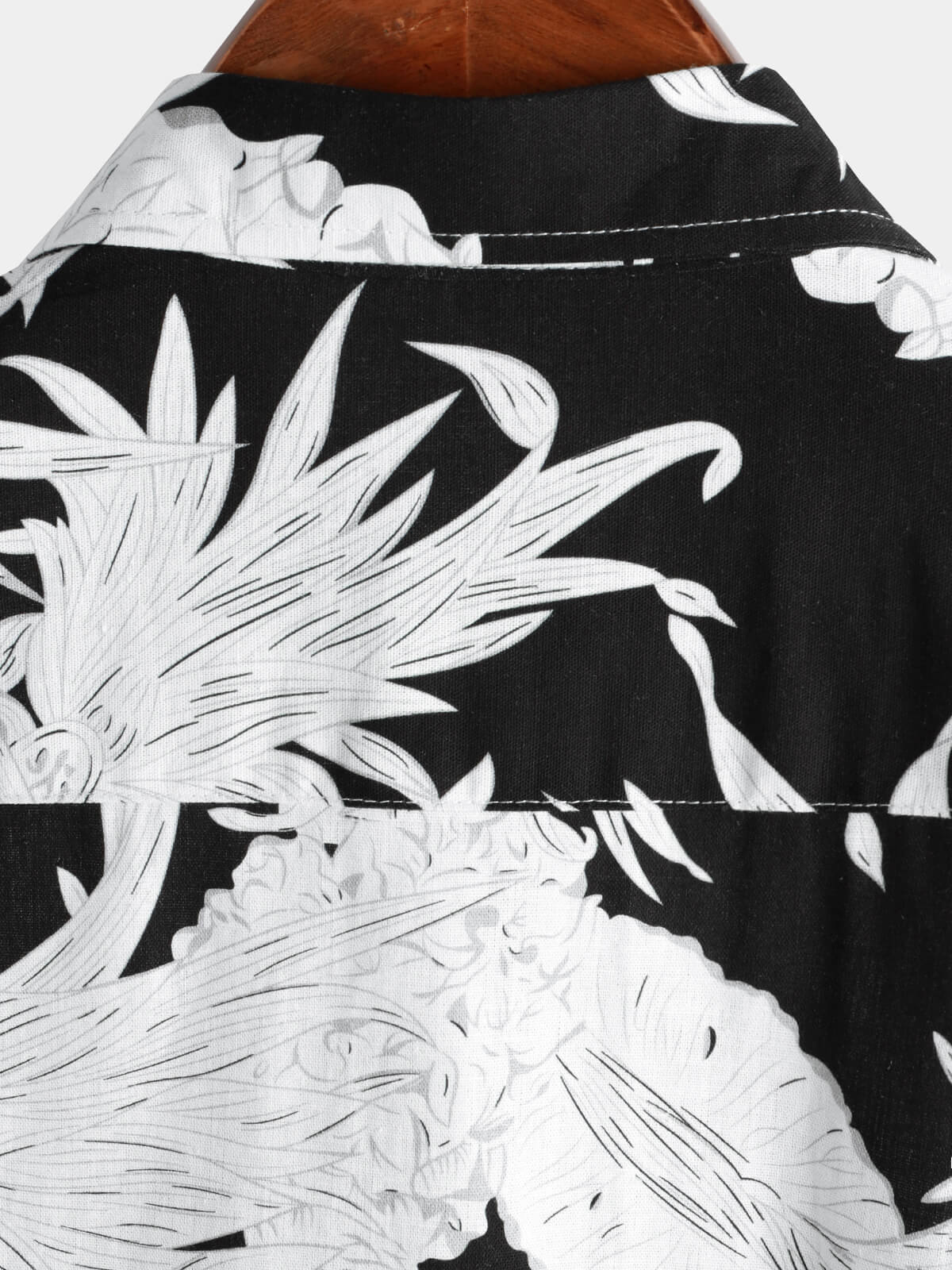Men's Pineapple Print Cotton Linen Black and White Hawaiian Button Up Short Sleeve Shirt