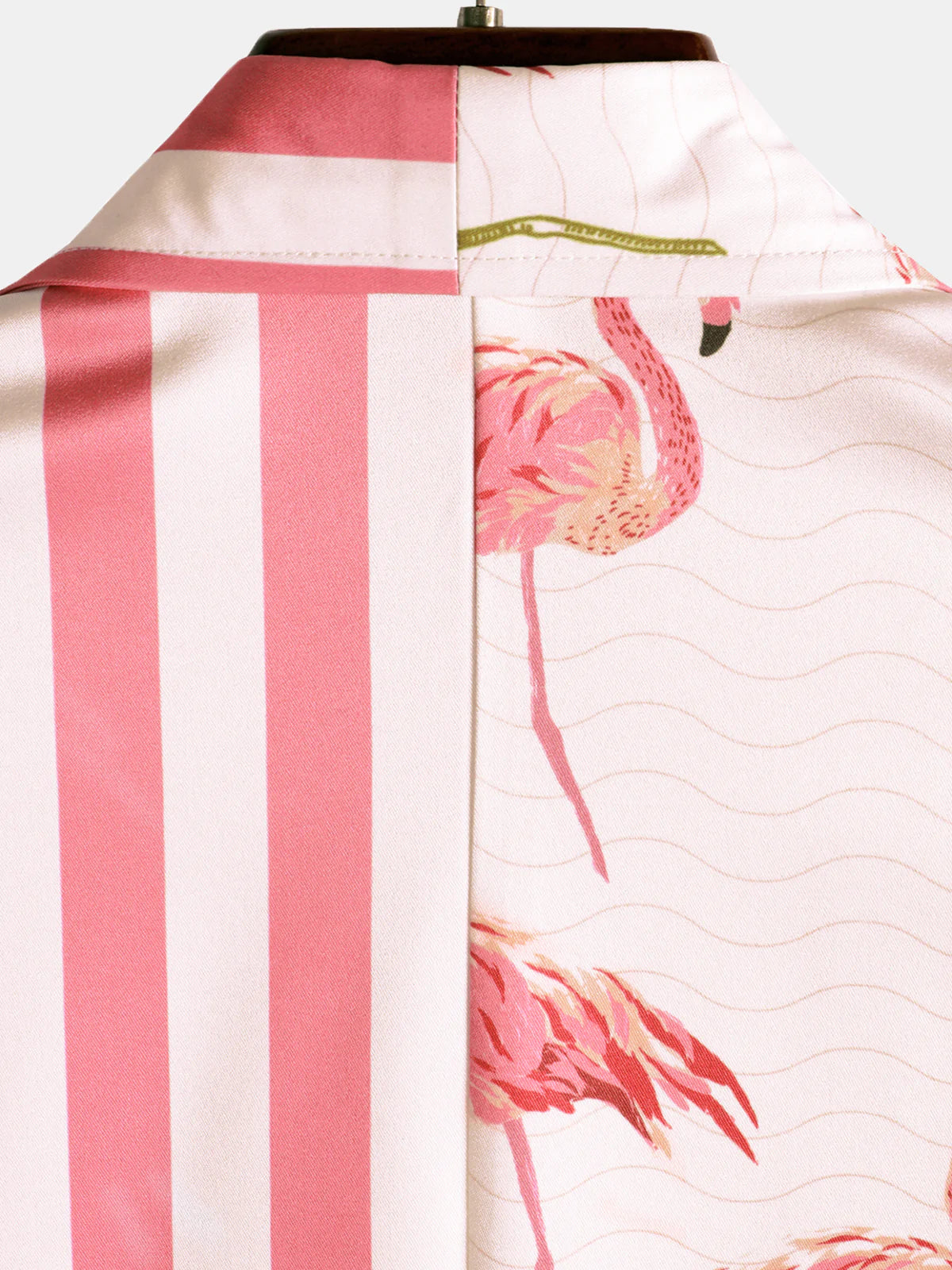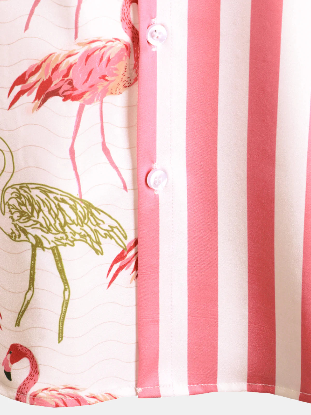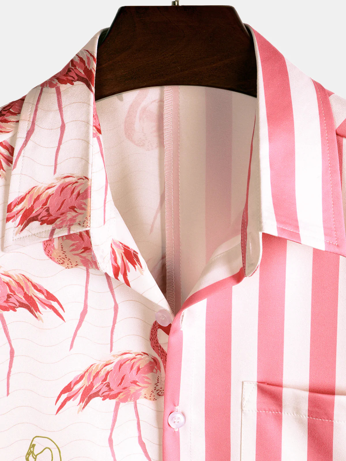 Men's Pink Flamingo Animal Striped Print Pocket Button Up Vacation Short Sleeve Beach Cruise Camp Shirt