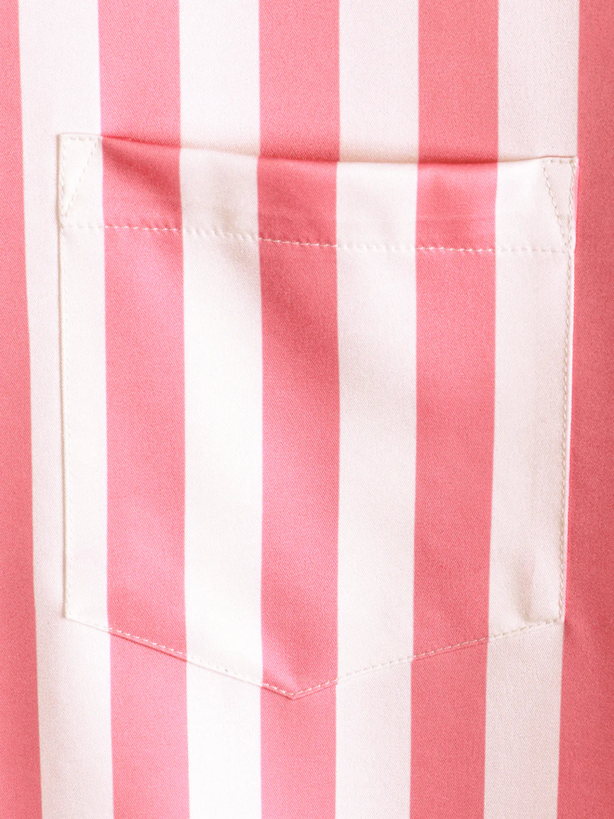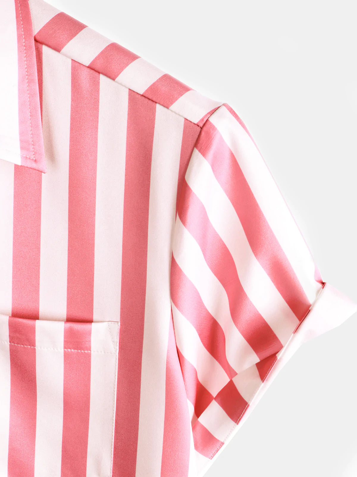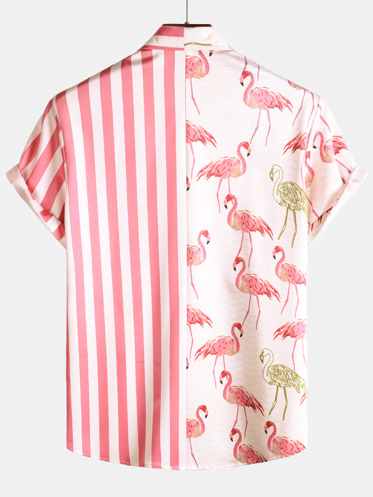 Men's Pink Flamingo Animal Striped Print Pocket Button Up Vacation Short Sleeve Beach Cruise Camp Shirt