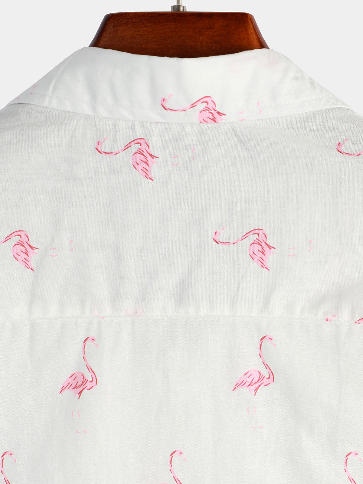 Men's Pink Flamingo Print Short Sleeve Button Up Shirt