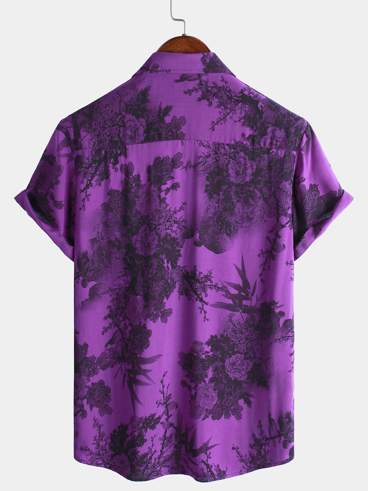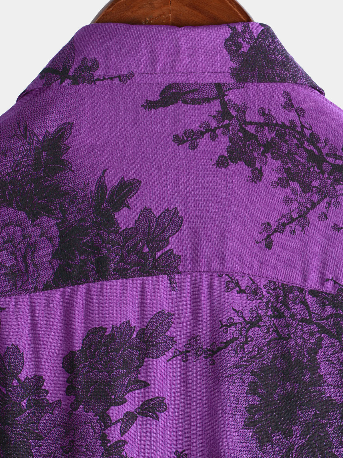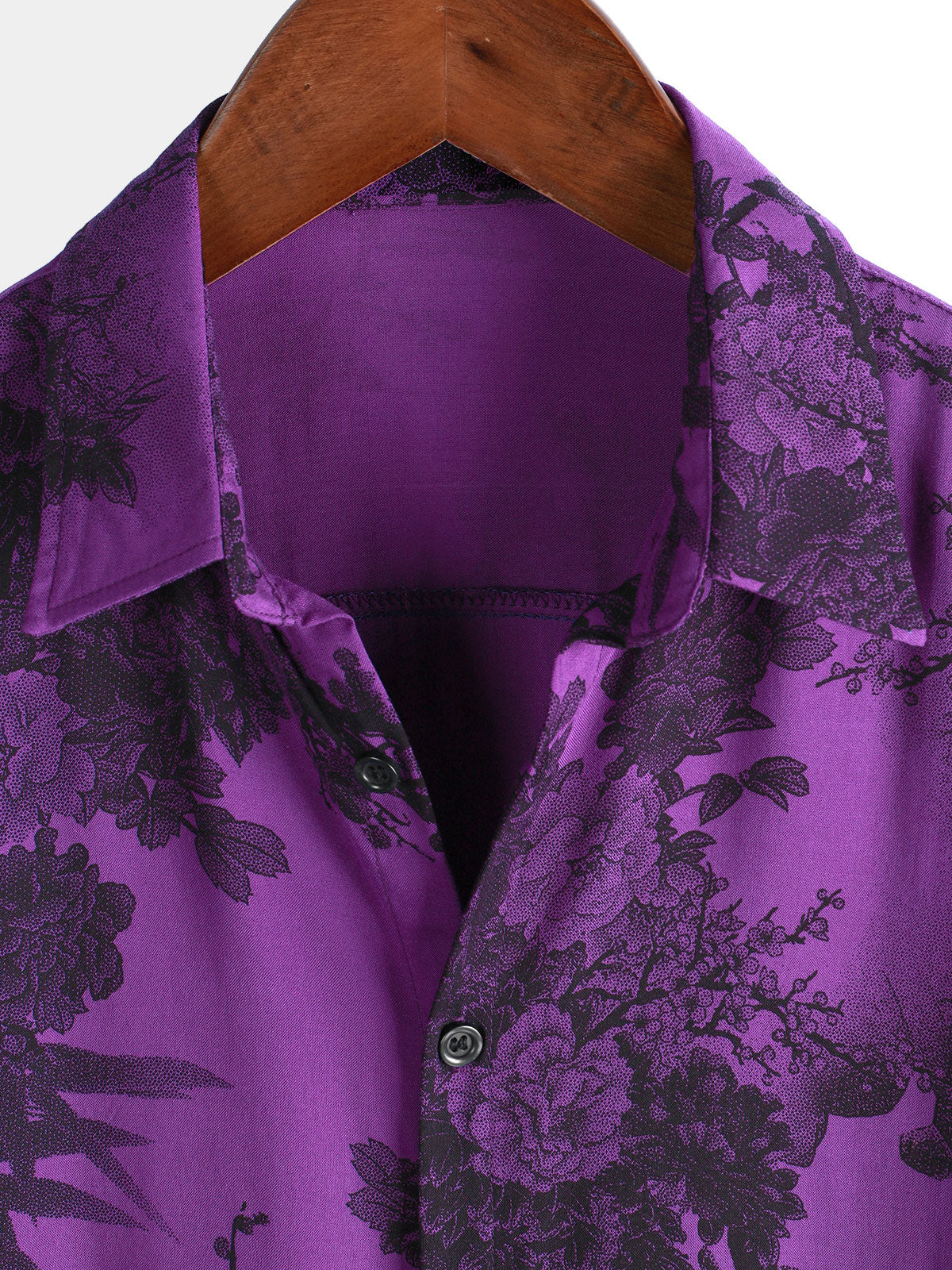 Men's Purple Retro Holiday Breathable Flower Hawaiian Short Sleeve Shirt