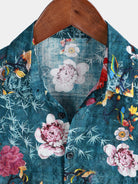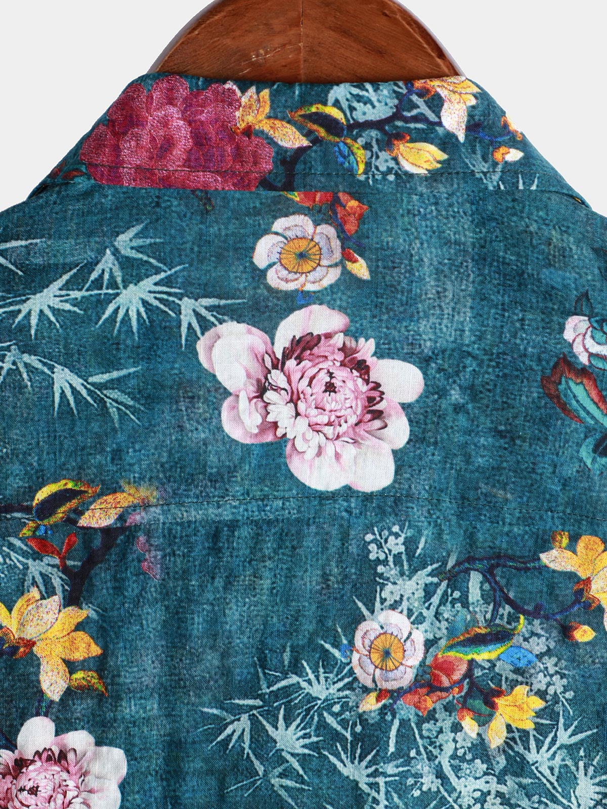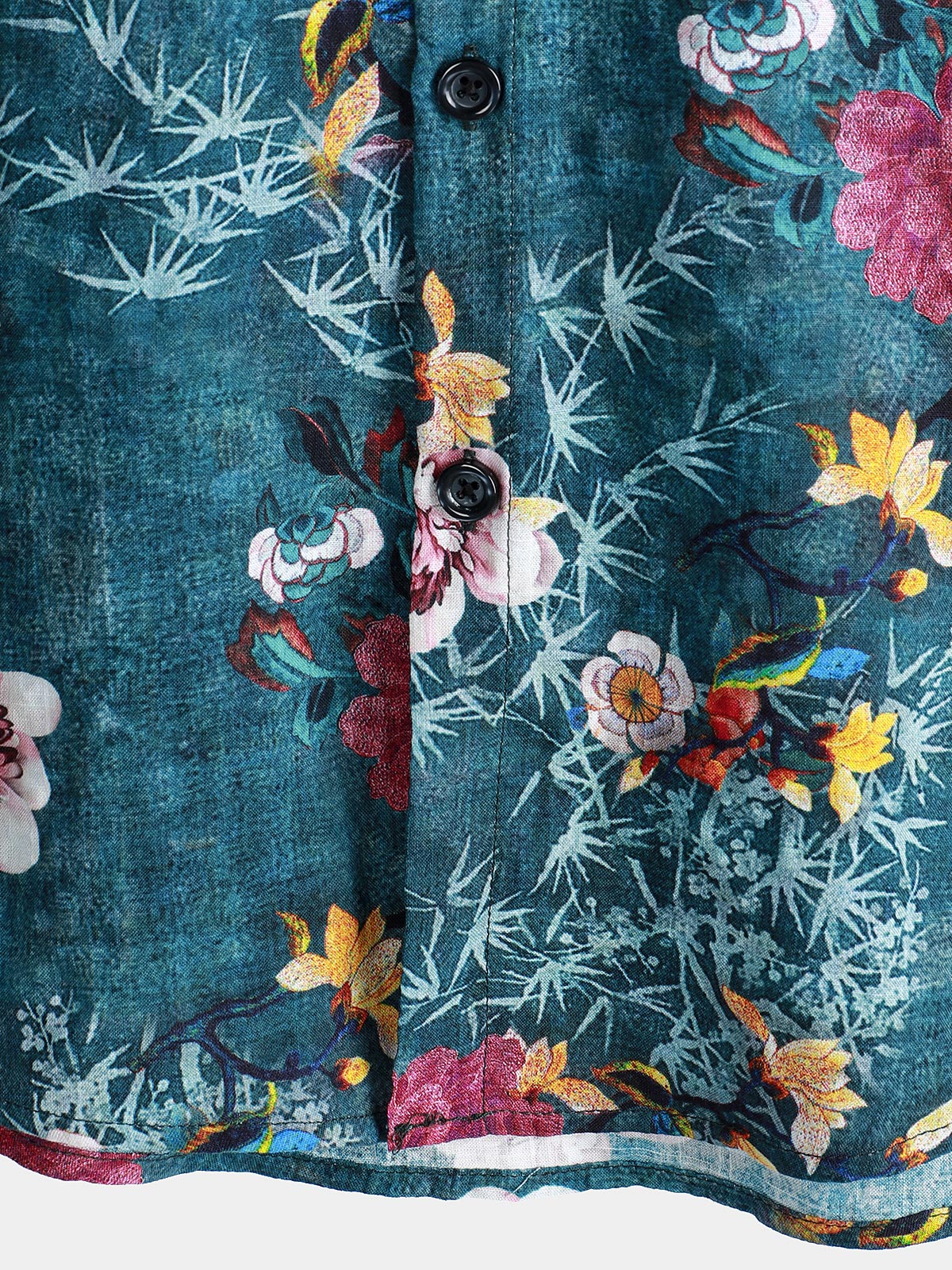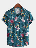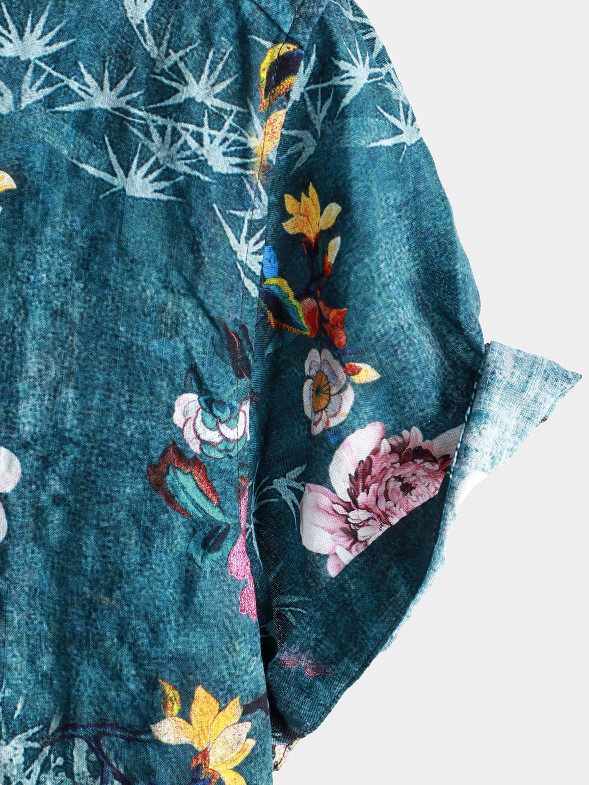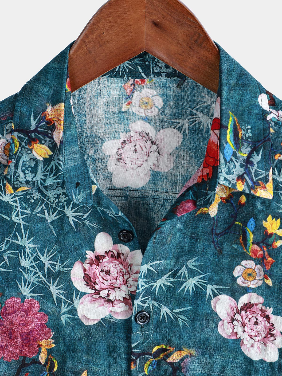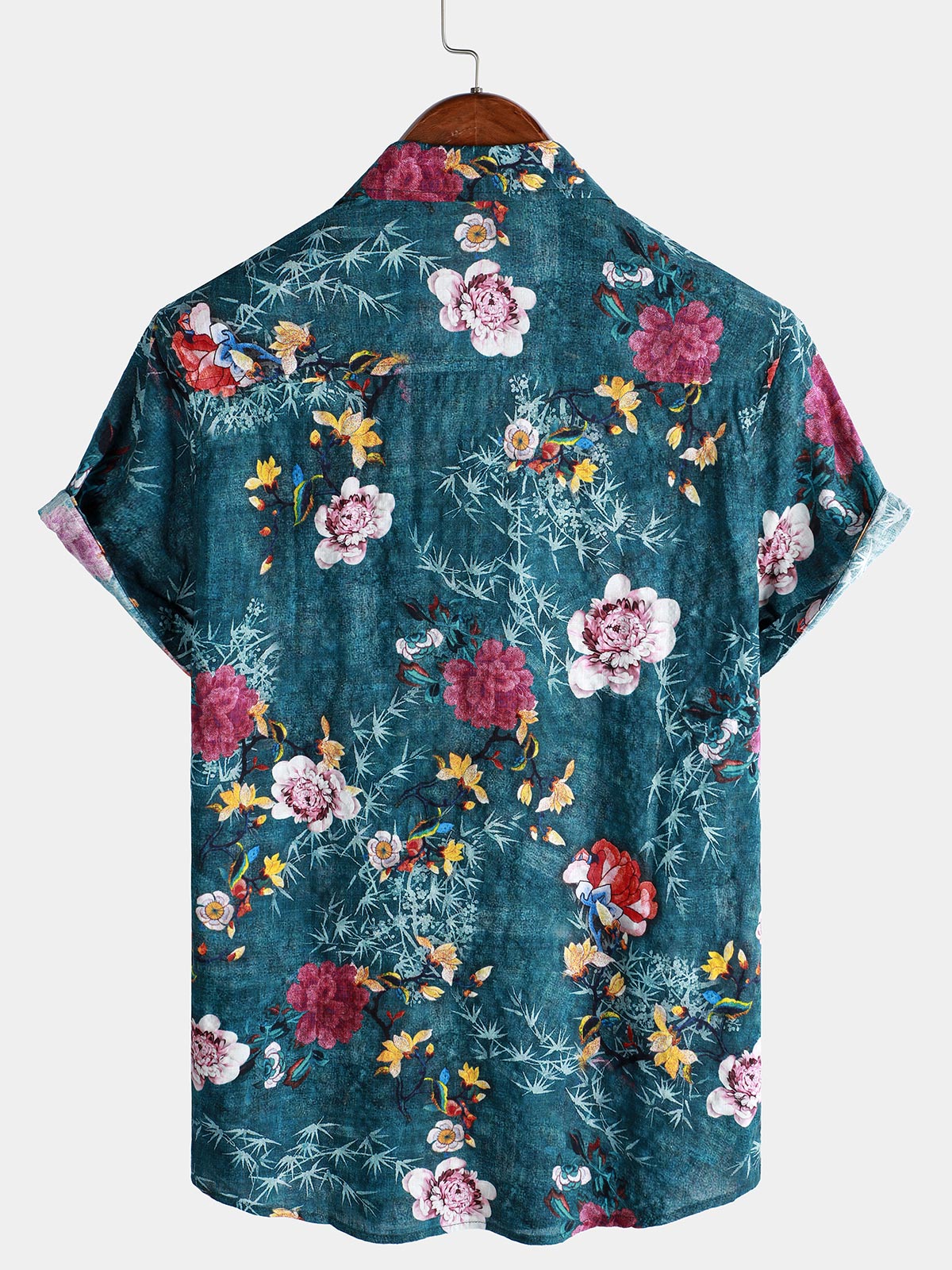 Men's Retro Floral Print Blue Short Sleeve Shirt