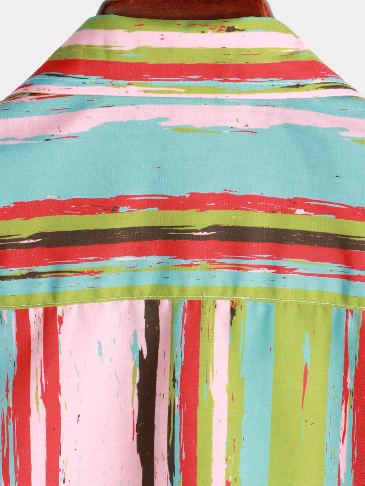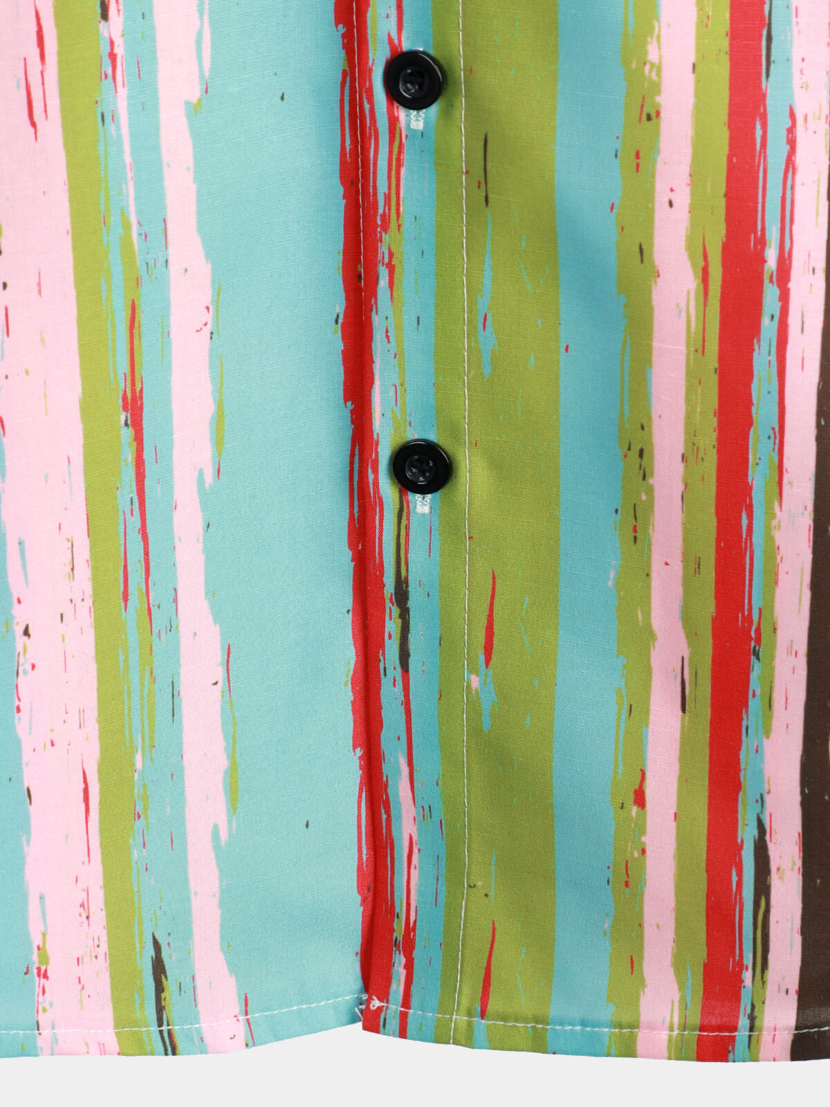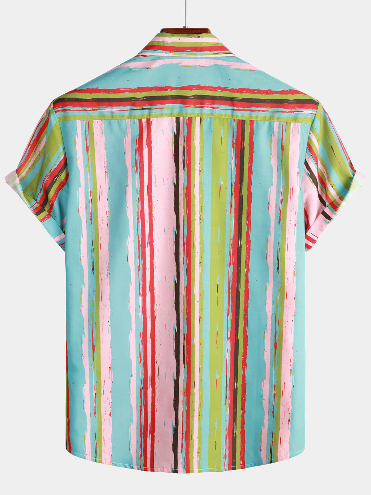 Men's Retro Green And Pink Striped Casual Summer Short Sleeve Shirt