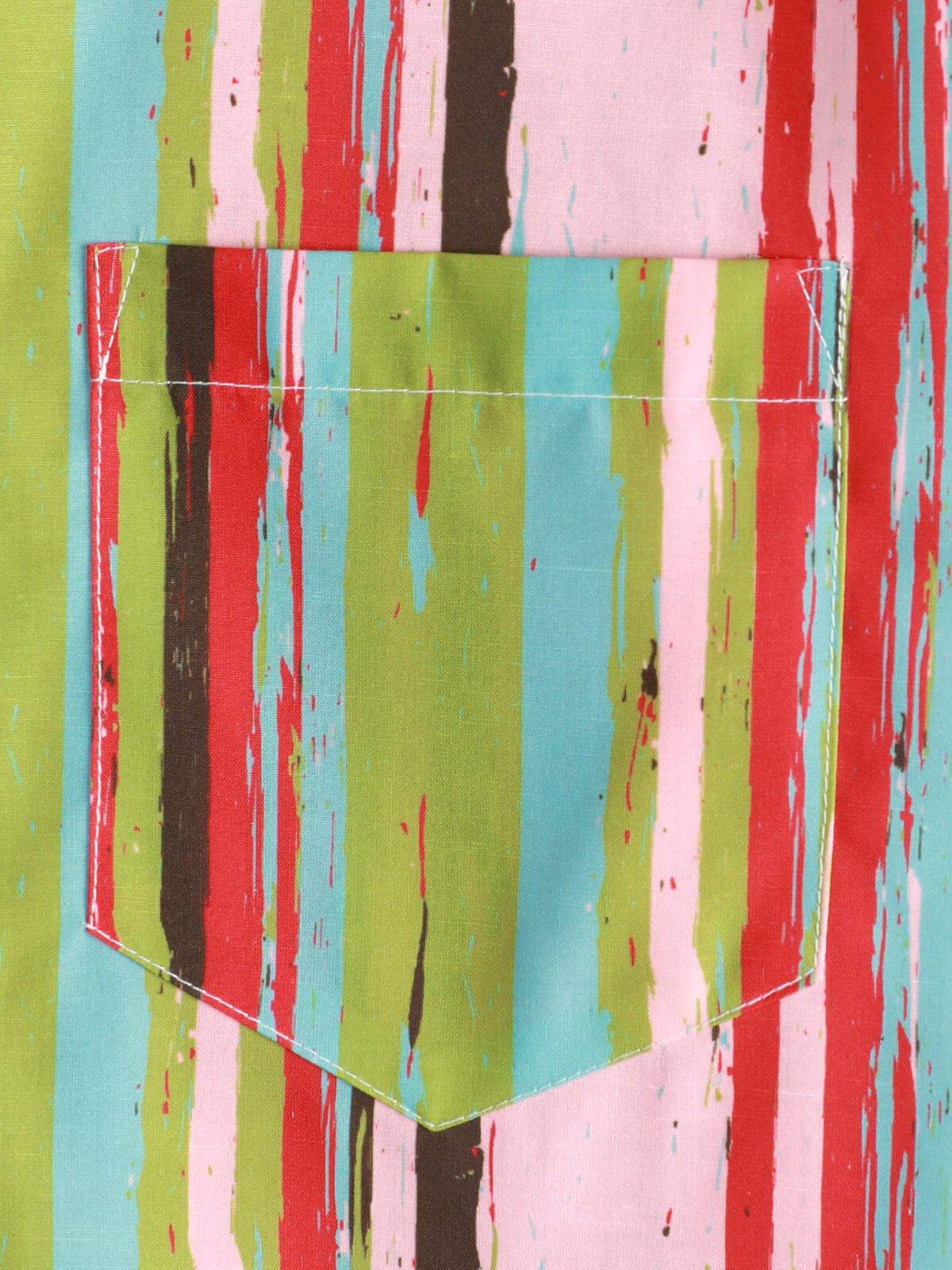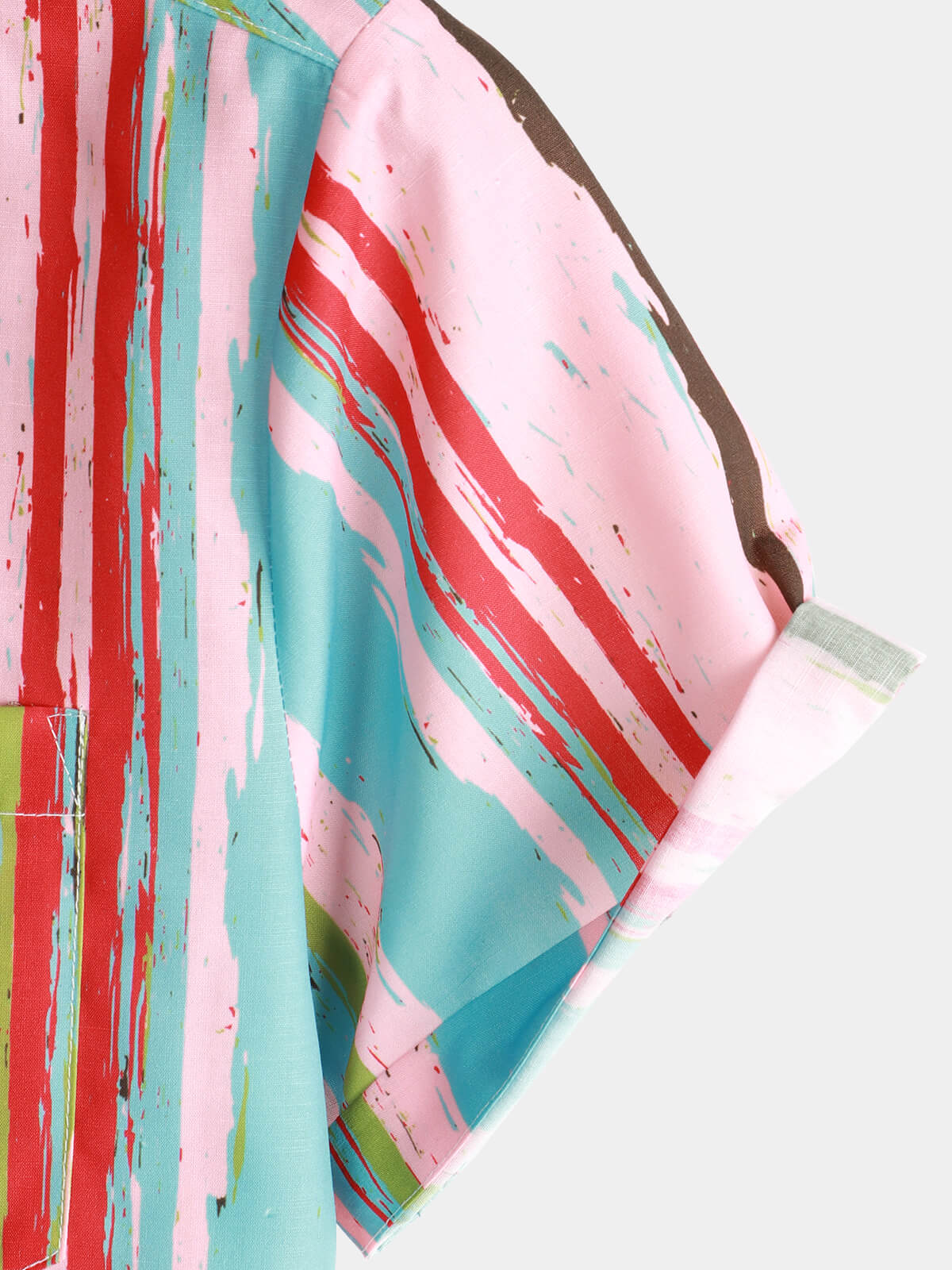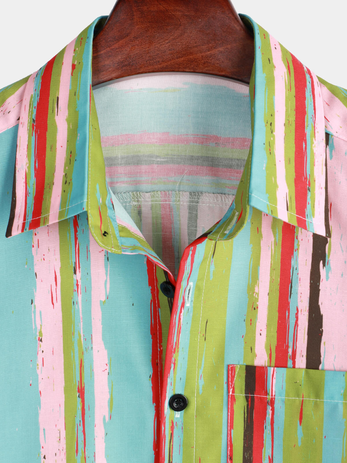 Men's Retro Green And Pink Striped Casual Summer Short Sleeve Shirt
