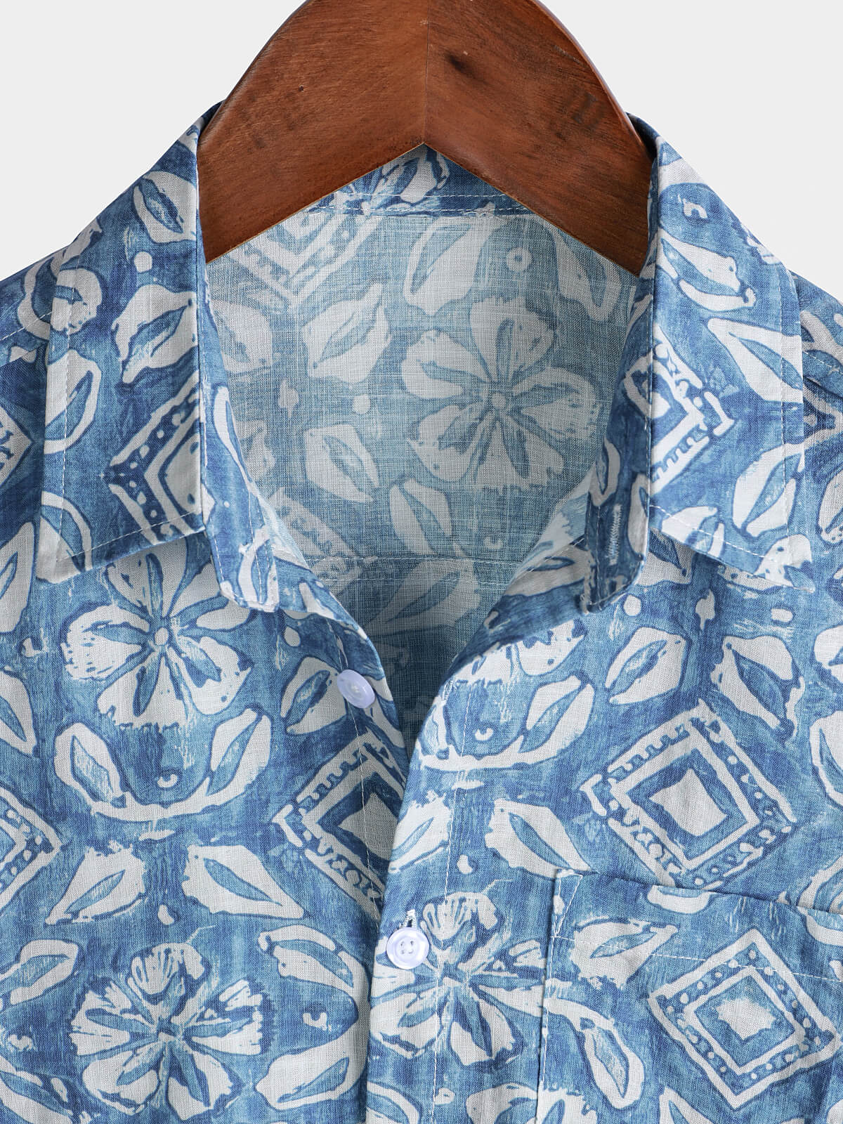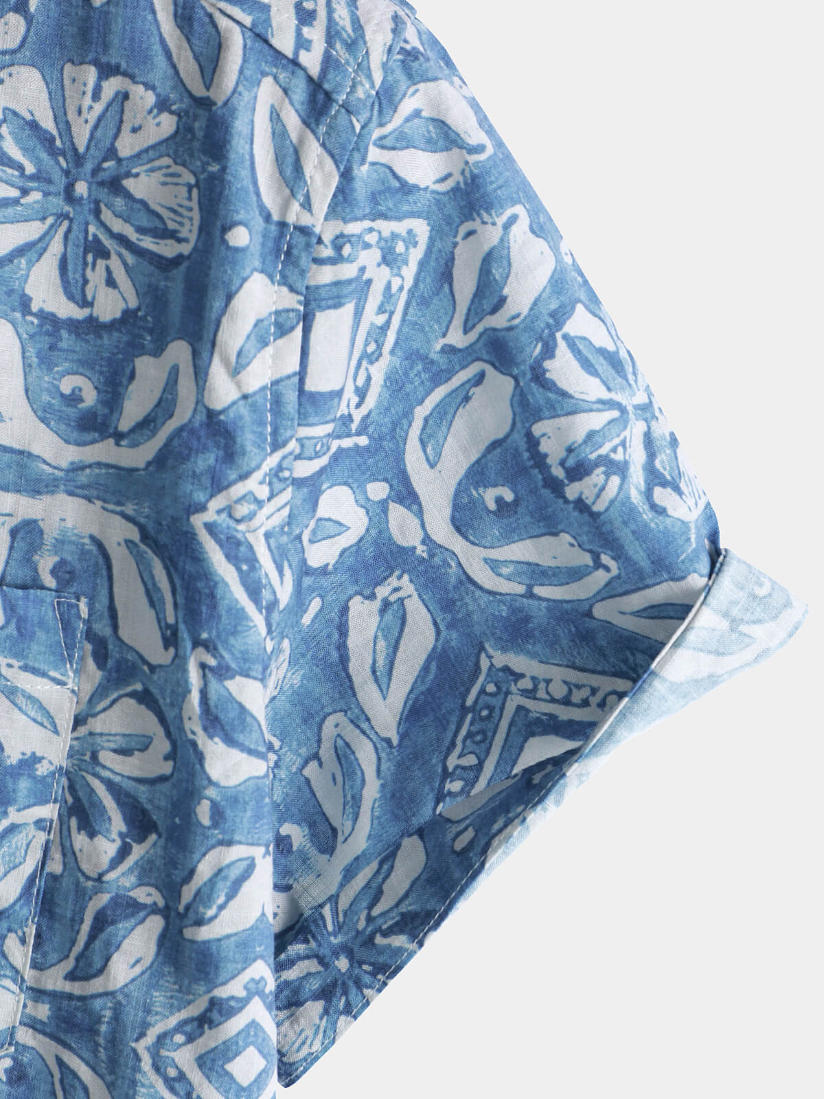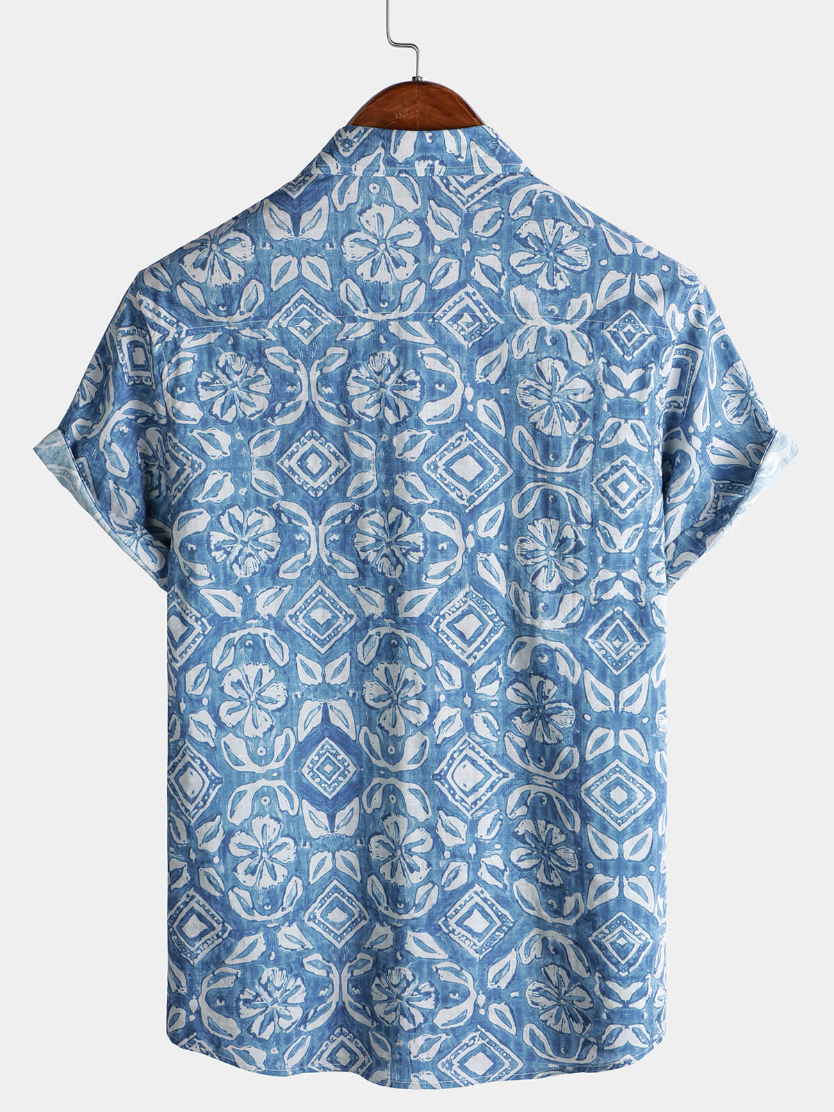 Men's Summer Floral Print Beach Blue Pocket Short Sleeve Shirt