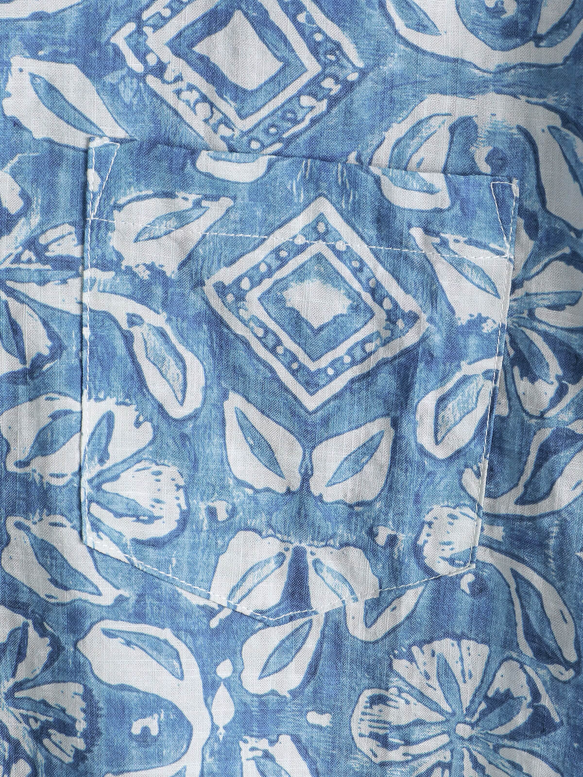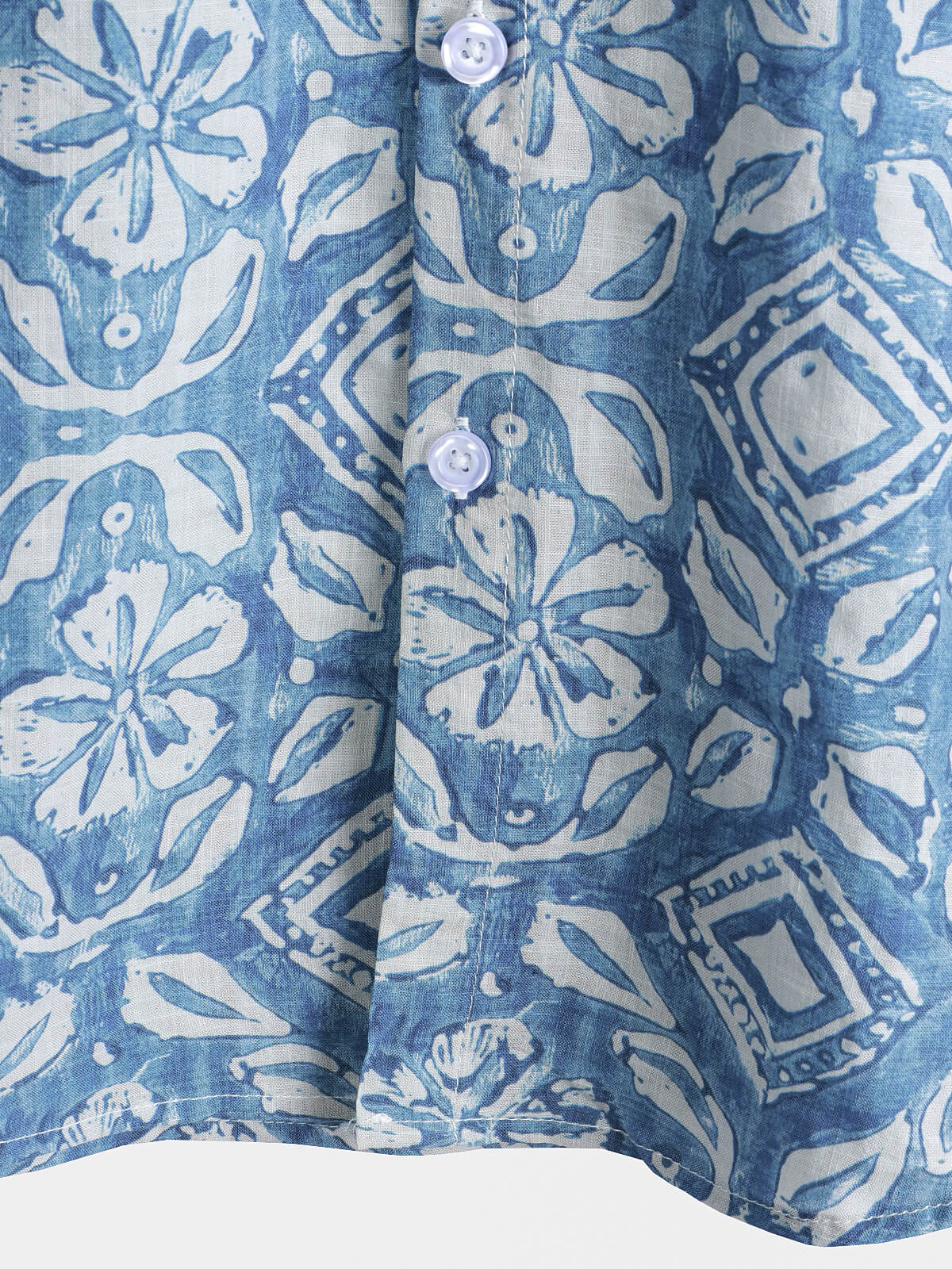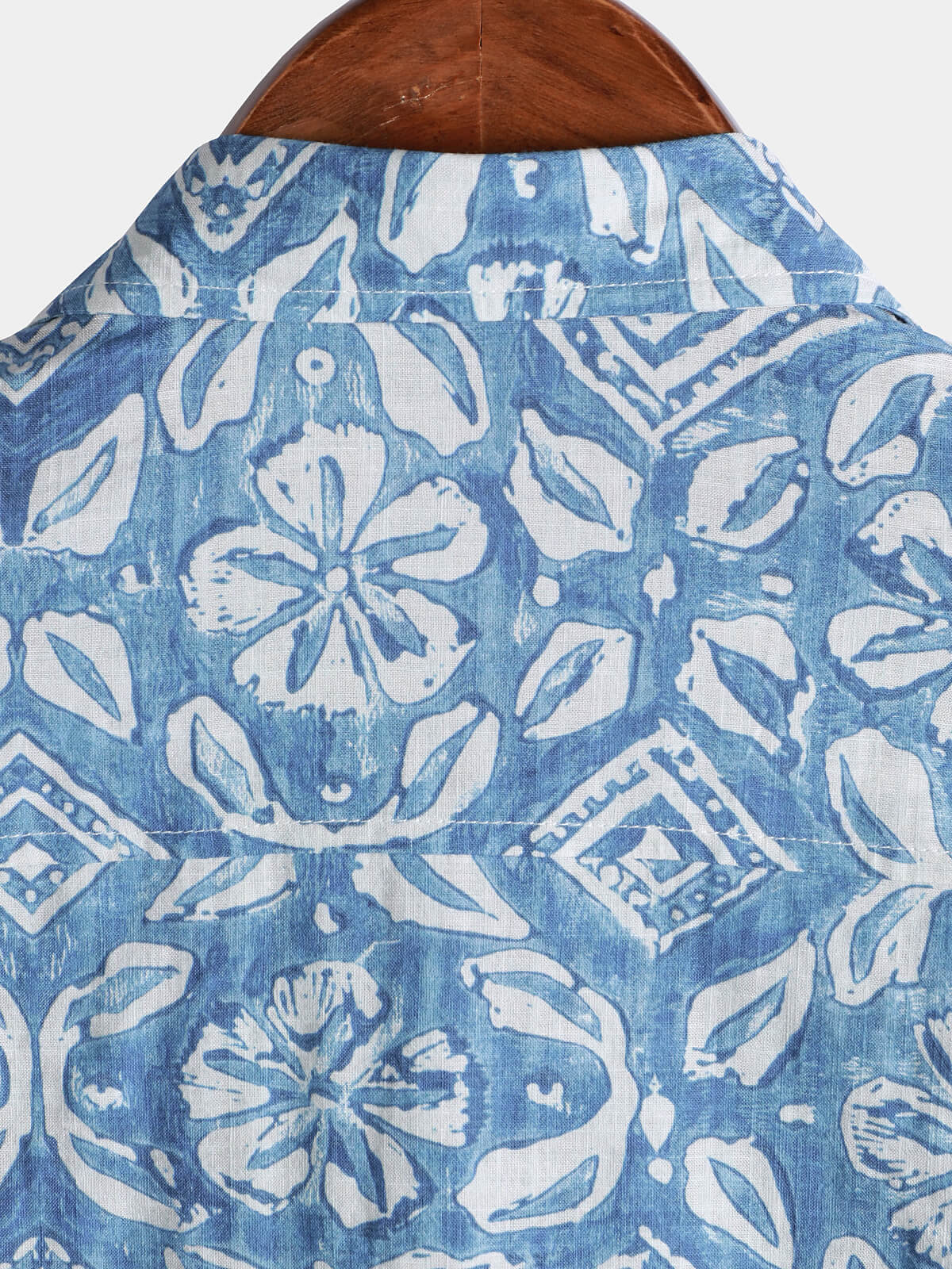 Men's Summer Floral Print Beach Blue Pocket Short Sleeve Shirt
