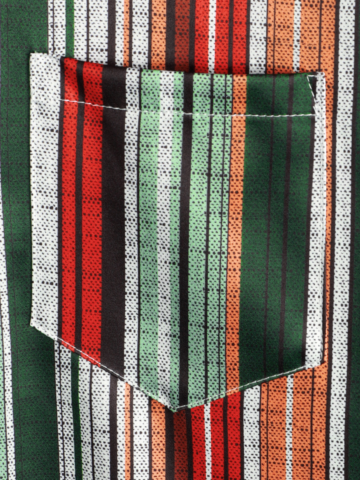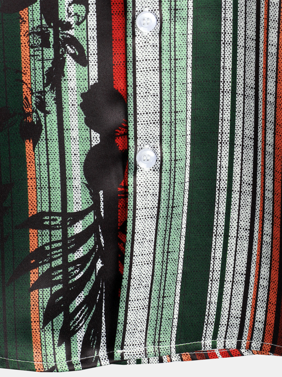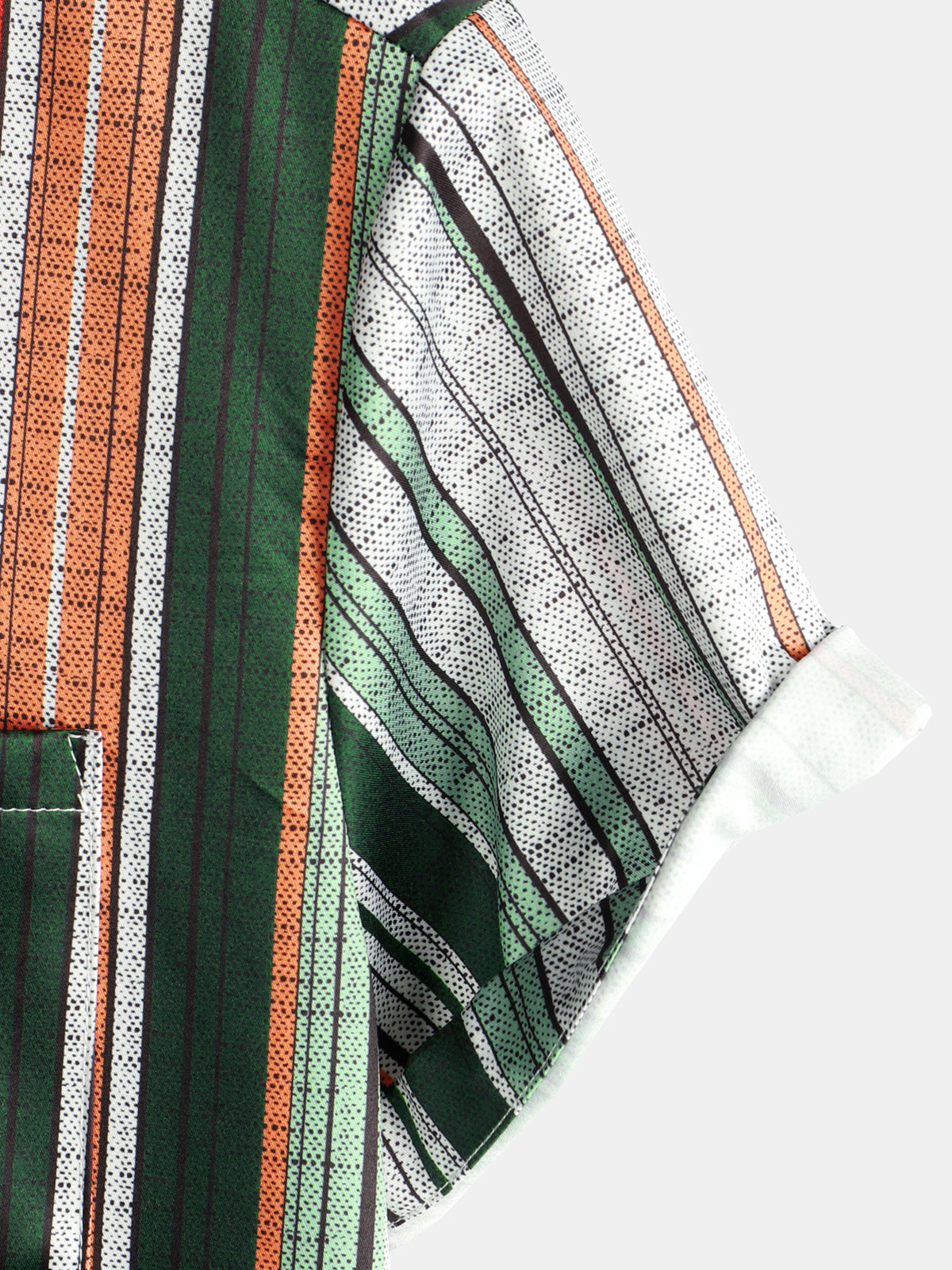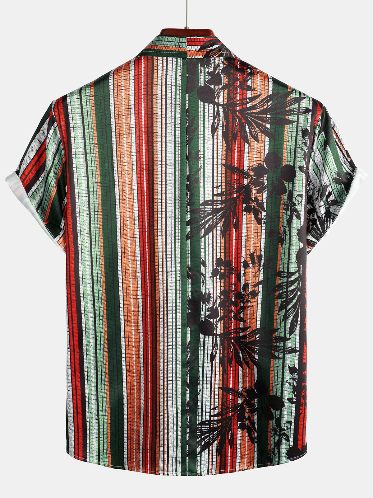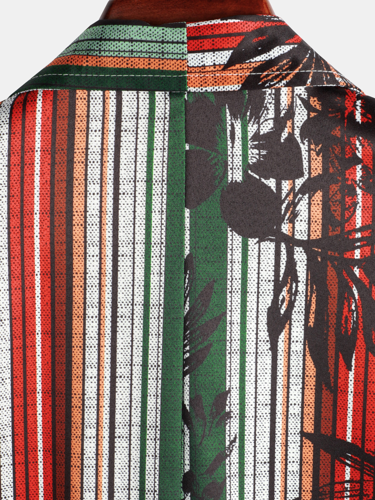 Men's Summer Tropical Print Striped Pocket Hawaiian Beach Short Sleeve Shirt