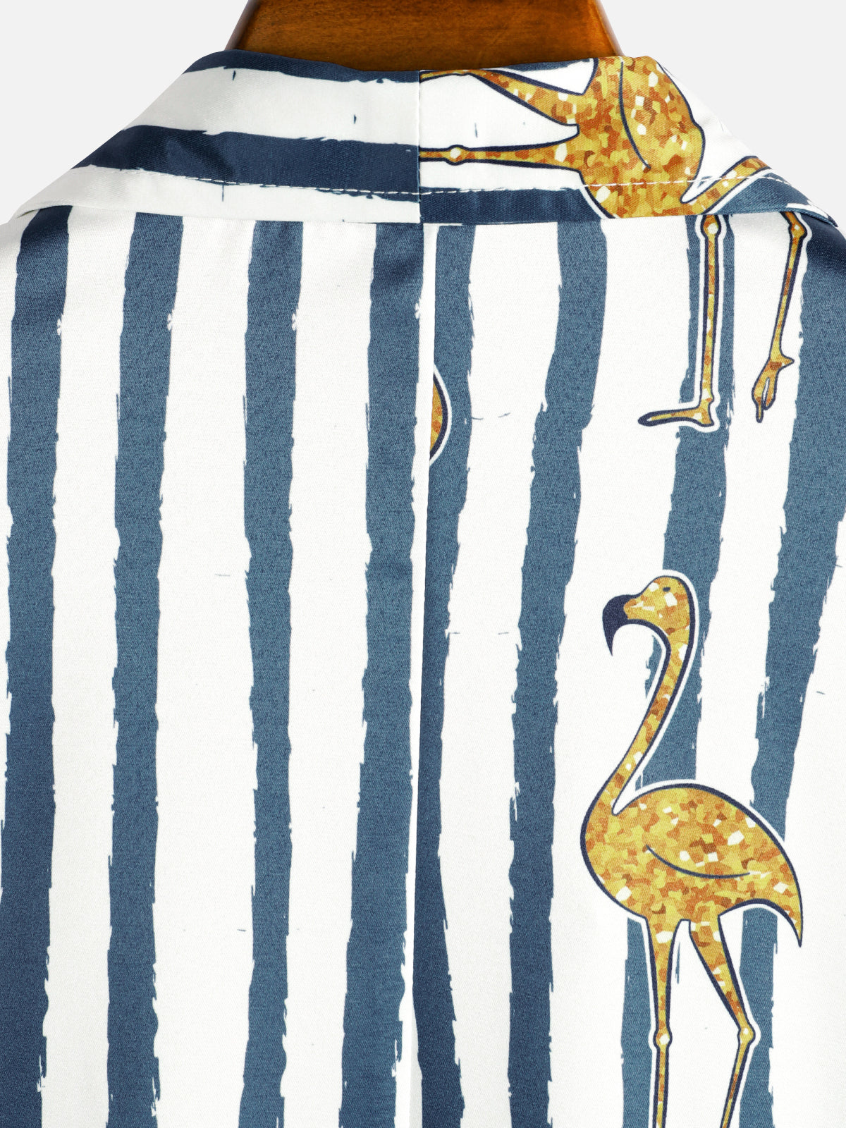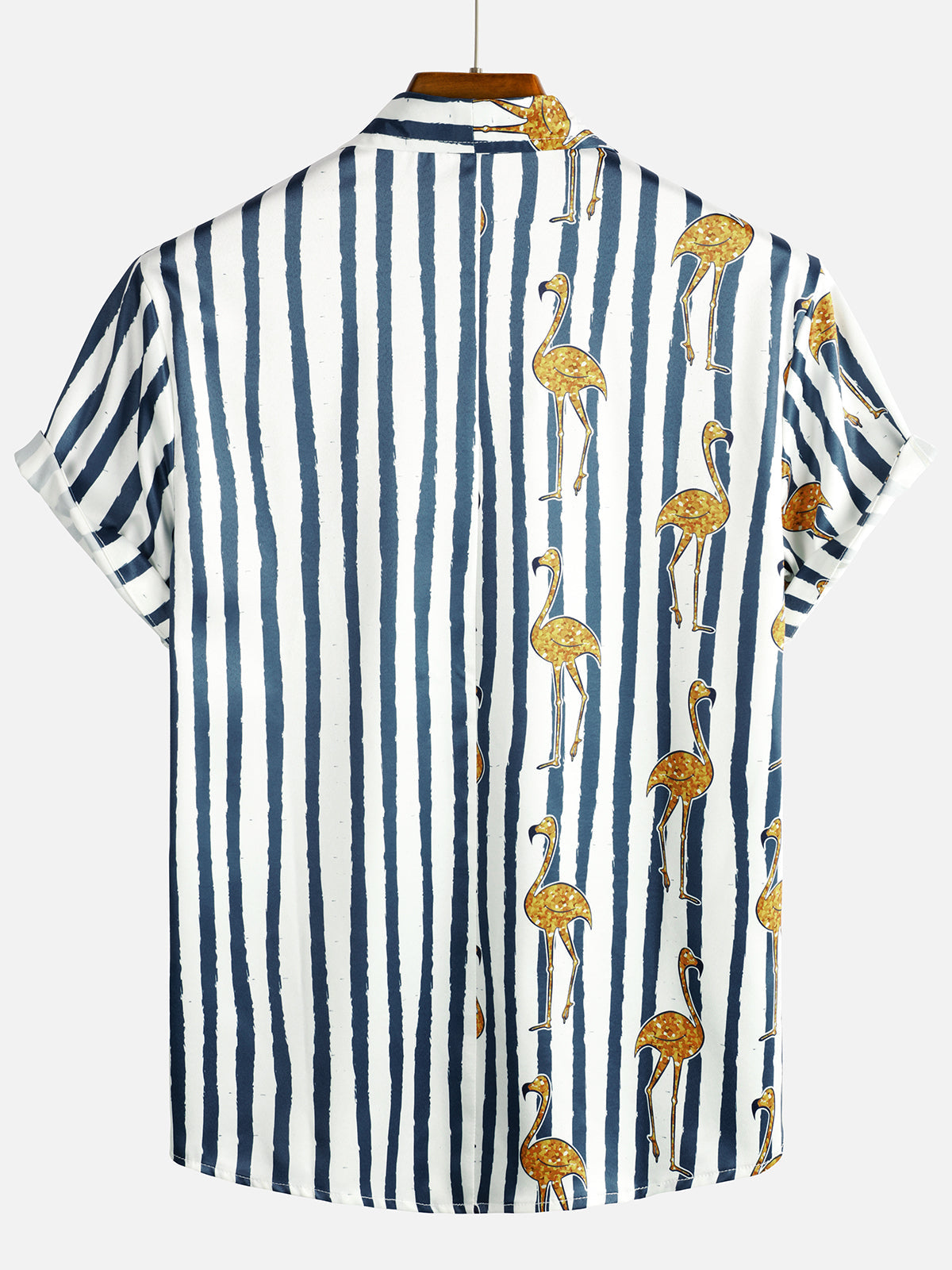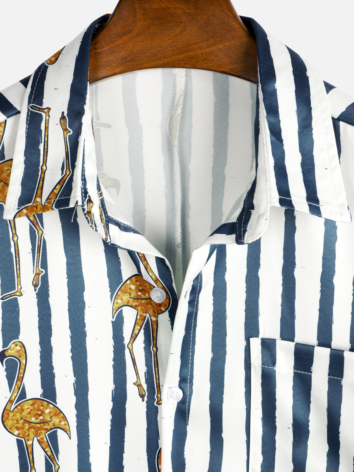 Men's Tropical Flamingo Navy Blue Striped Print Pocket Hawaiian Short Sleeve Shirt