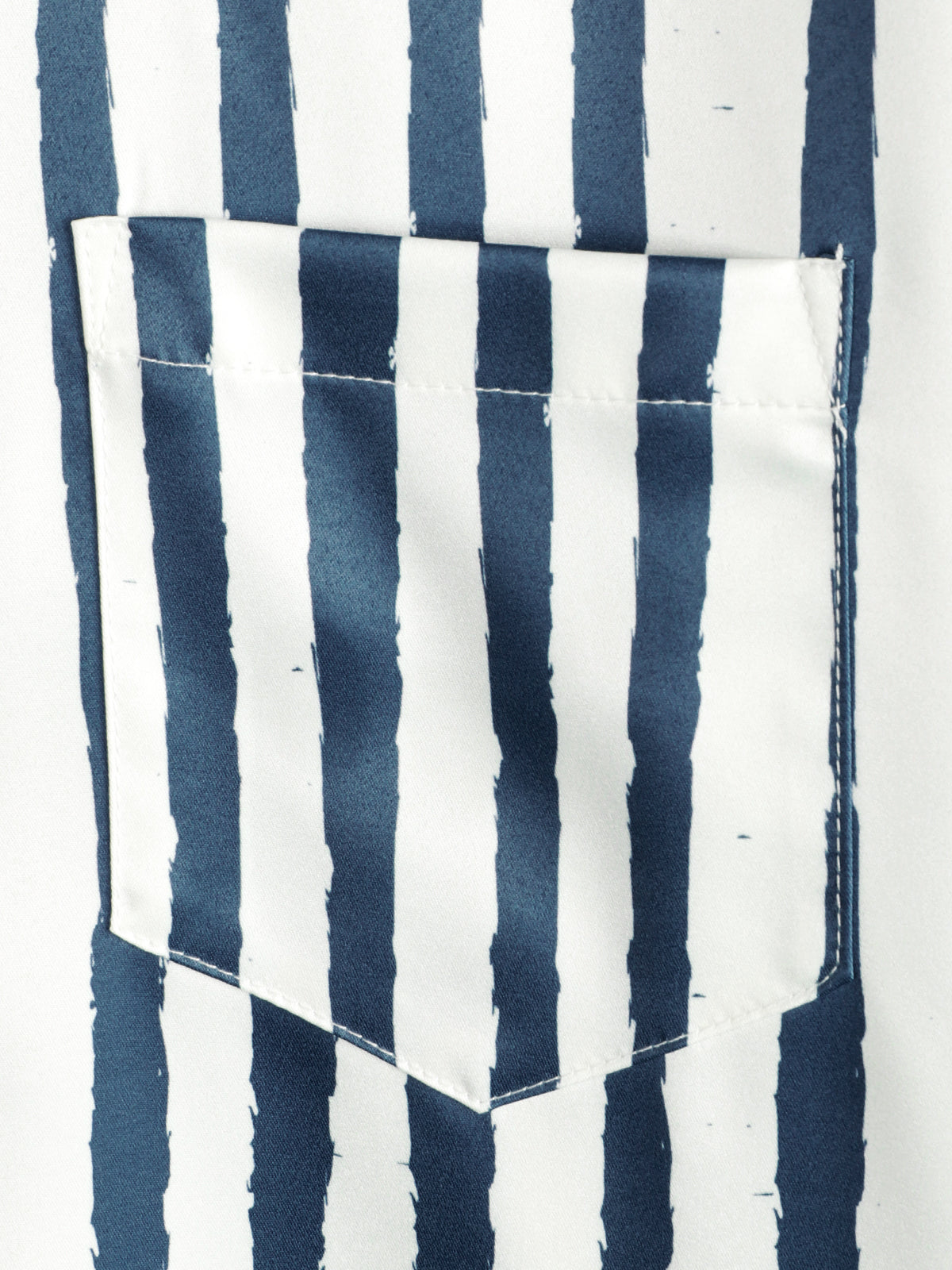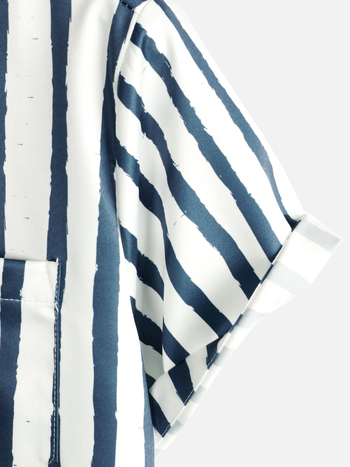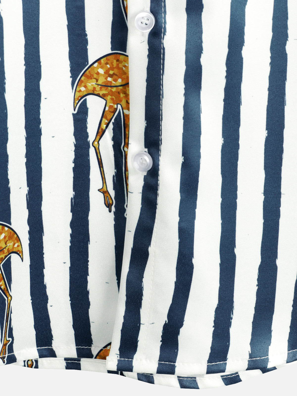 Men's Tropical Flamingo Navy Blue Striped Print Pocket Hawaiian Short Sleeve Shirt