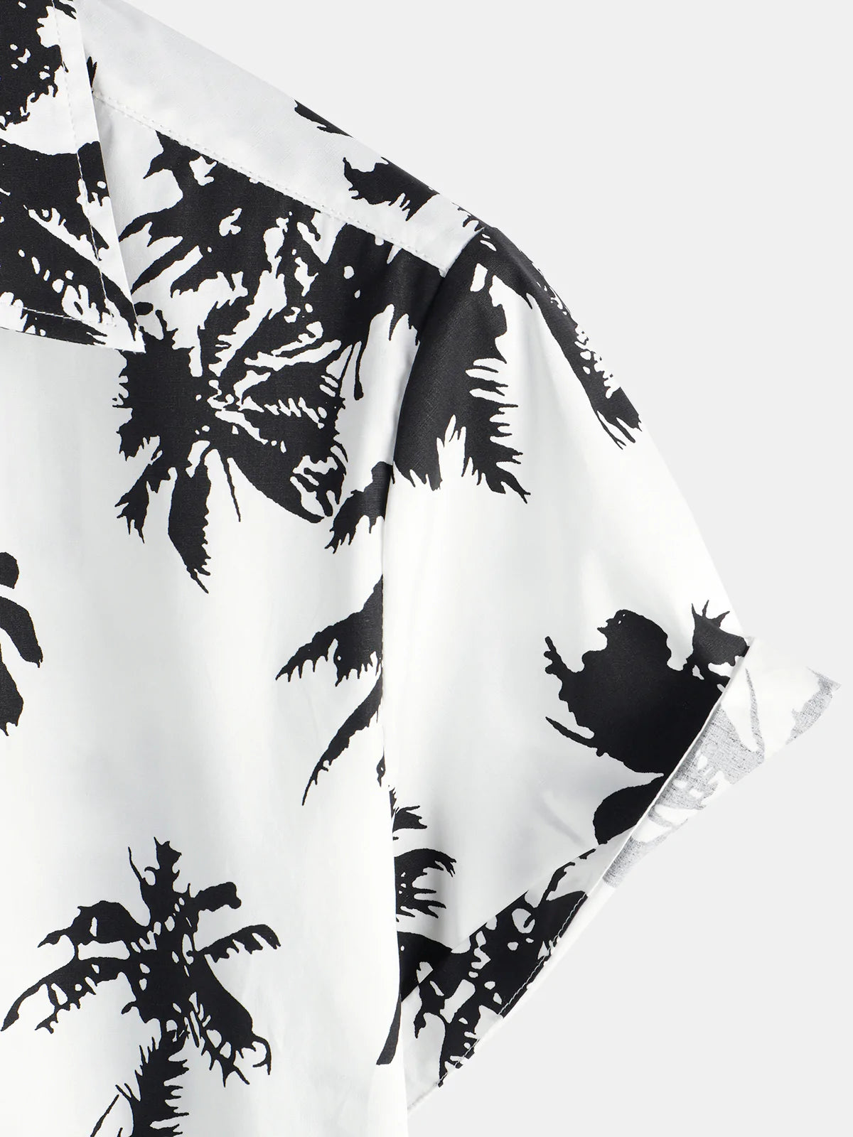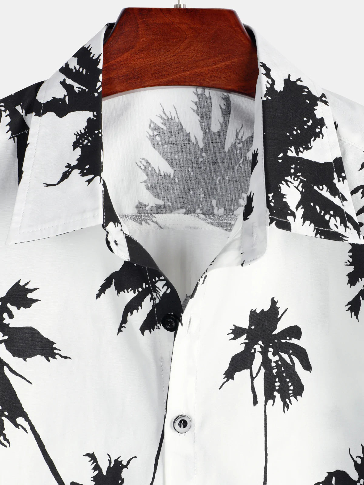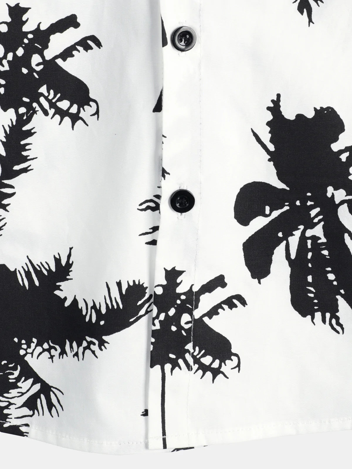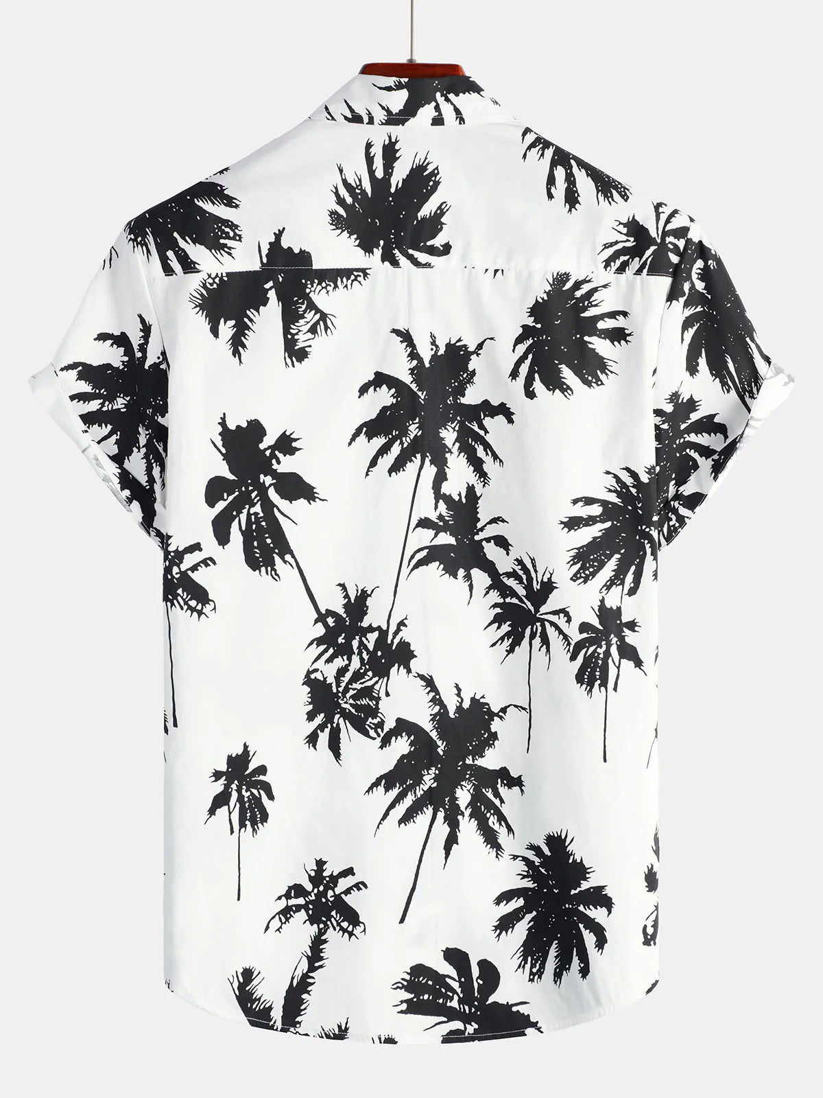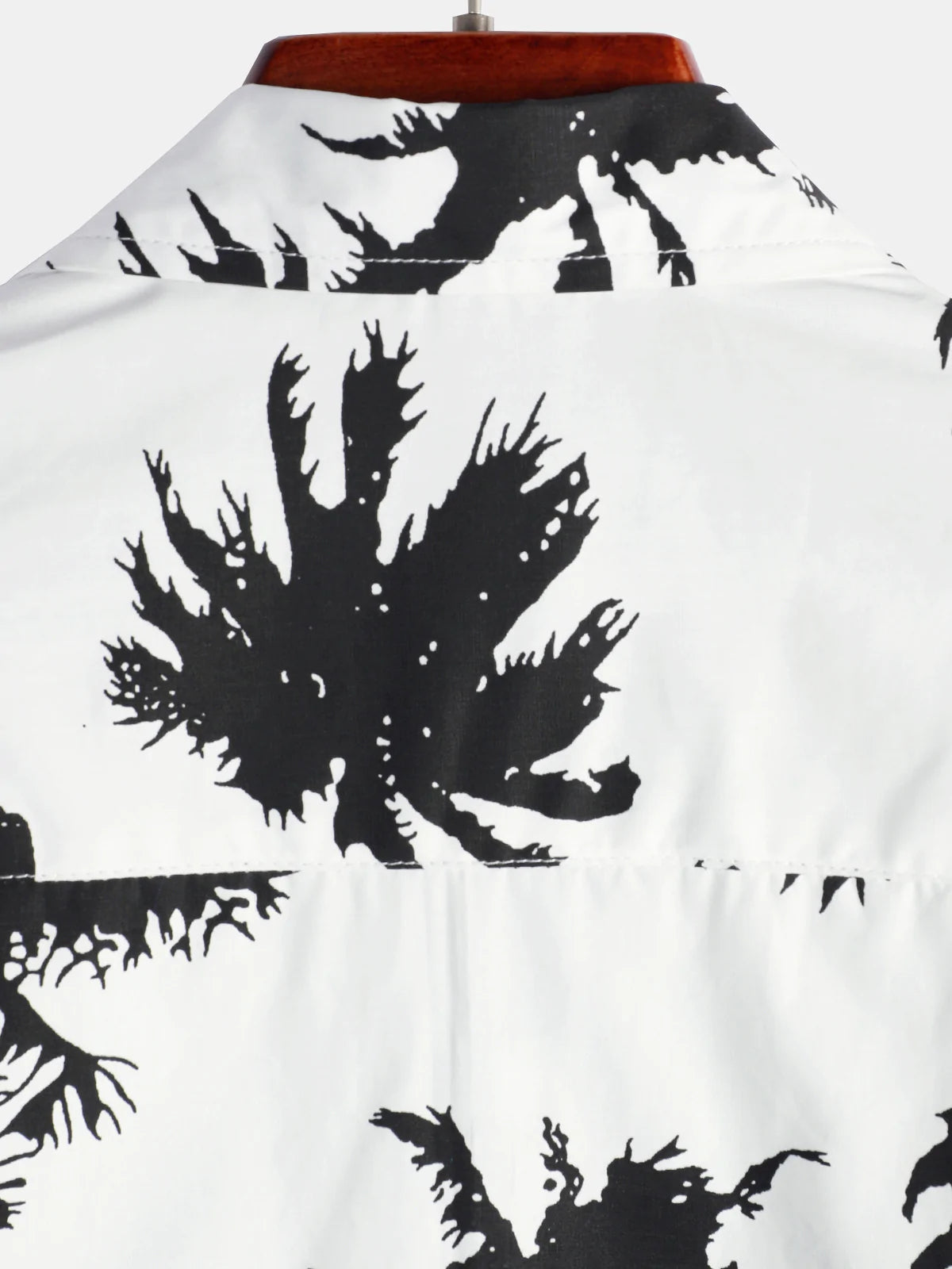 Men's Tropical Palm Tree Print Cotton White Hawaiian Short Sleeve Summer Beach Cruise Camp Shirt
