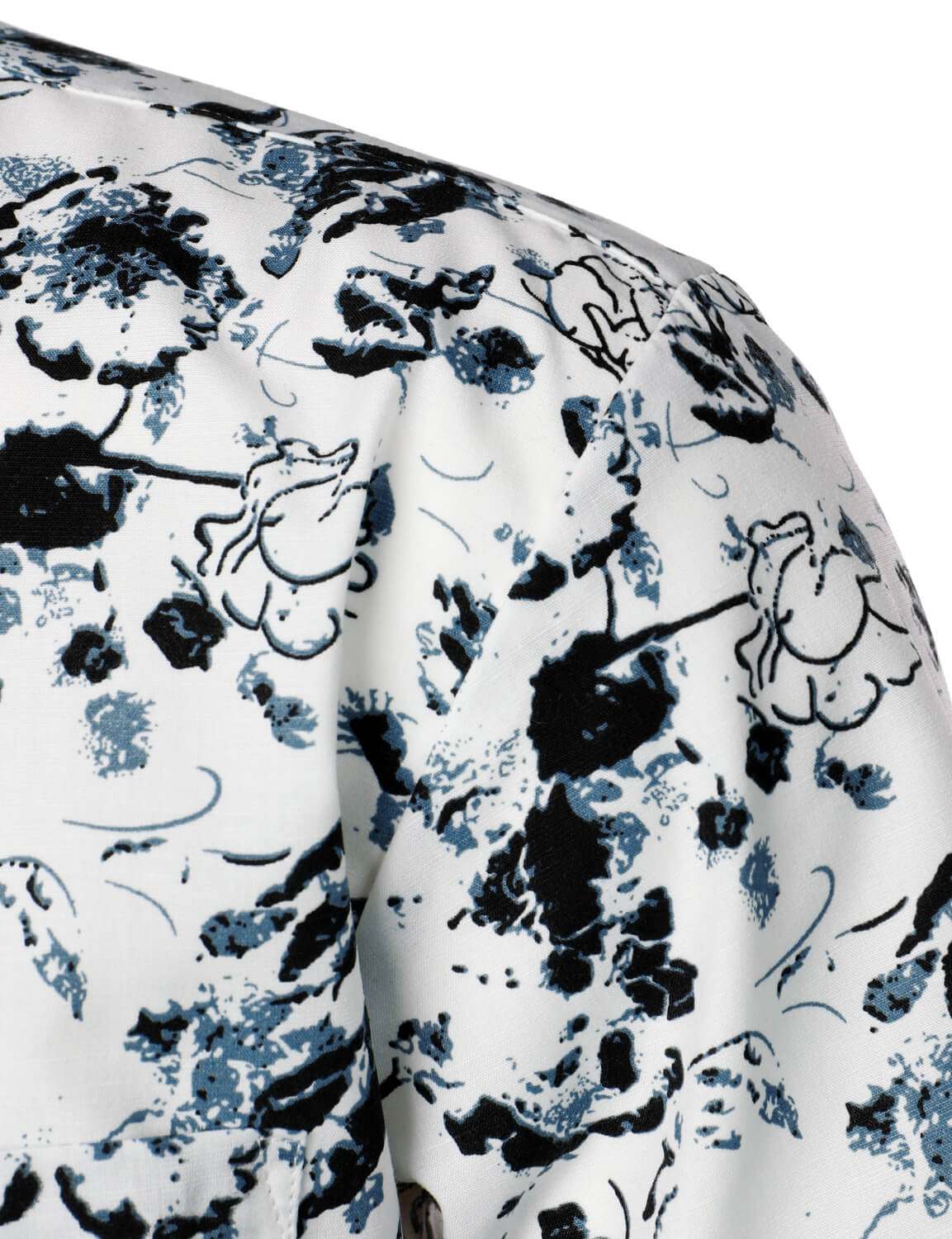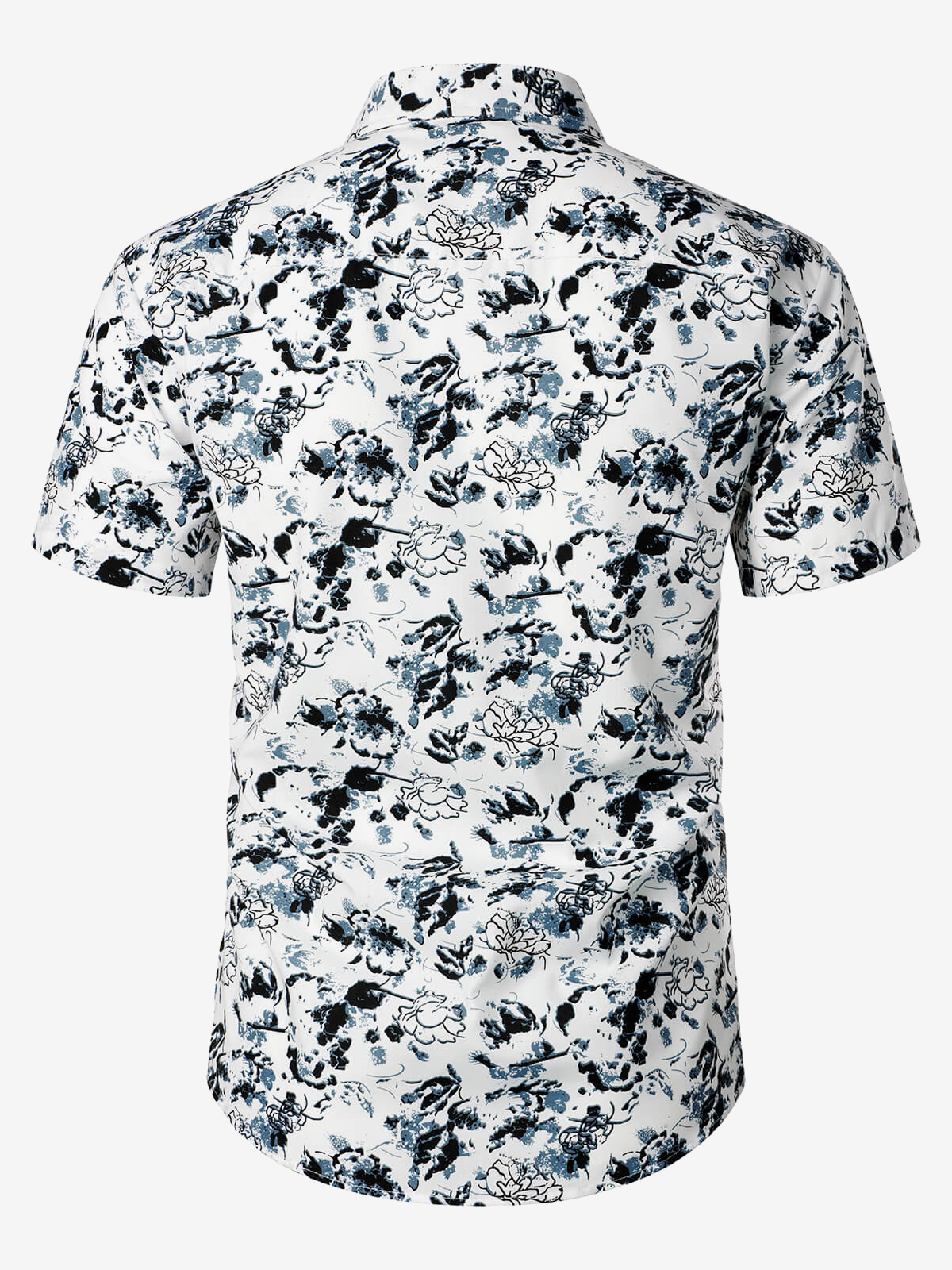 Men's White and Black Floral Summer Flower Button Up Cotton Short Sleeve Shirt