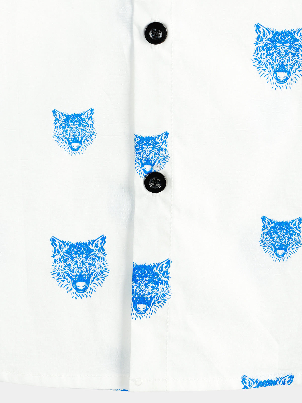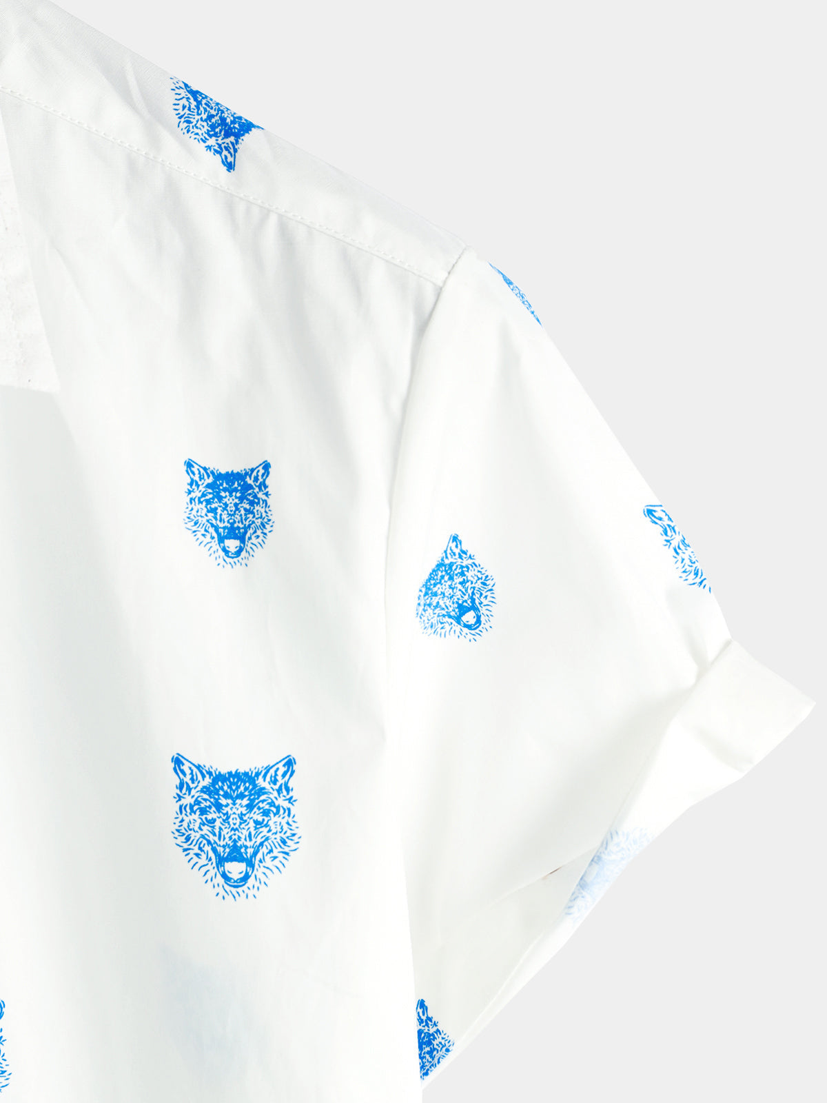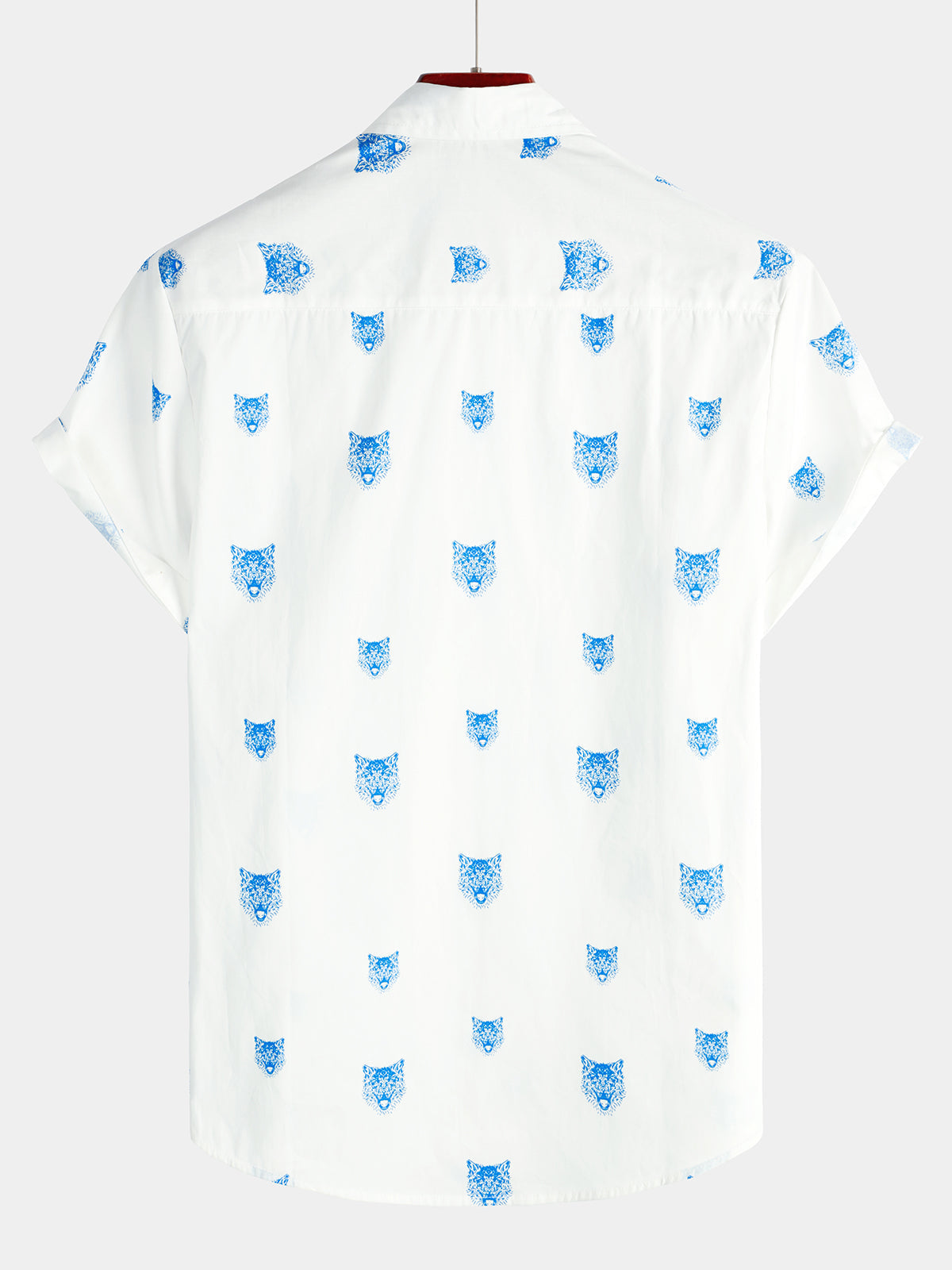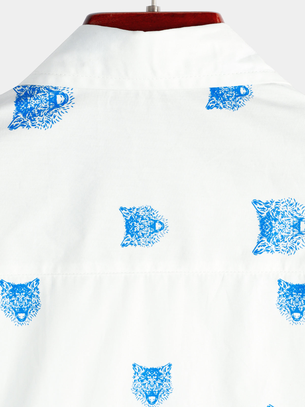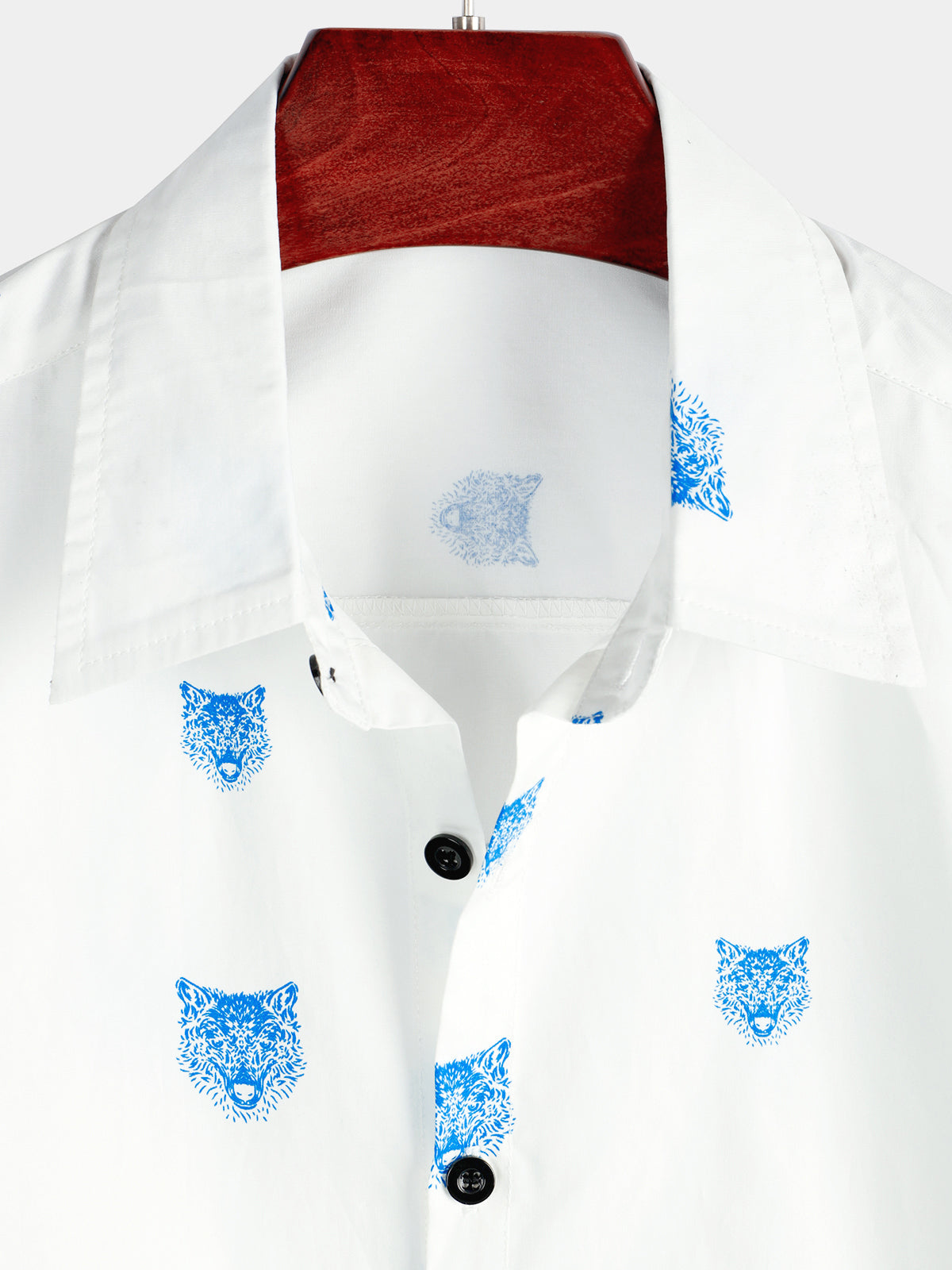 Men's Wolf Animal Print Button Casual Lapel White Short Sleeve Shirt