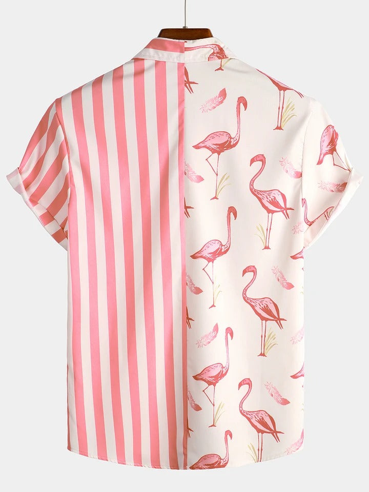 Men's Pink Flamingo & Striped Print Pocket Short Sleeve Shirt