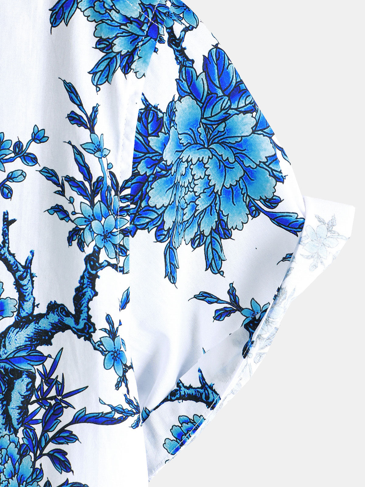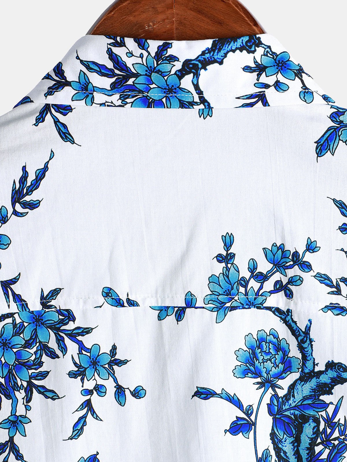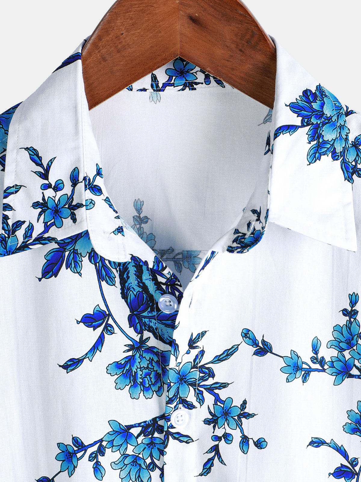 Men's Blue Blossom Holiday Cotton Short Sleeve Shirt