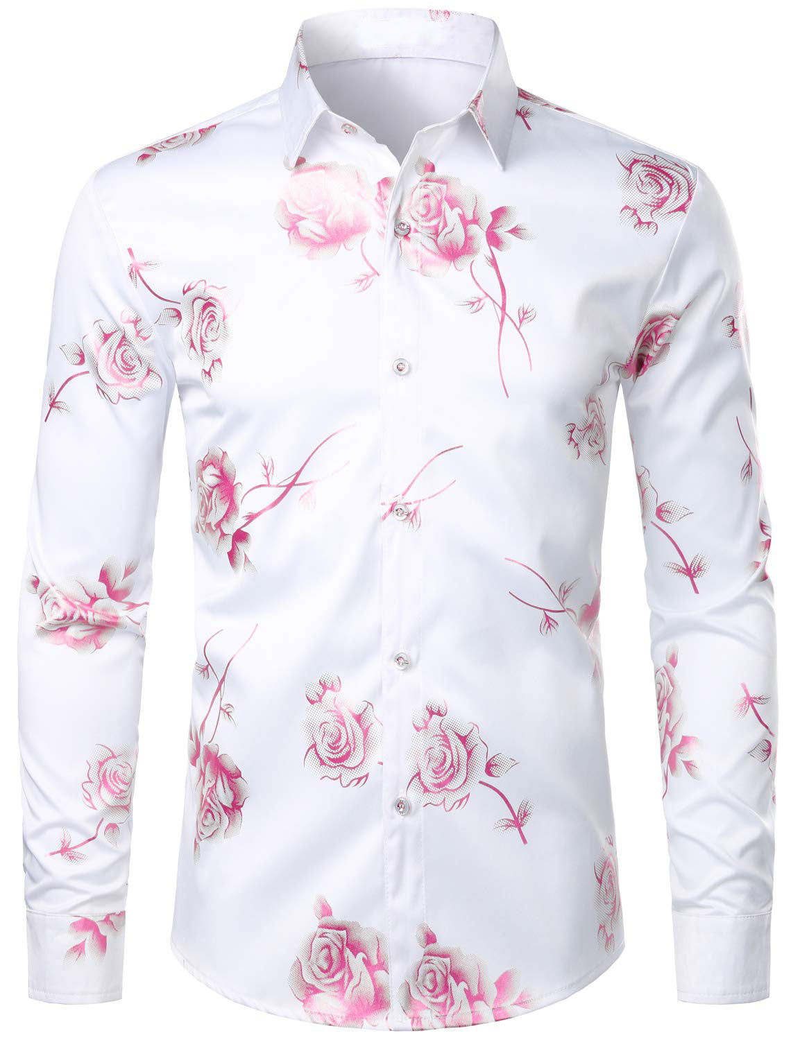Men's Casual Pink Rose Floral Print Button Up Long Sleeve Dress Shirt