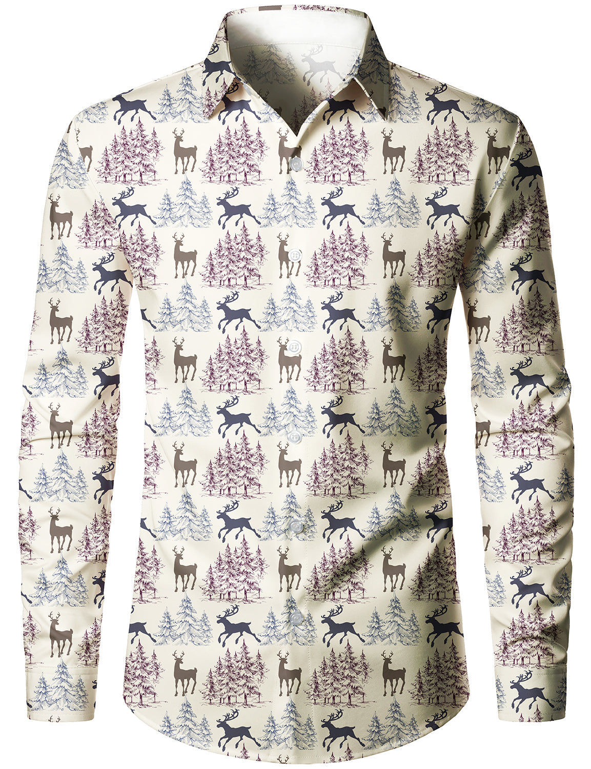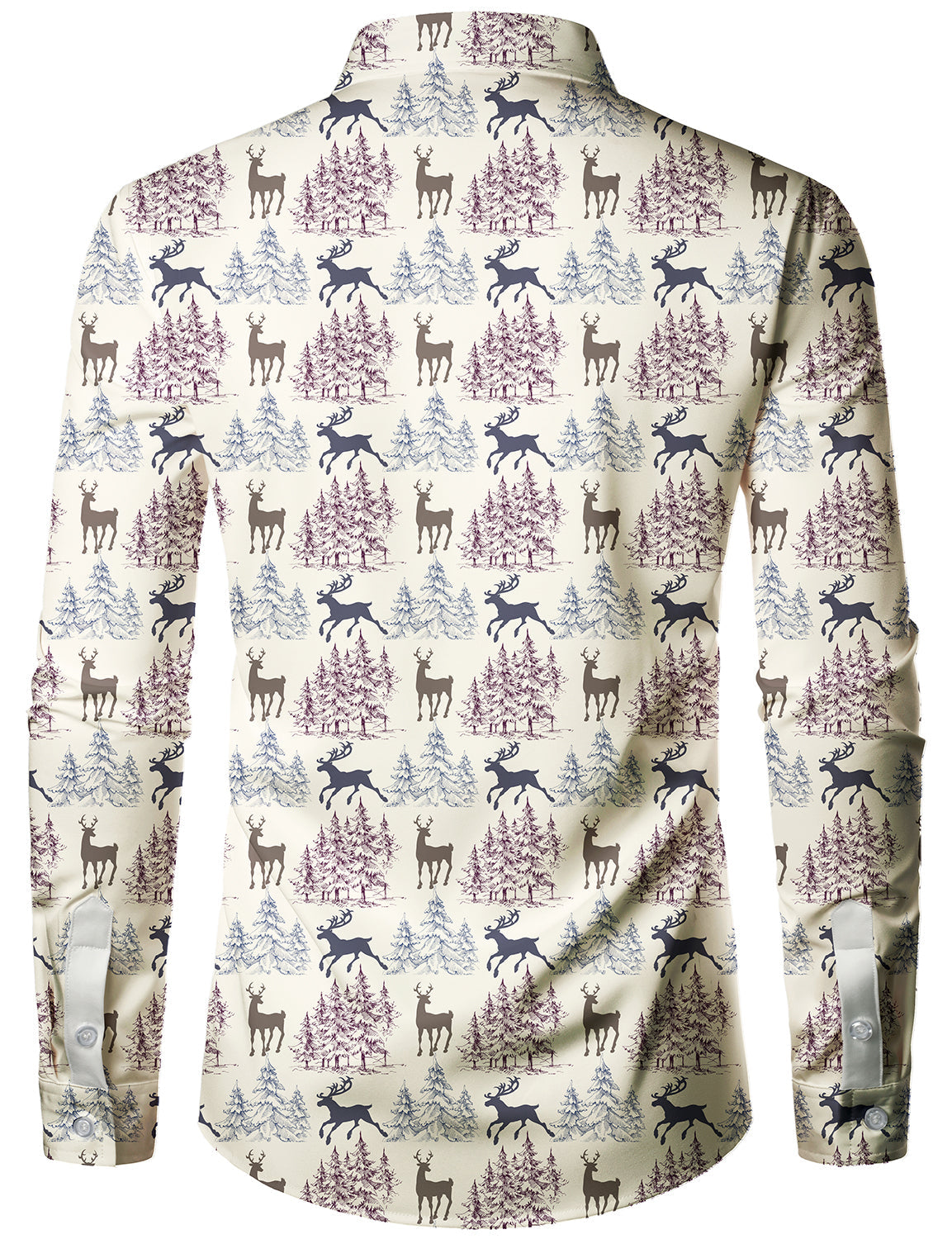 Men's Christmas Elk Print Holiday Party Button Up Long Sleeve Shirt