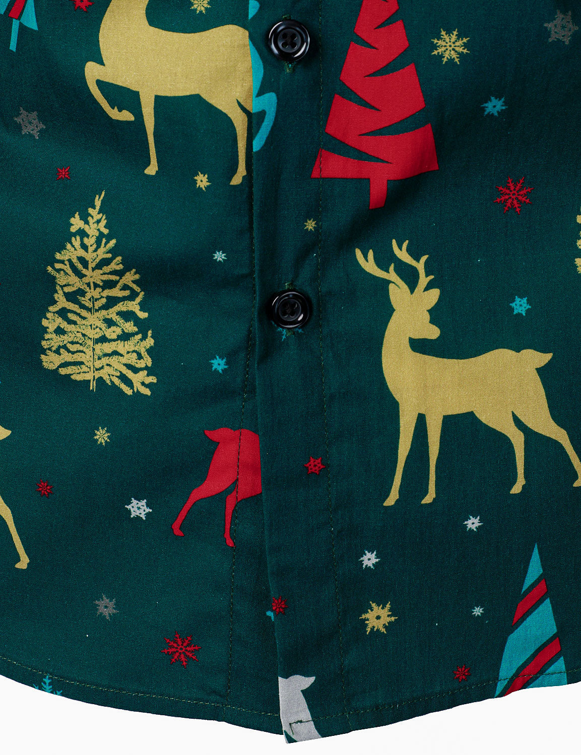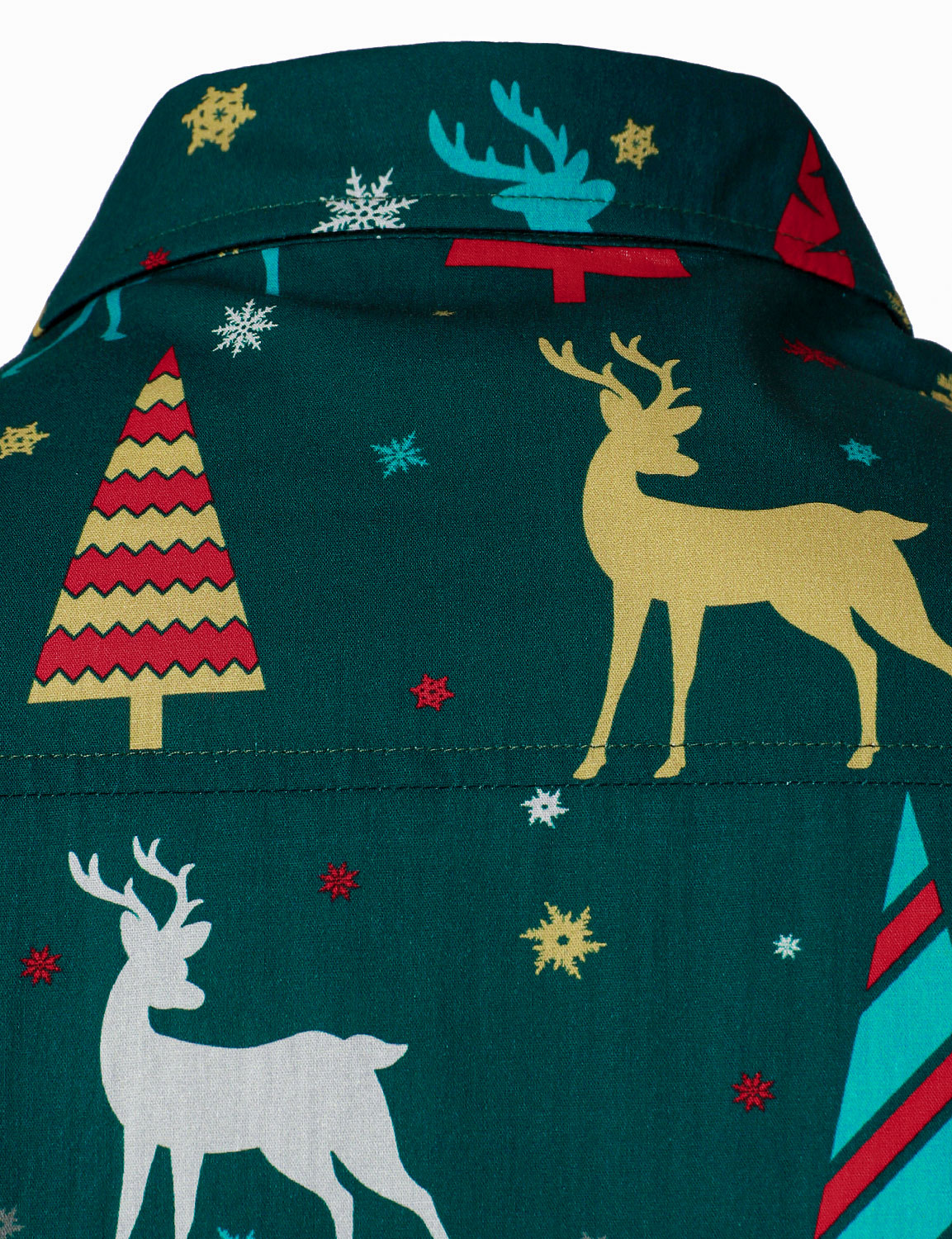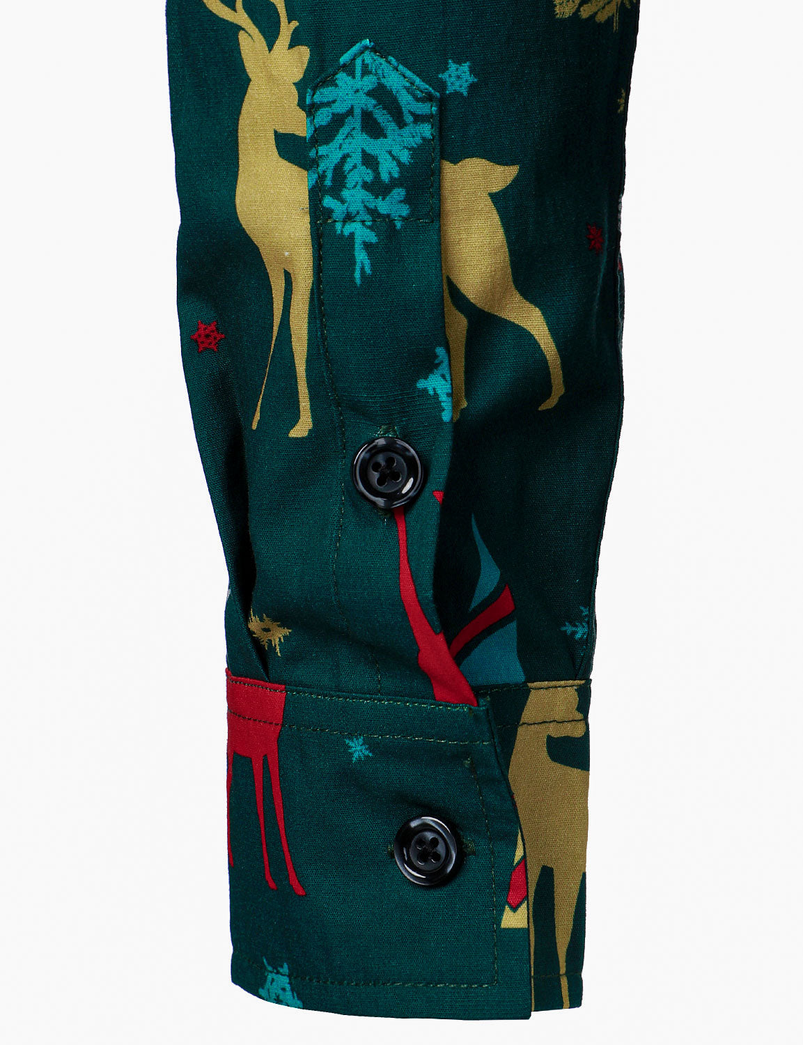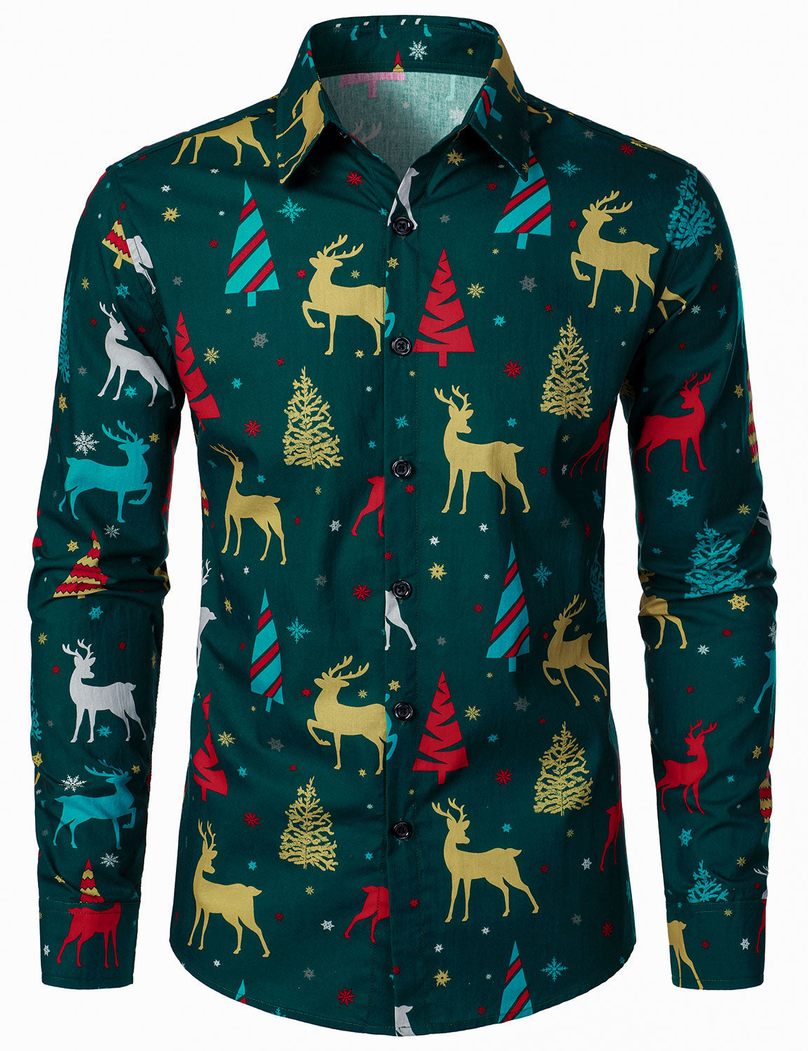 Men's Christmas Reindeer Holiday Green Cotton Long Sleeve Shirt