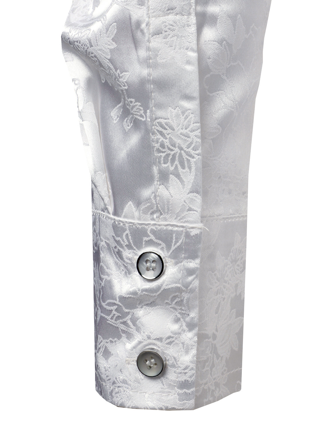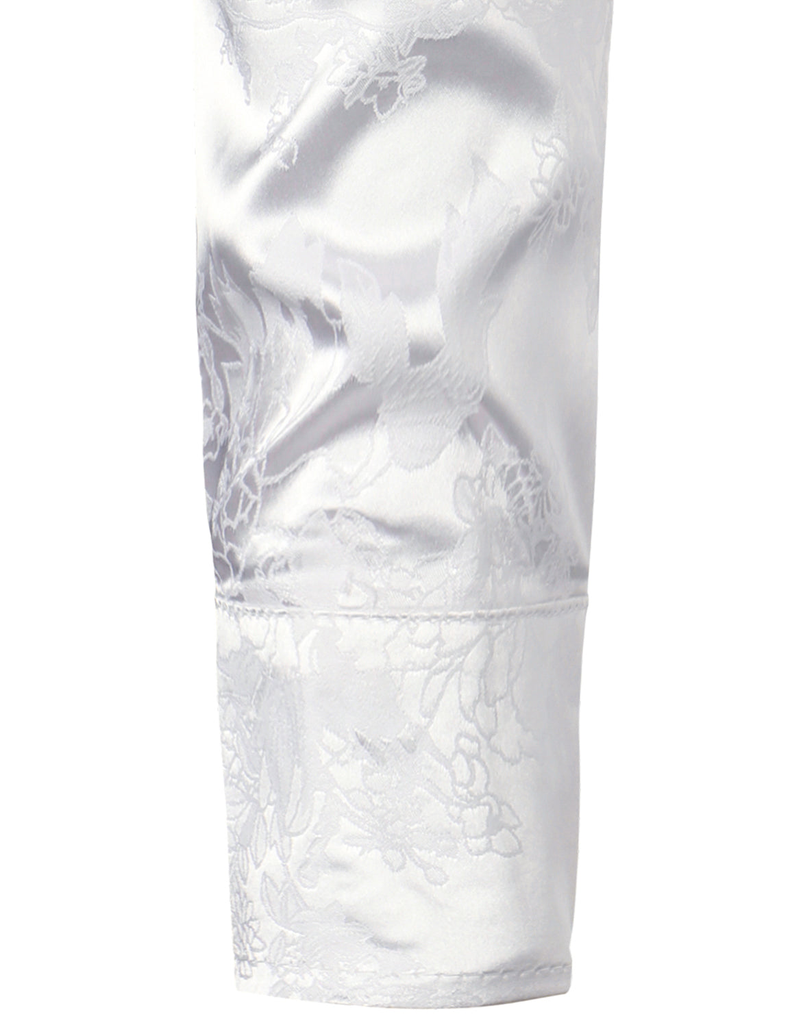 Men's Floral Jacquard Shiny Satin White Long Sleeve Button Up Dress Shirt