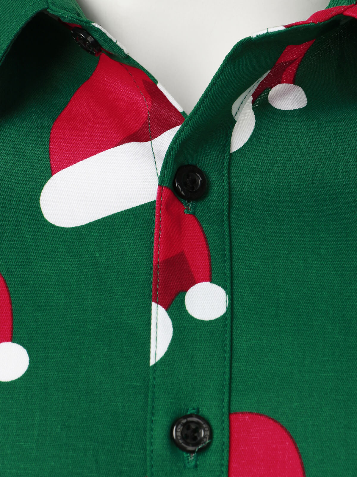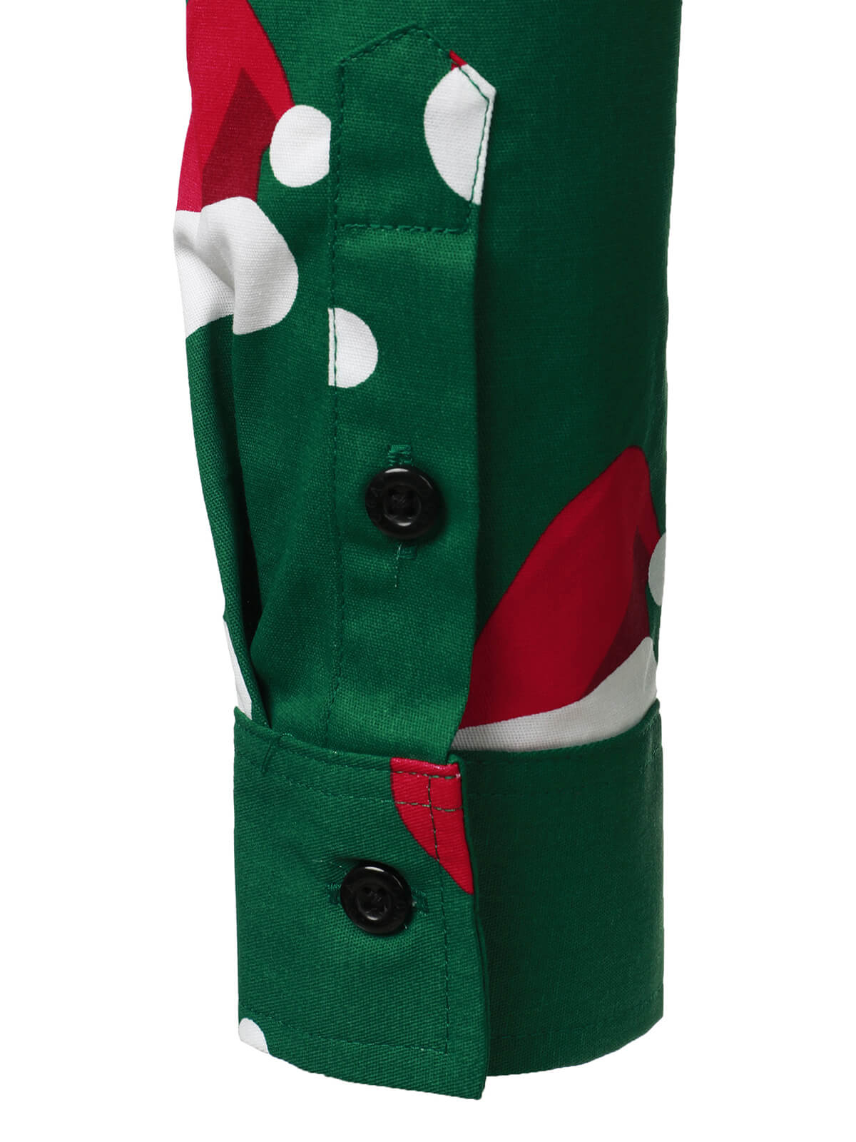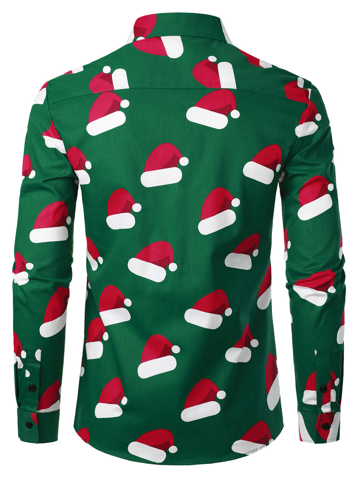 Men's Green Christmas Santa Hat Print Button Up Long Sleeve Shirt