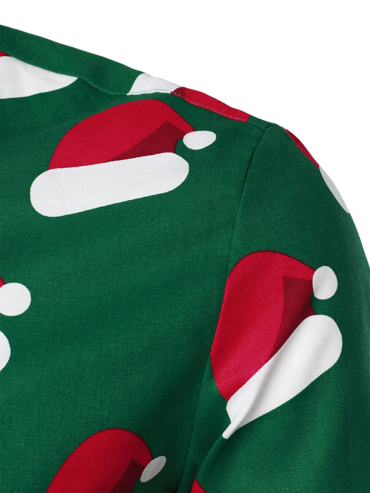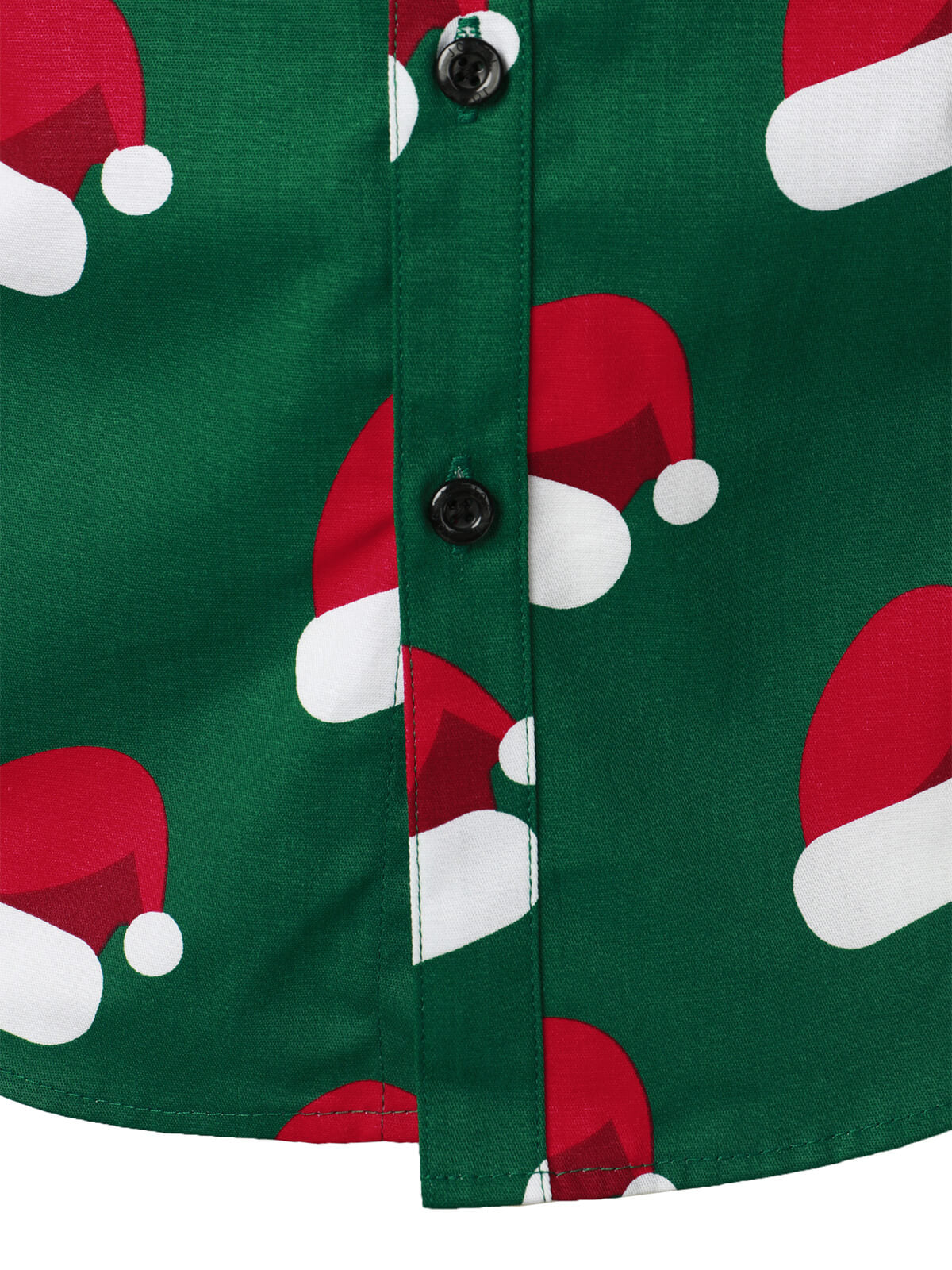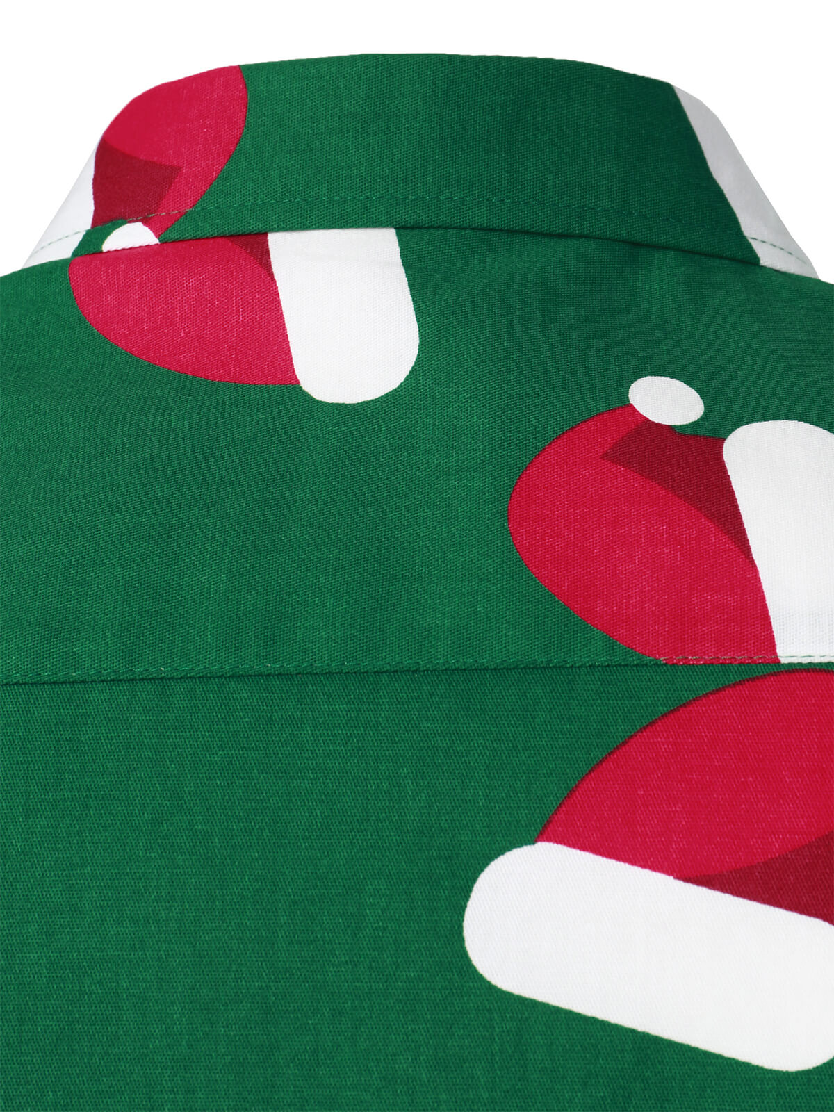 Men's Green Christmas Santa Hat Print Button Up Long Sleeve Shirt
