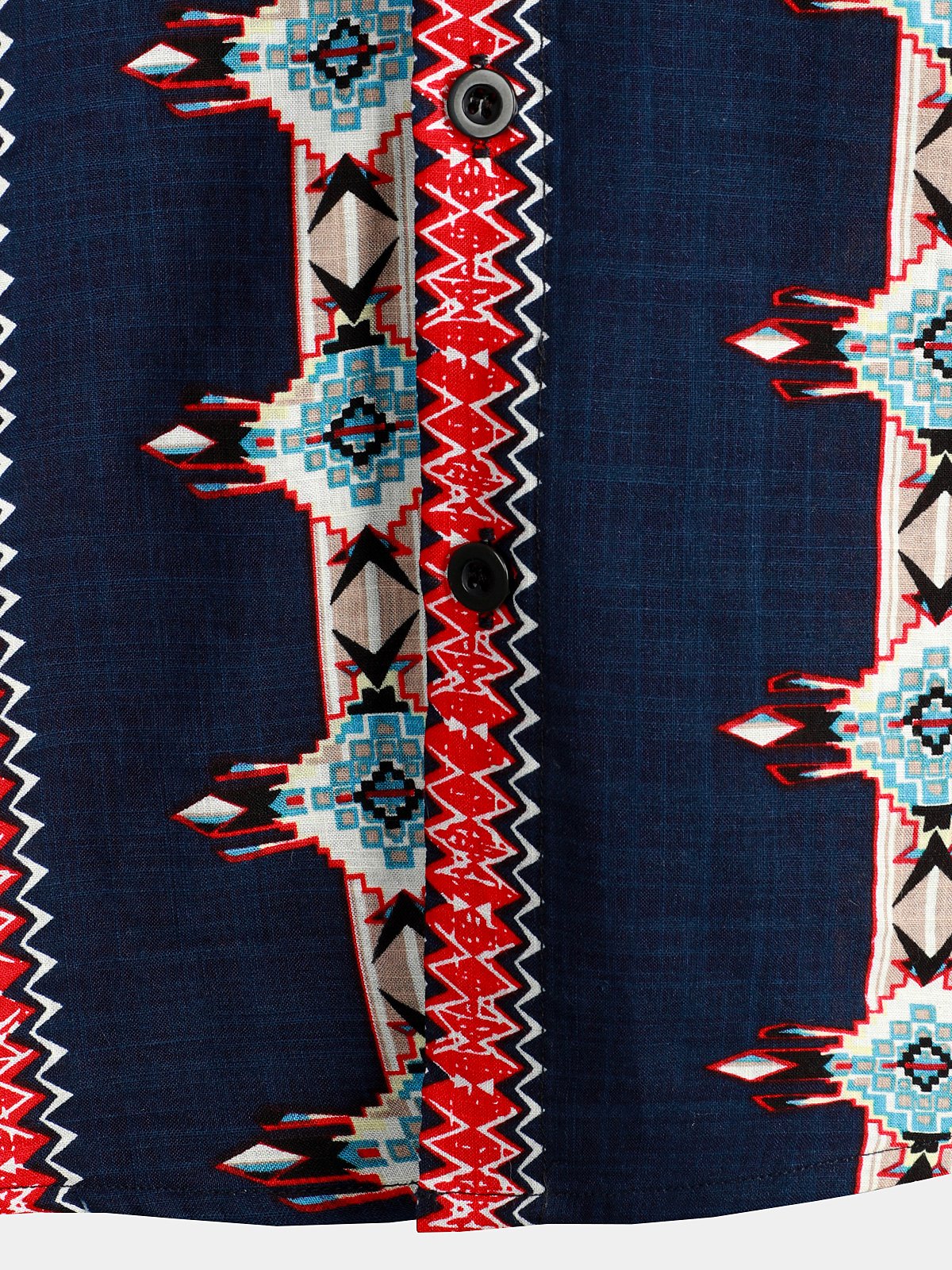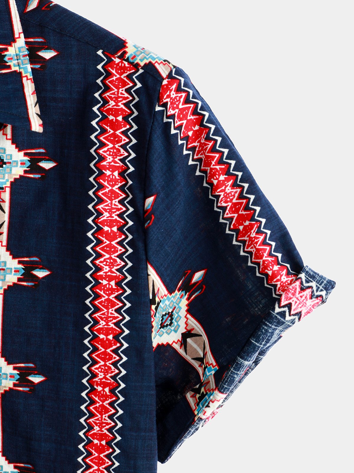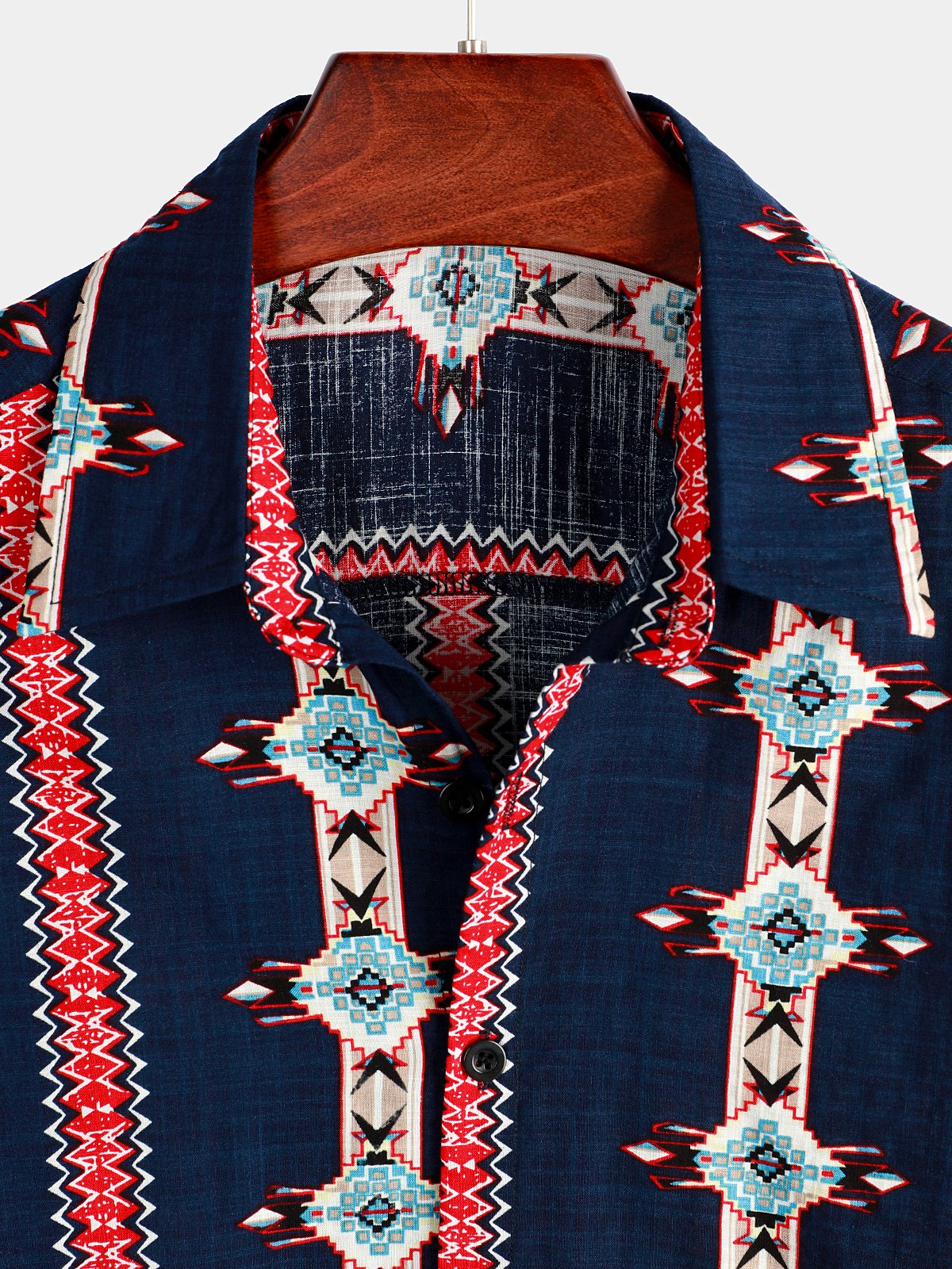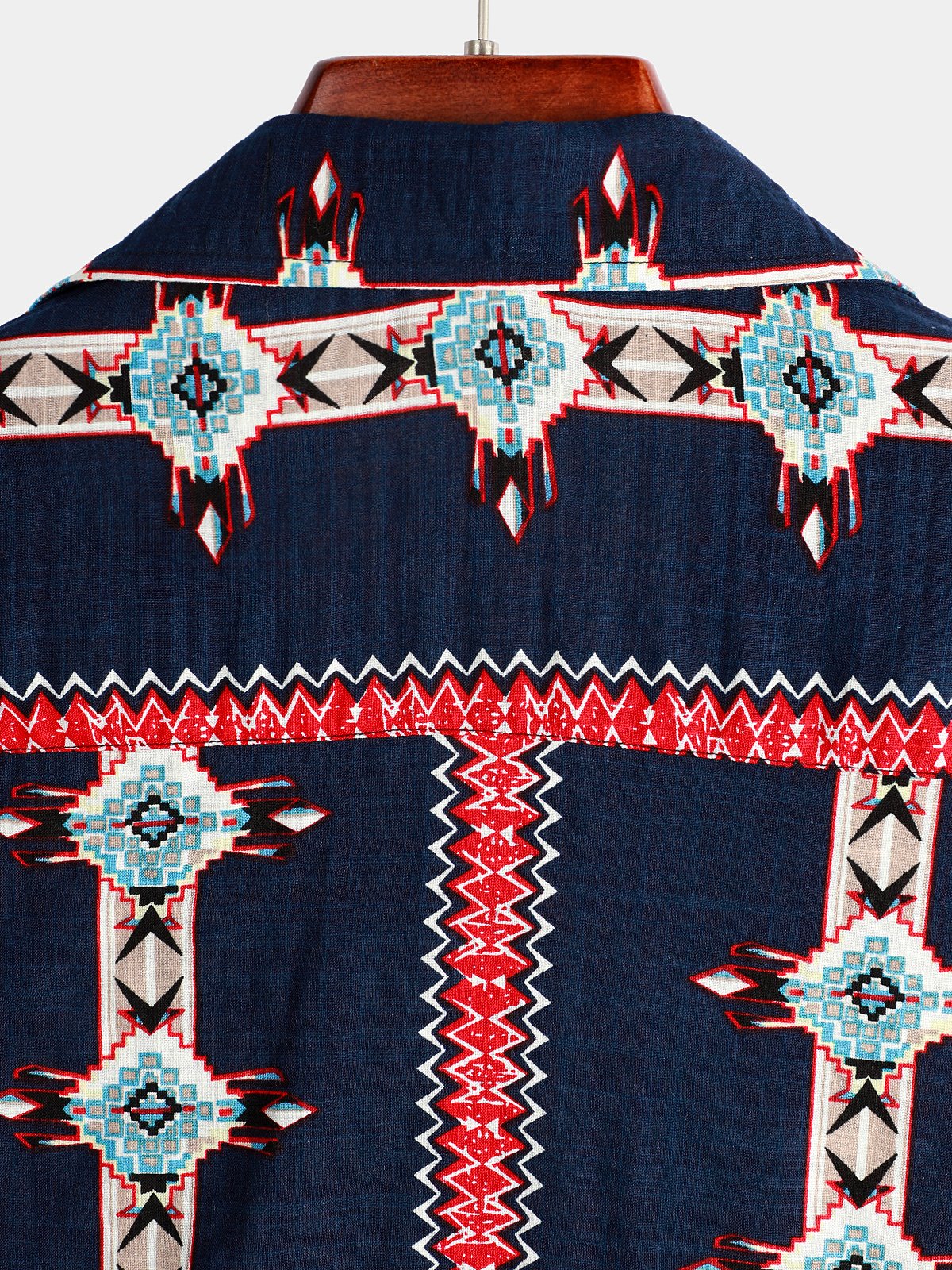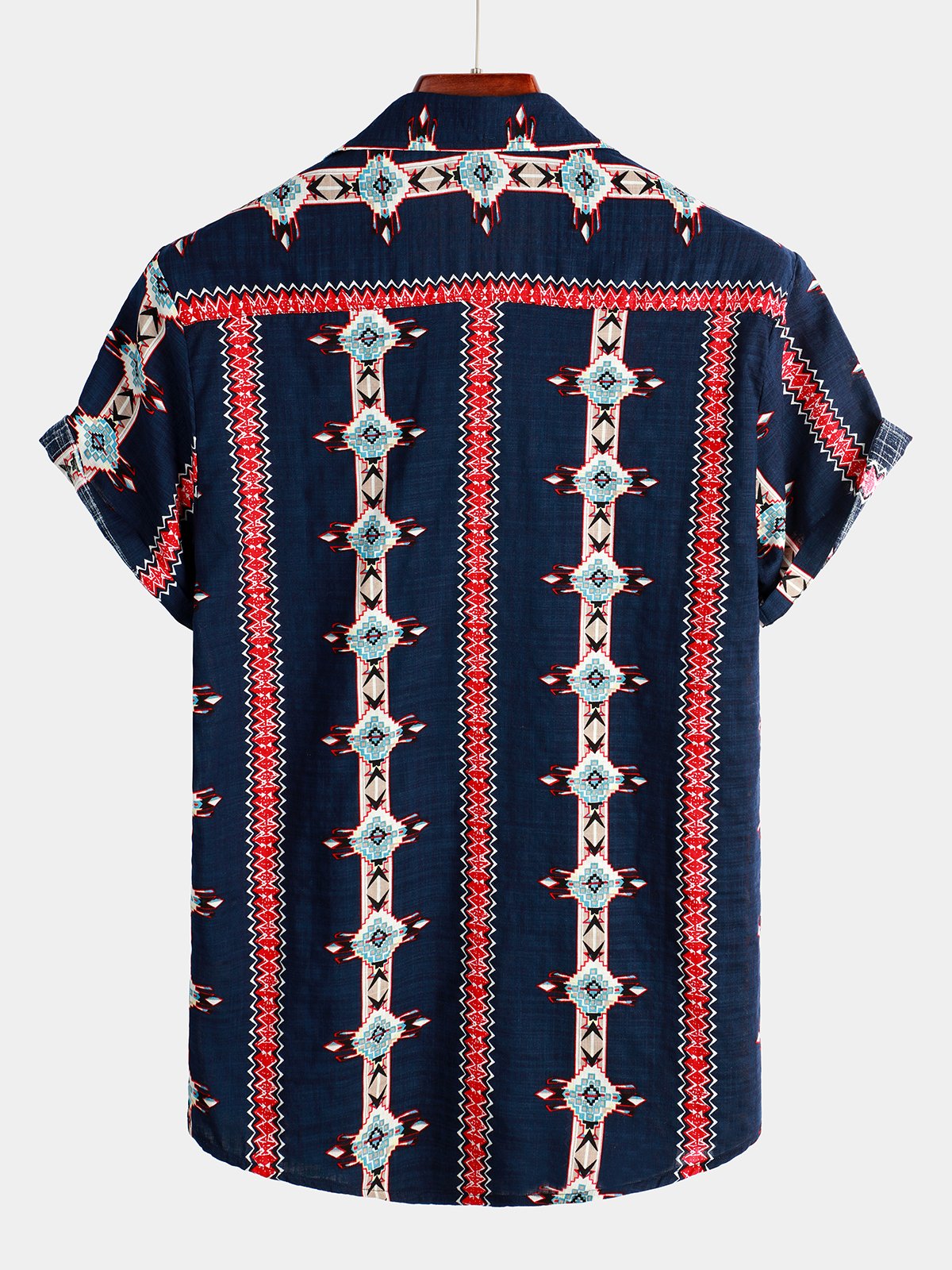 Men's Navy Blue Retro Short Sleeve Cotton Shirt