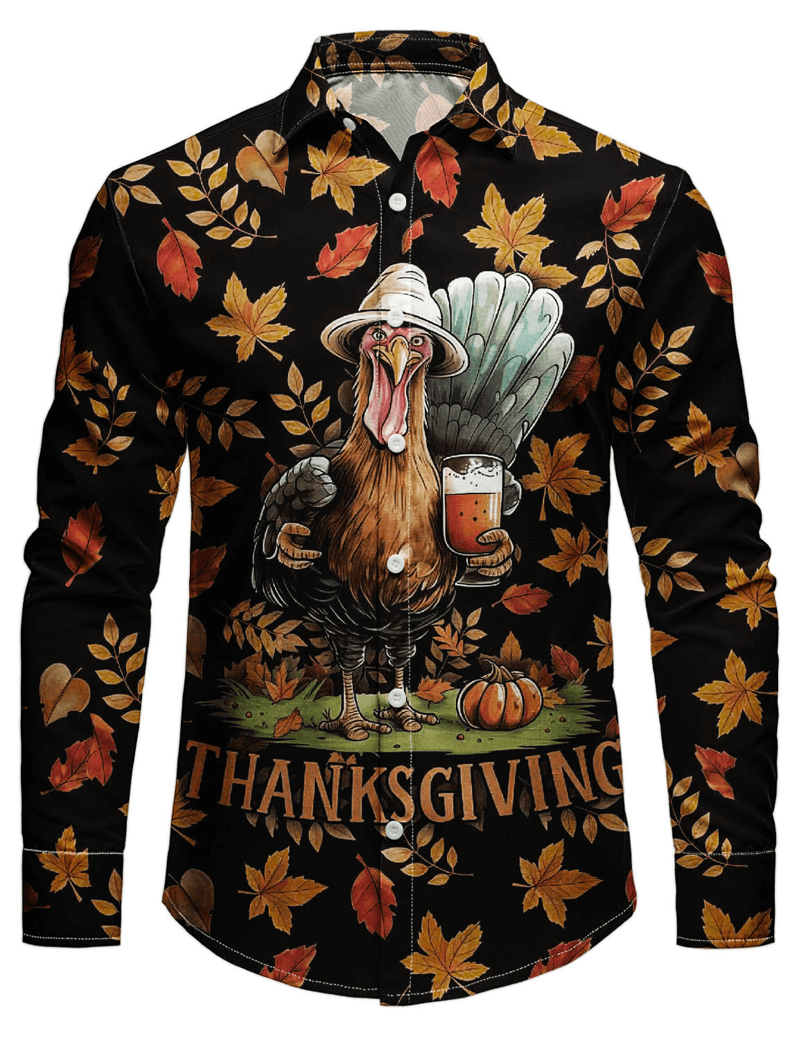 Men's Beer Turkey Thanksgiving Button Up Holiday Long Sleeve Shirt