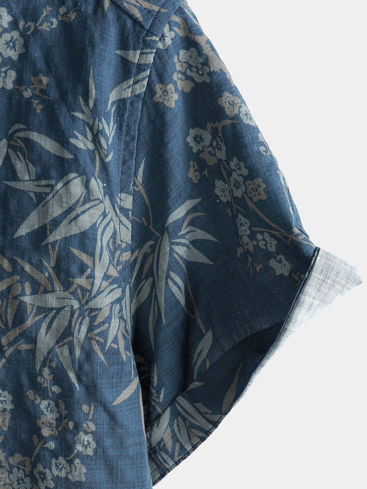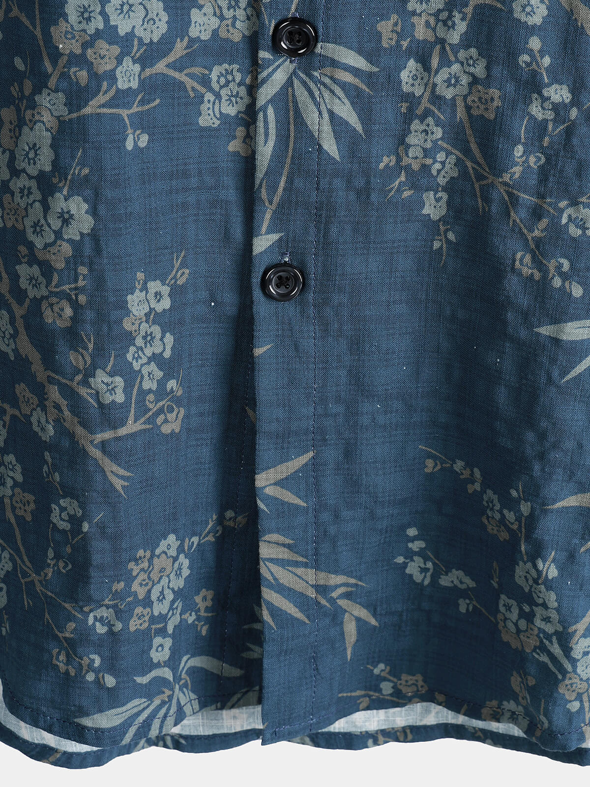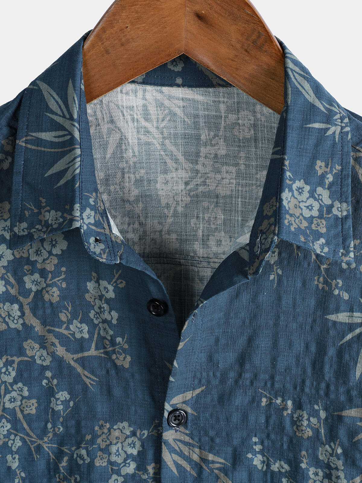 Men's Casual Elegant Blossom Print Retro Blue Short Sleeve Shirt