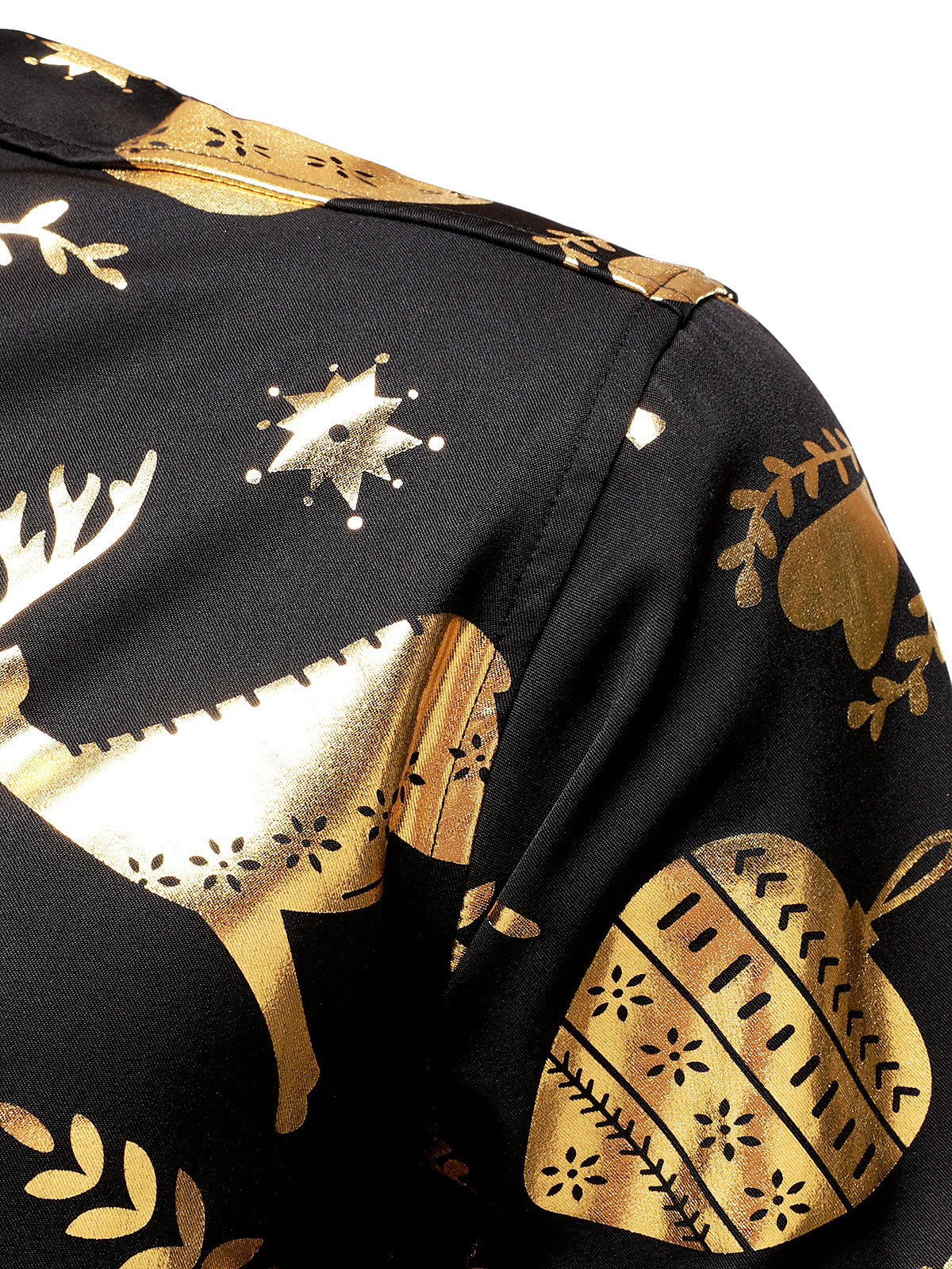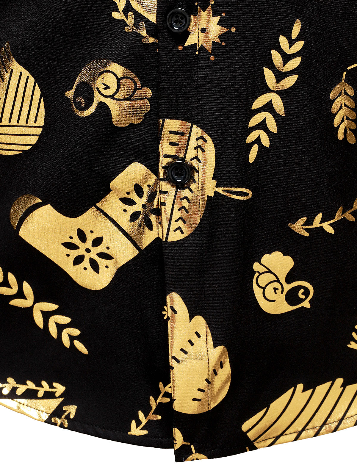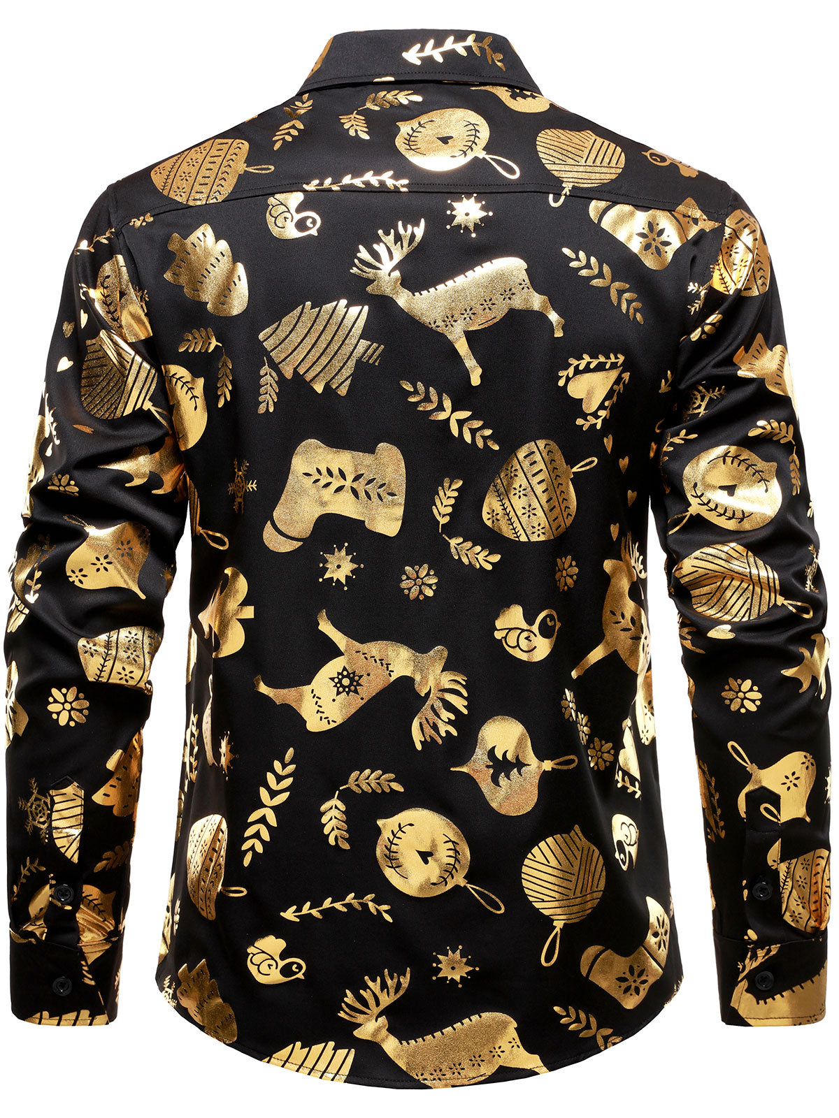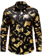 Men's Christmas Party Festive Shiny Gold Reindeer Stocking Print Long Sleeve Button Down Shirt