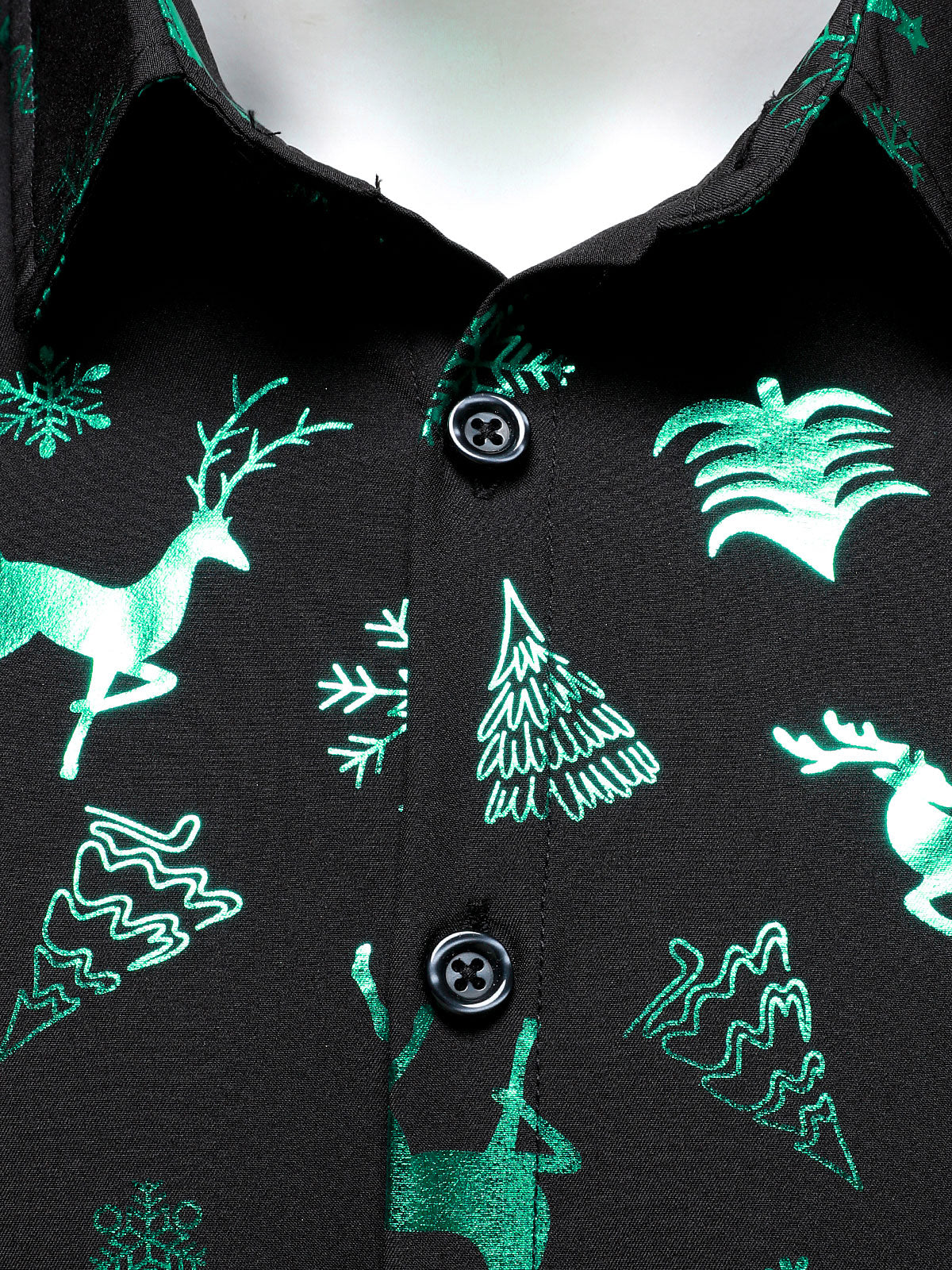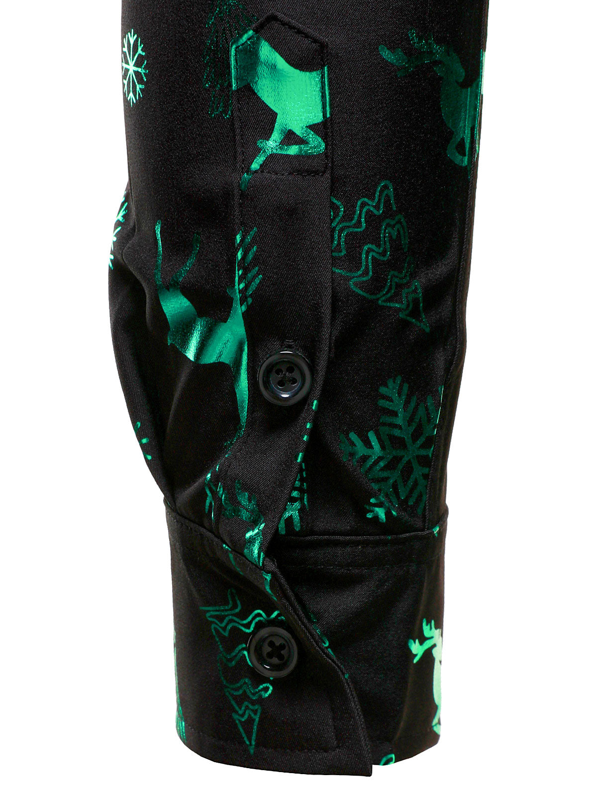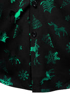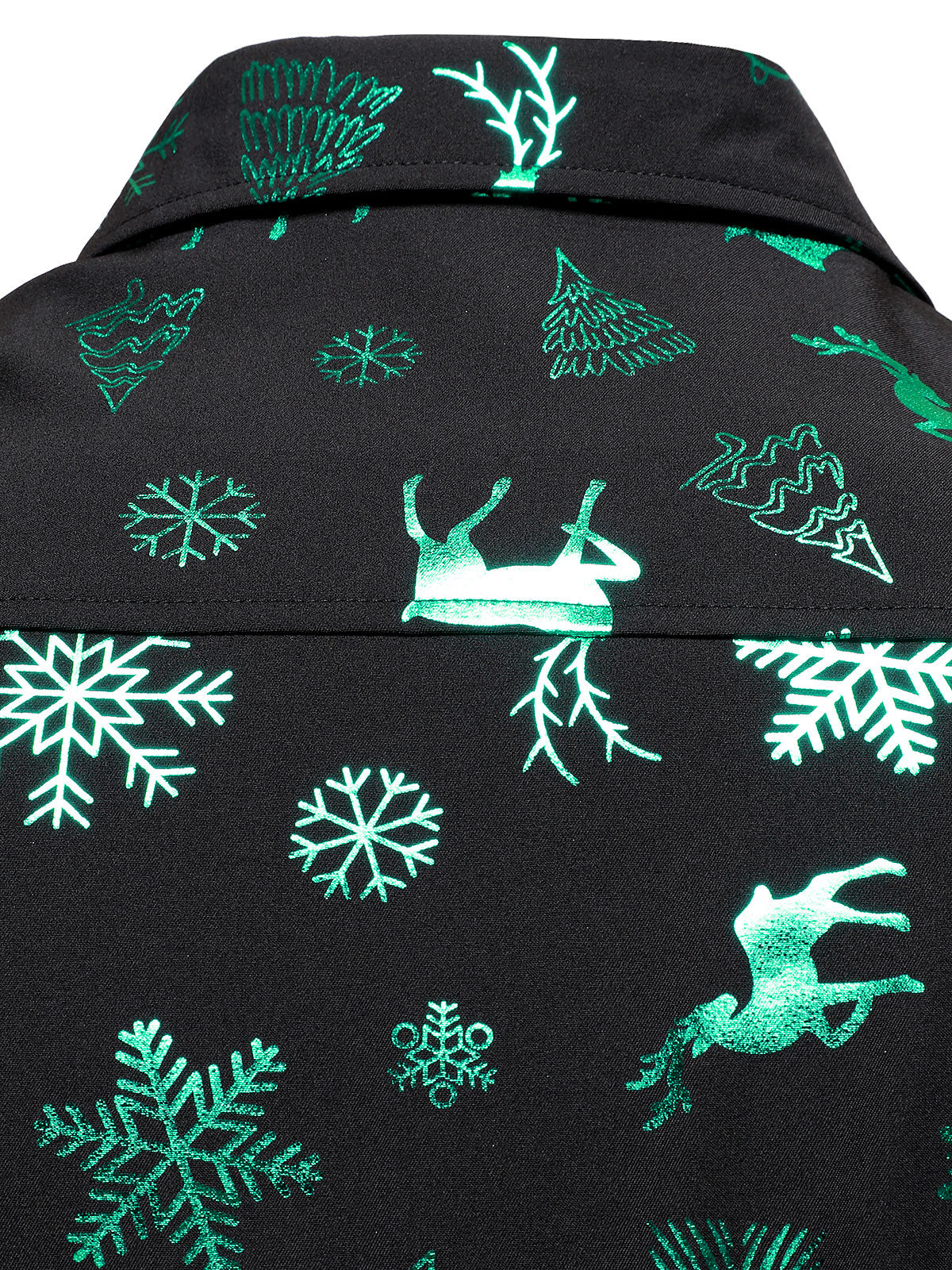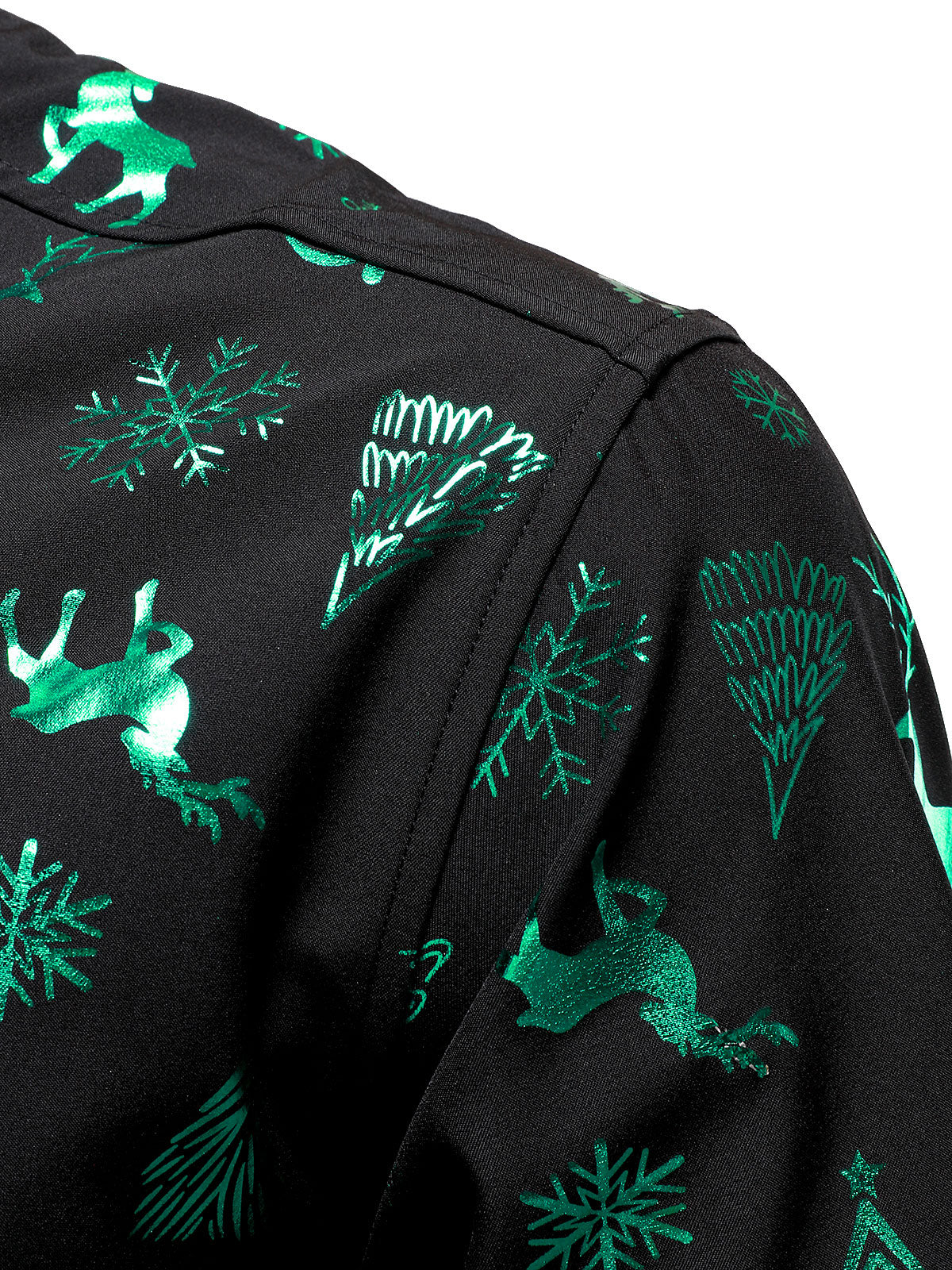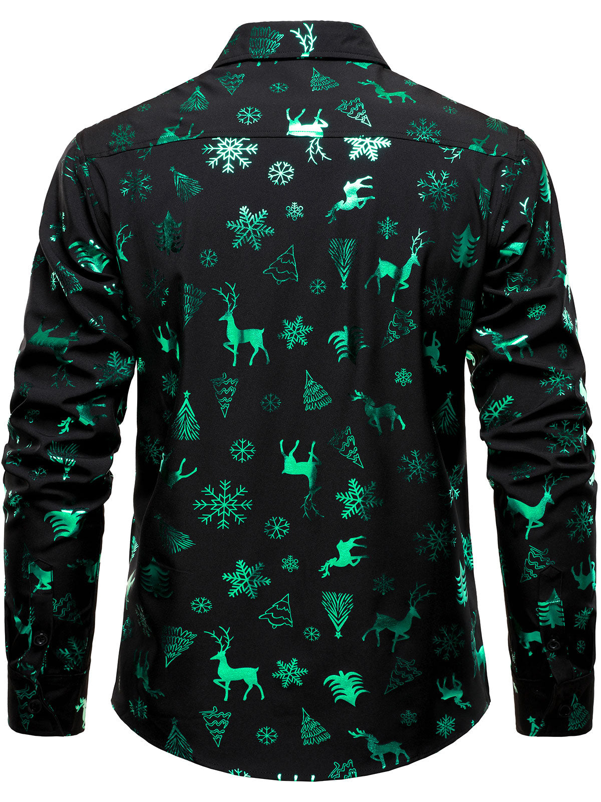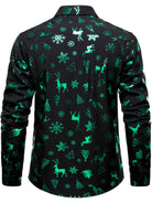 Men's Christmas Party Glittery Green Reindeer Snowflake Print Long Sleeve Button Down Shirt