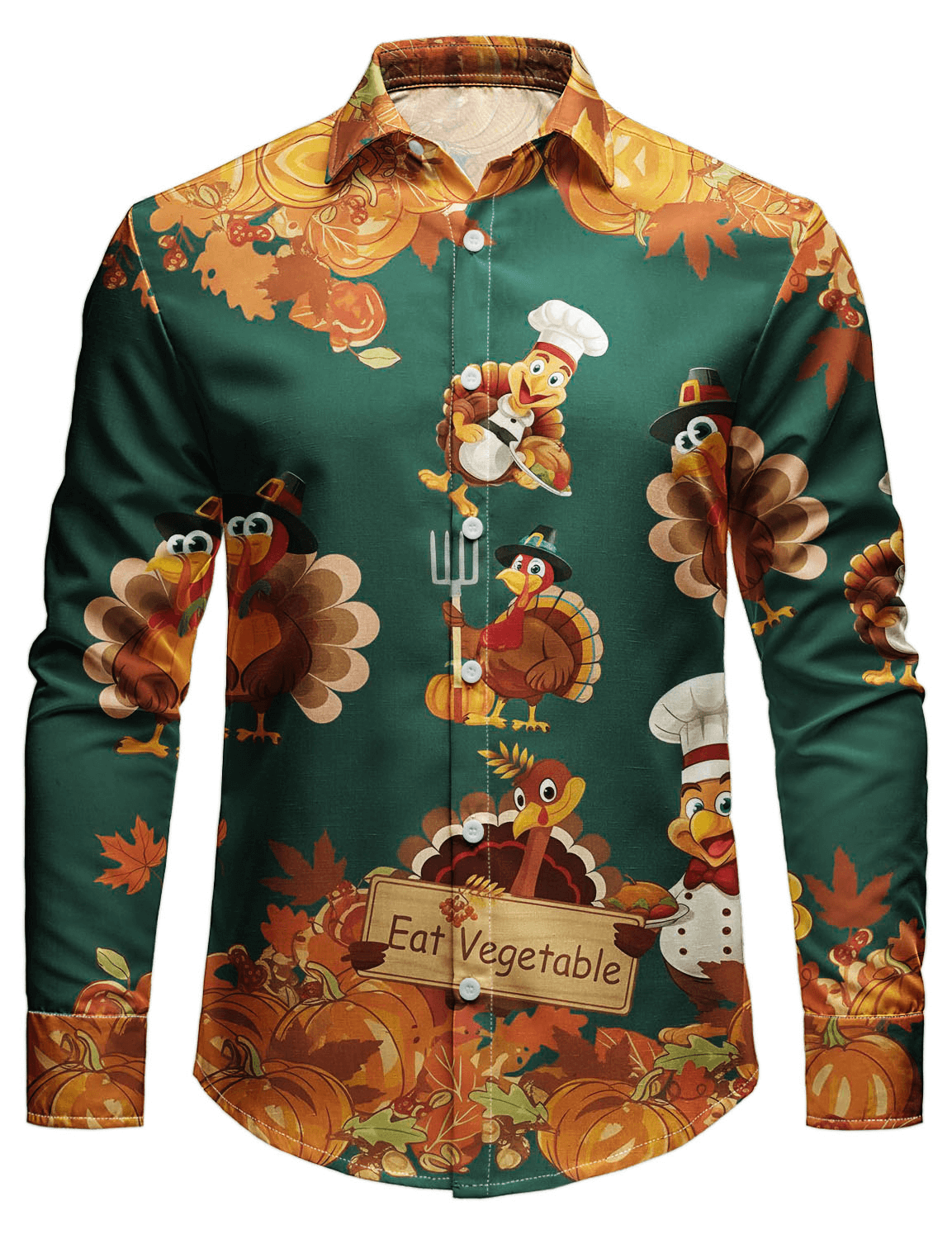 Men's Funny Turkey Print Thanksgiving Holiday Button Up Green Long Sleeve Shirt