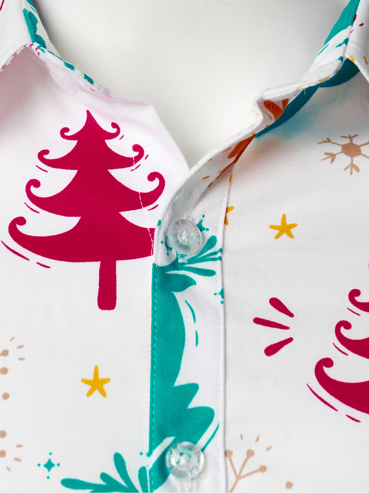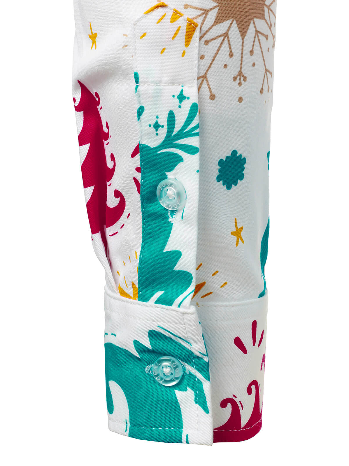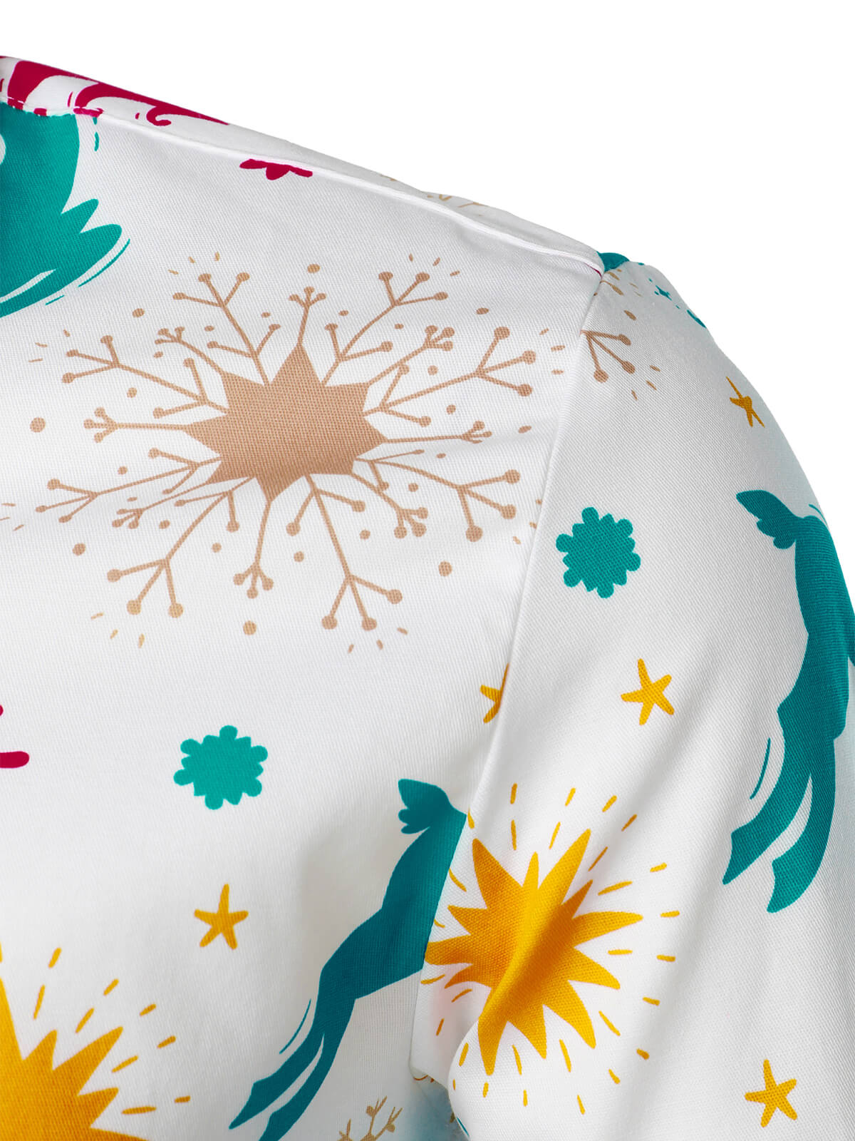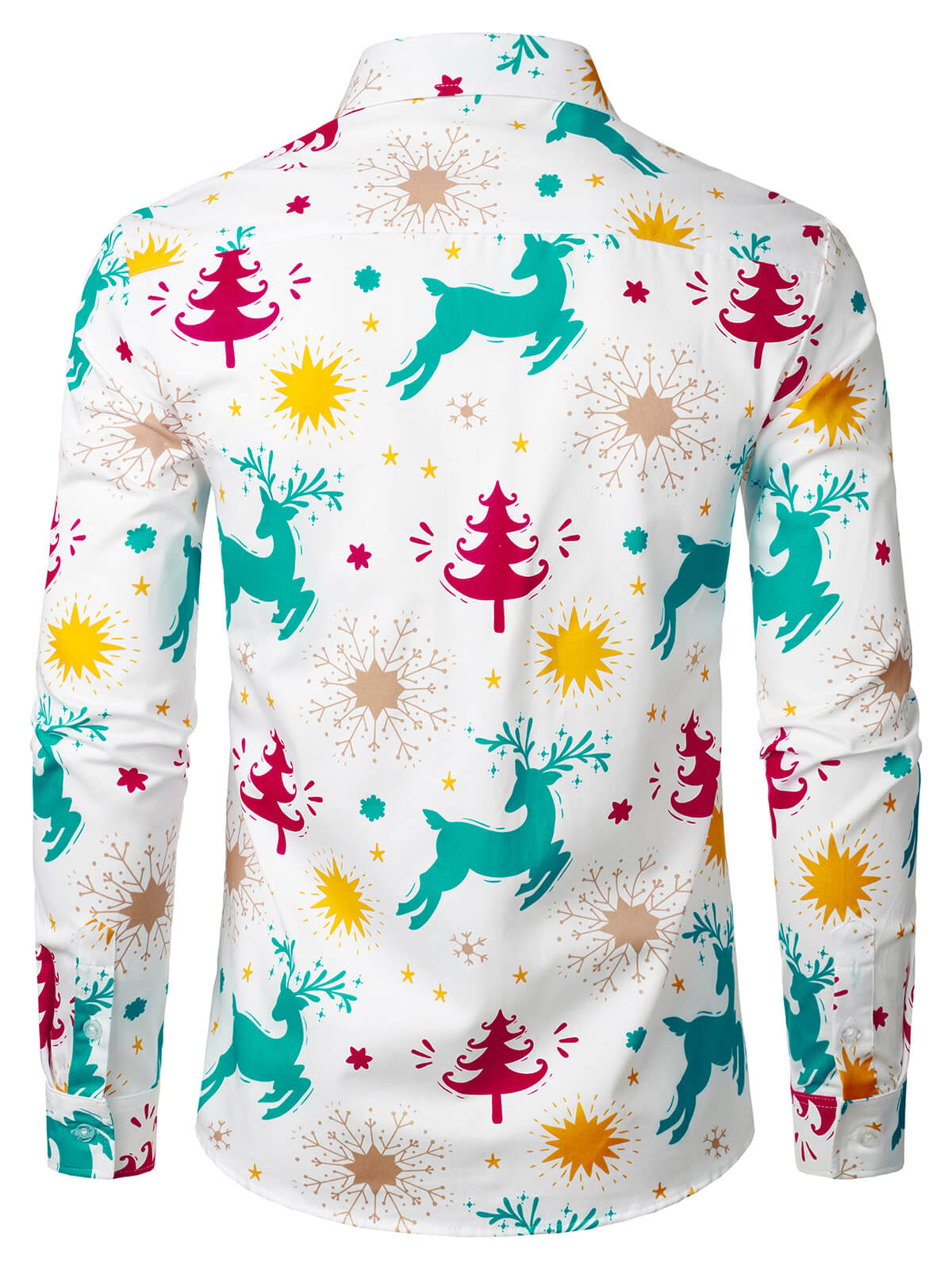 Men's Holiday Forest Animal and Tree Christmas Print Button Up White Long Sleeve Shirt