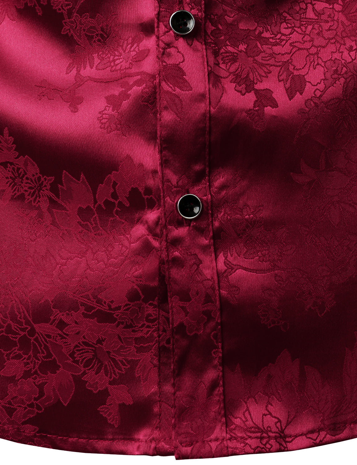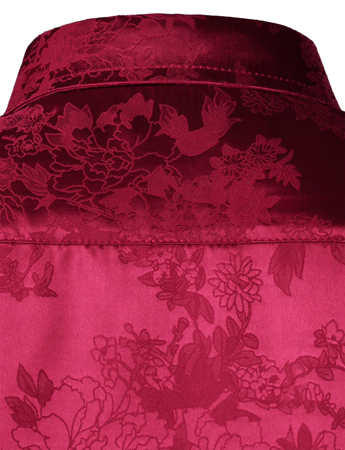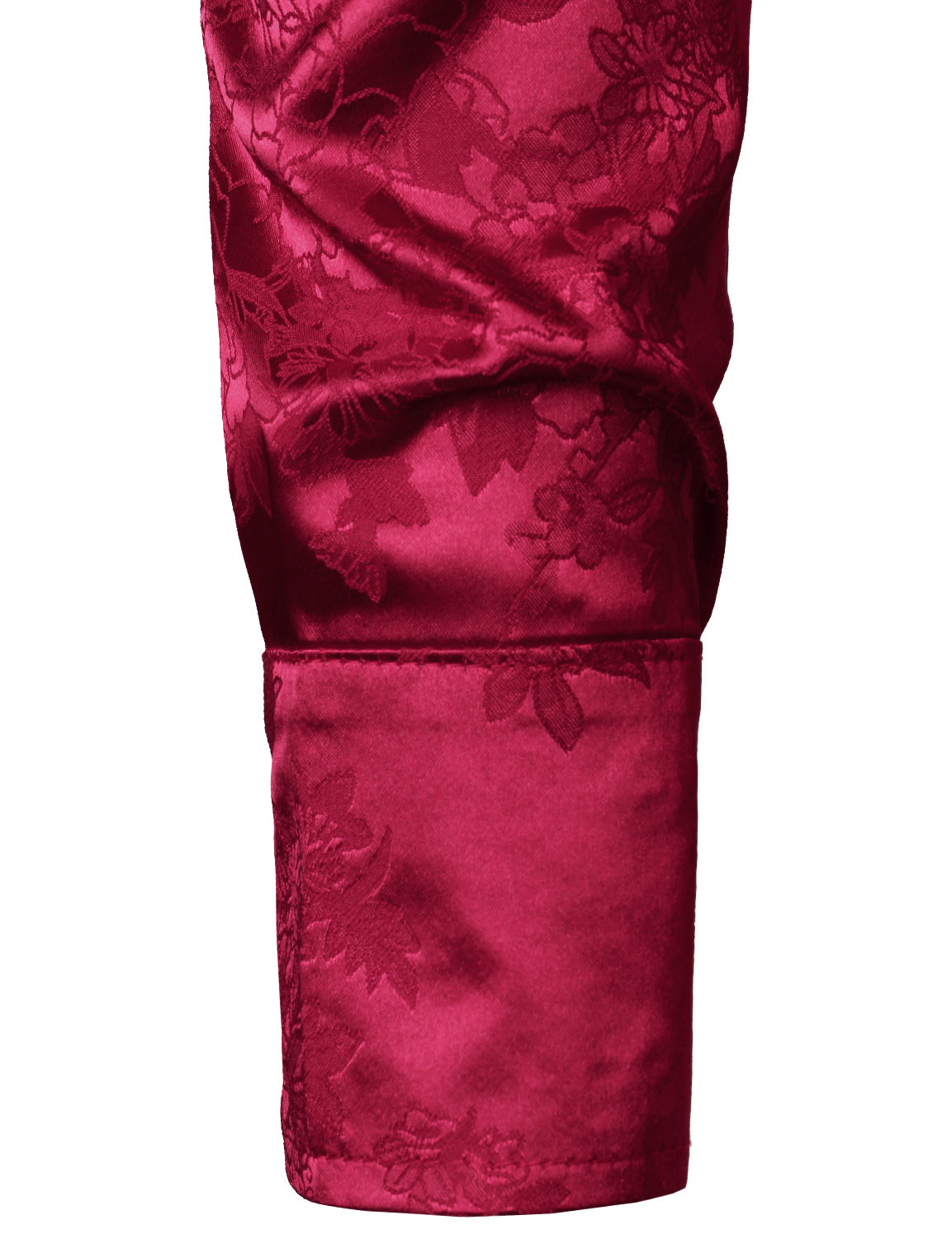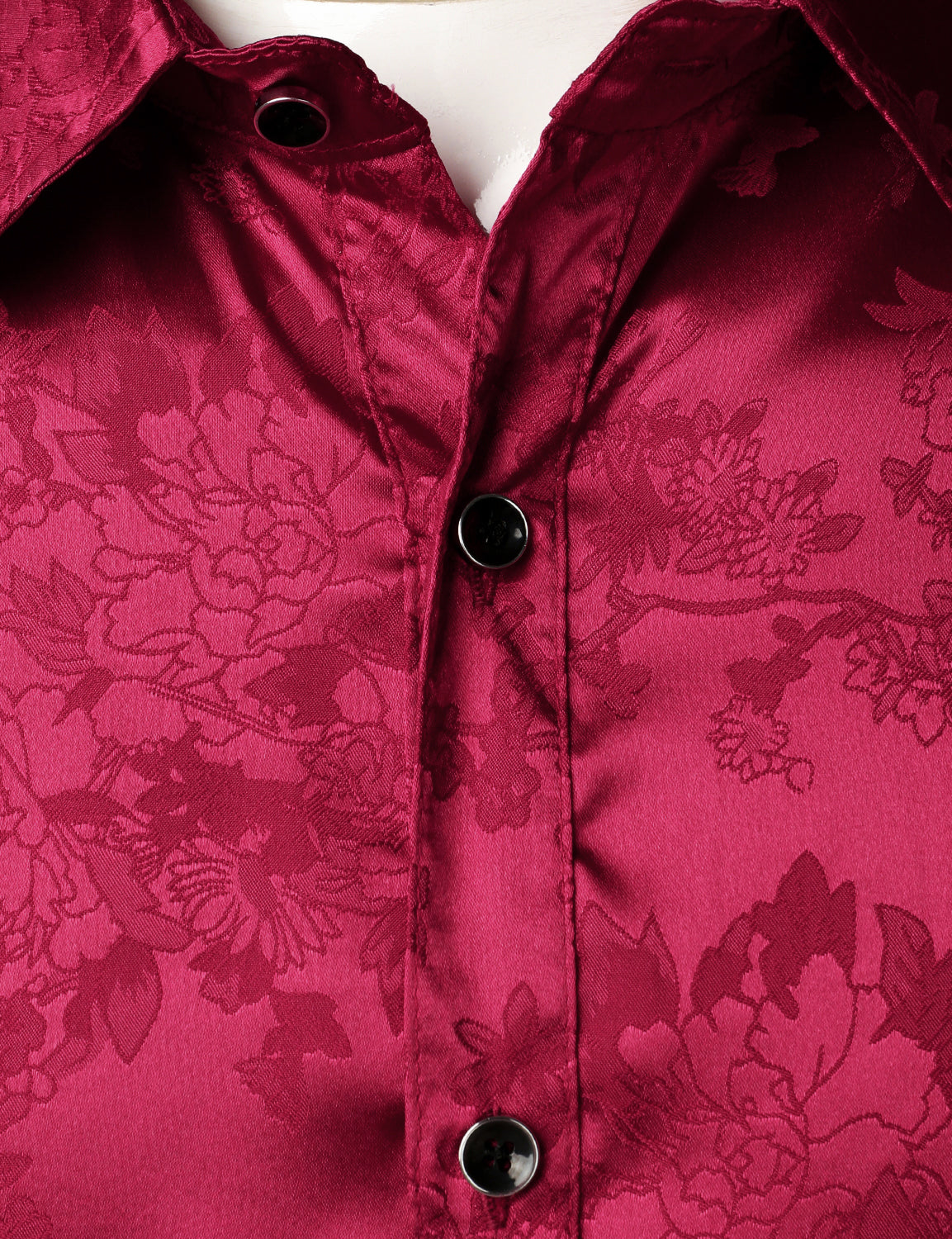 Men's Shiny Satin Floral Jacquard Red Button Up Long Sleeve Dress Shirt