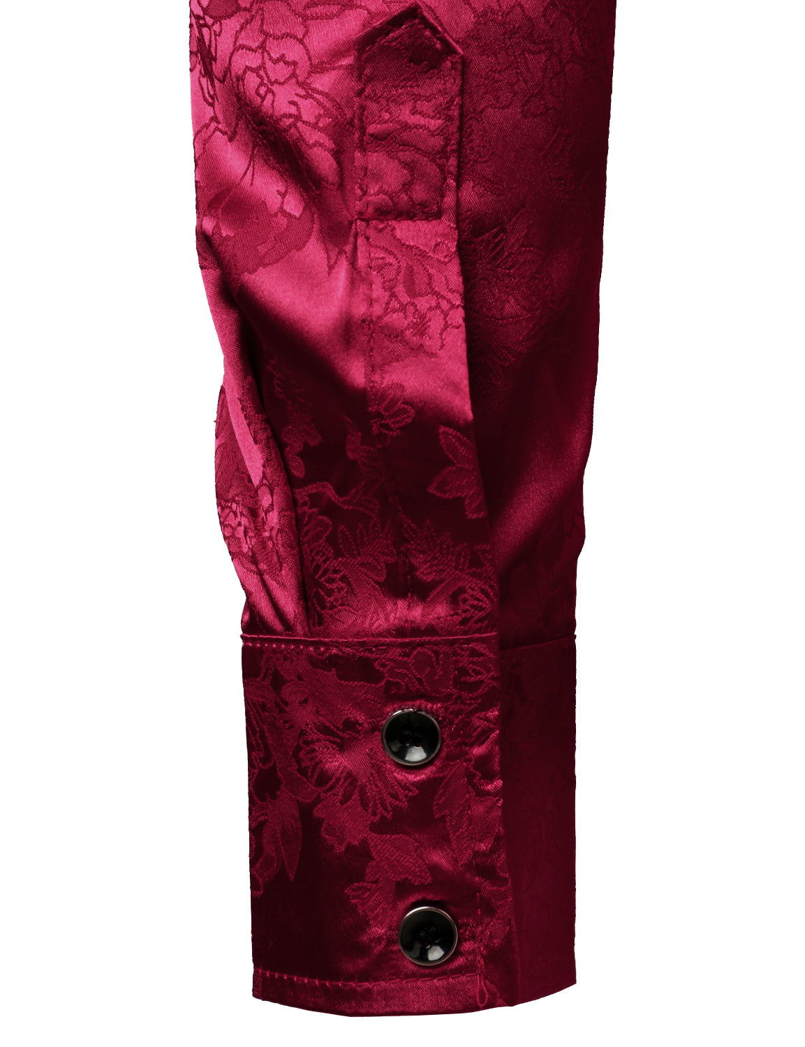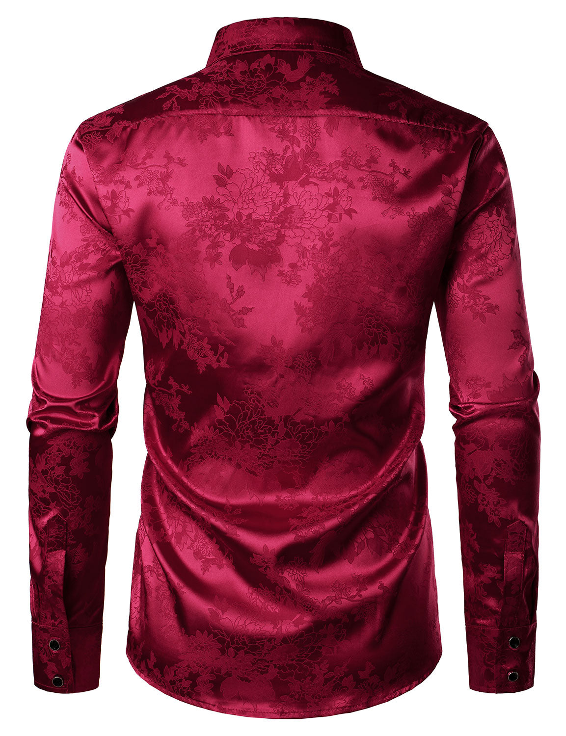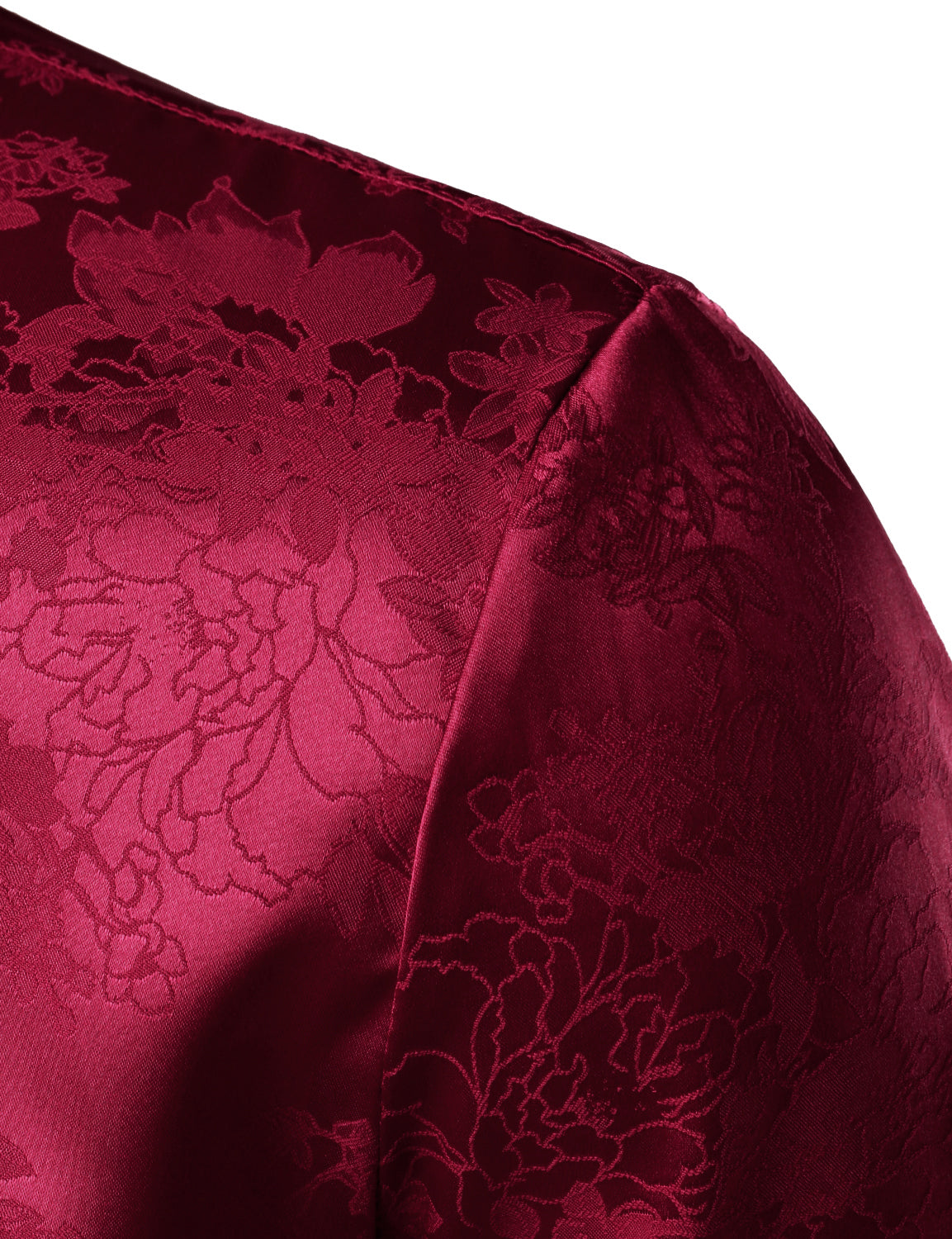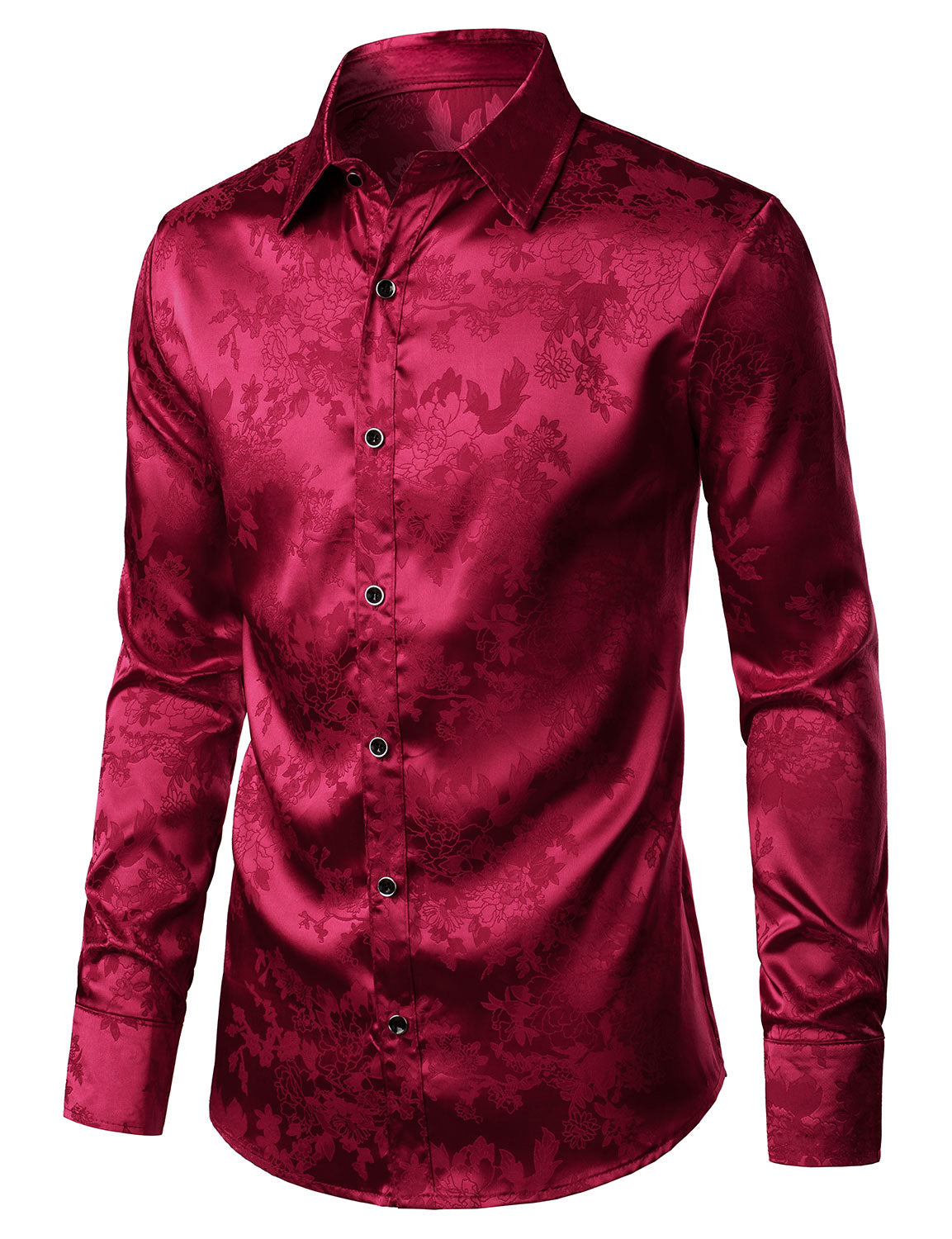 Men's Shiny Satin Floral Jacquard Red Button Up Long Sleeve Dress Shirt