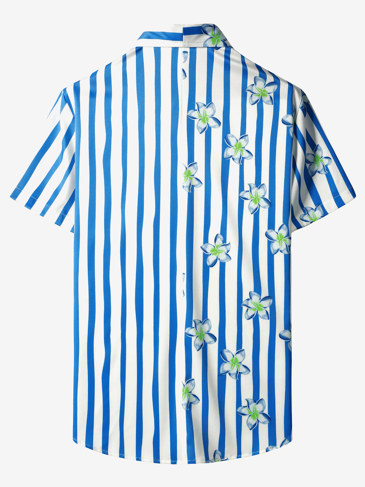Men's Floral Blue and White Striped Print Summer Casual Flowers Aloha Short Sleeve Hawaiian Shirt