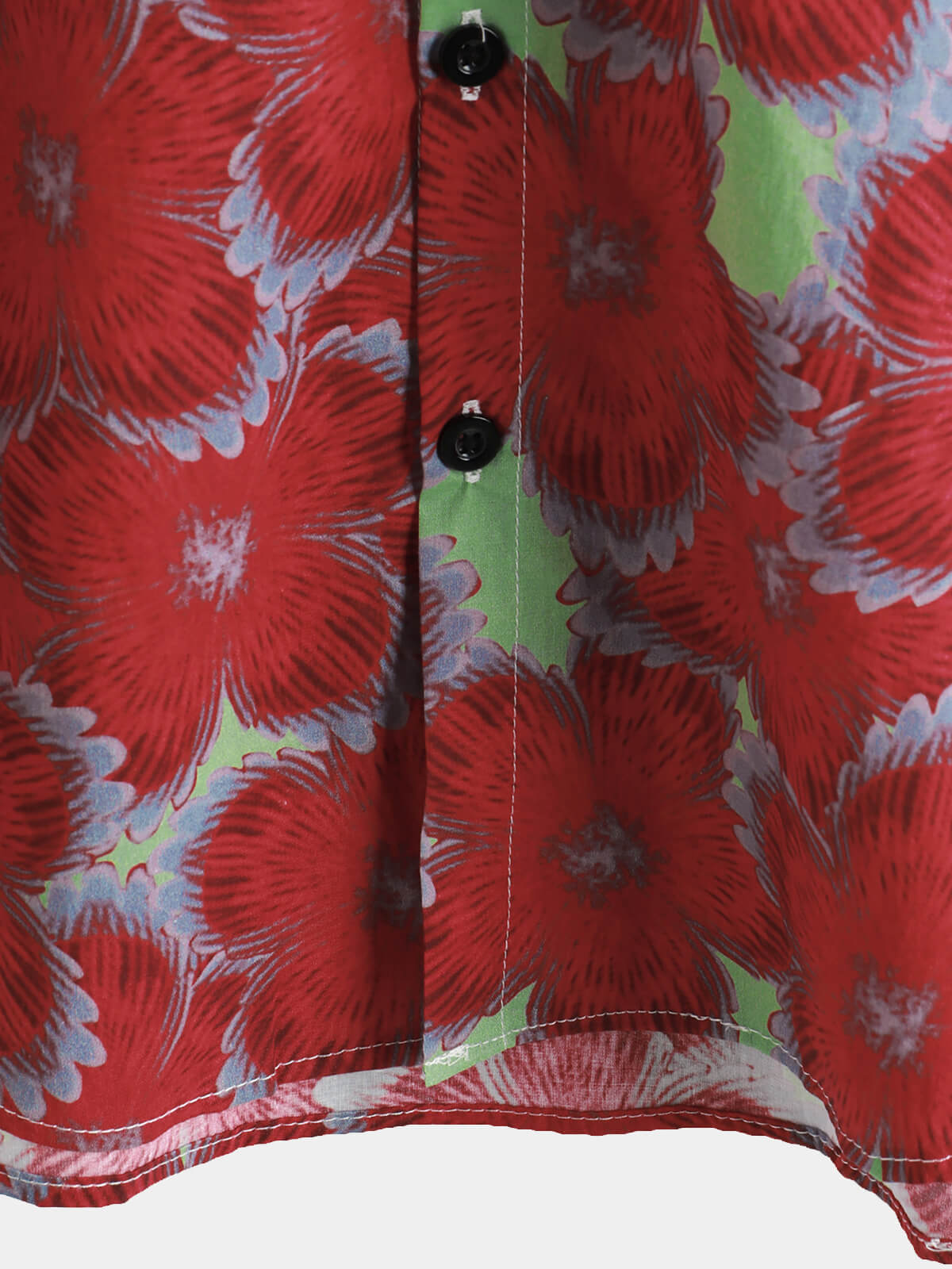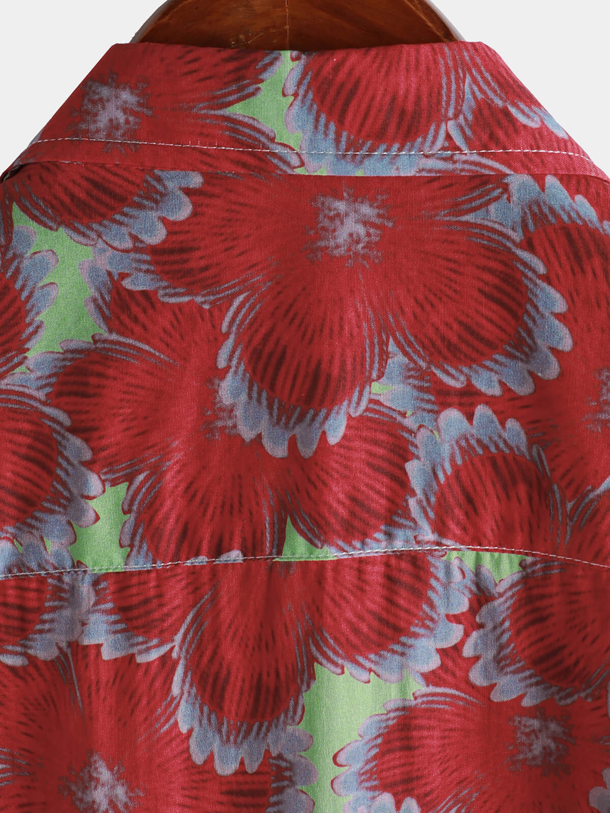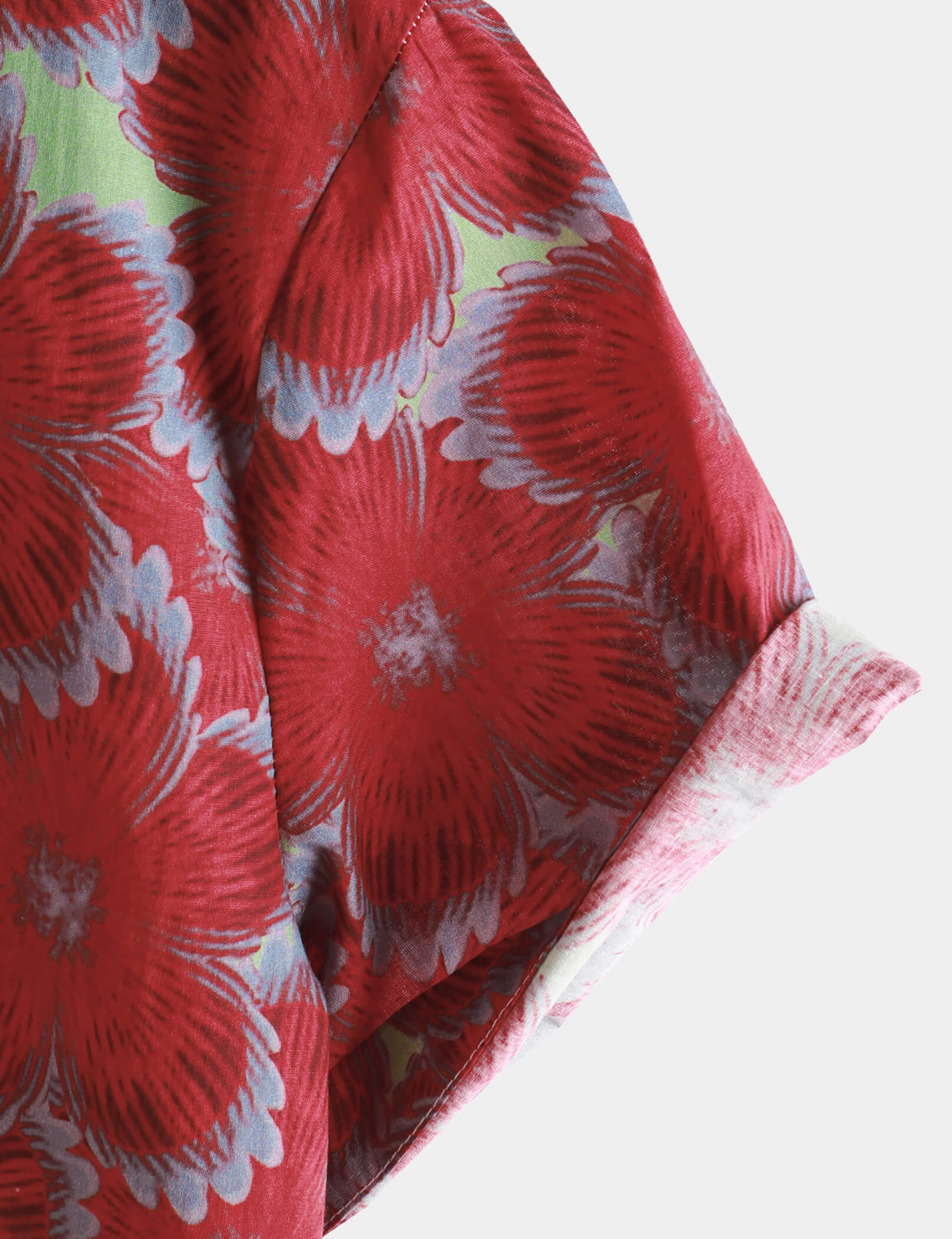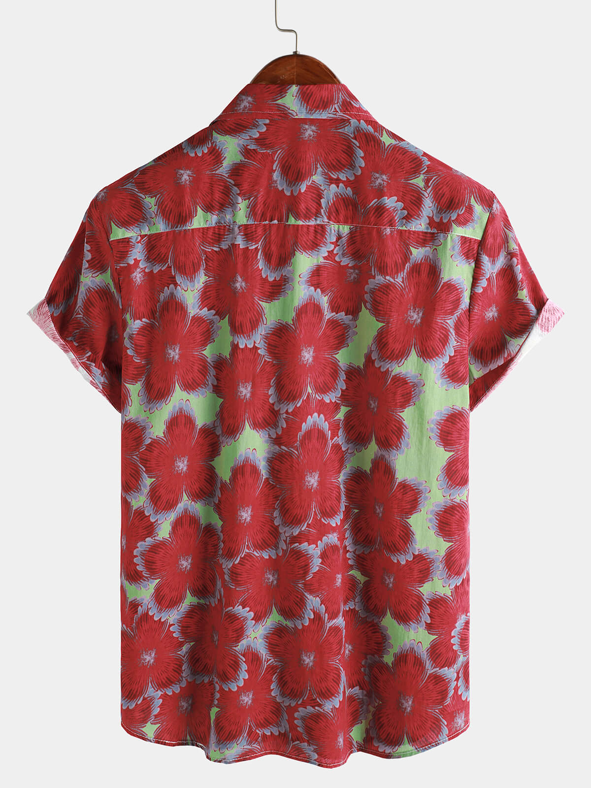 Men‘s 100% Cotton Hawaiian Red Floral Short Sleeve Button Summer Beach Shirt