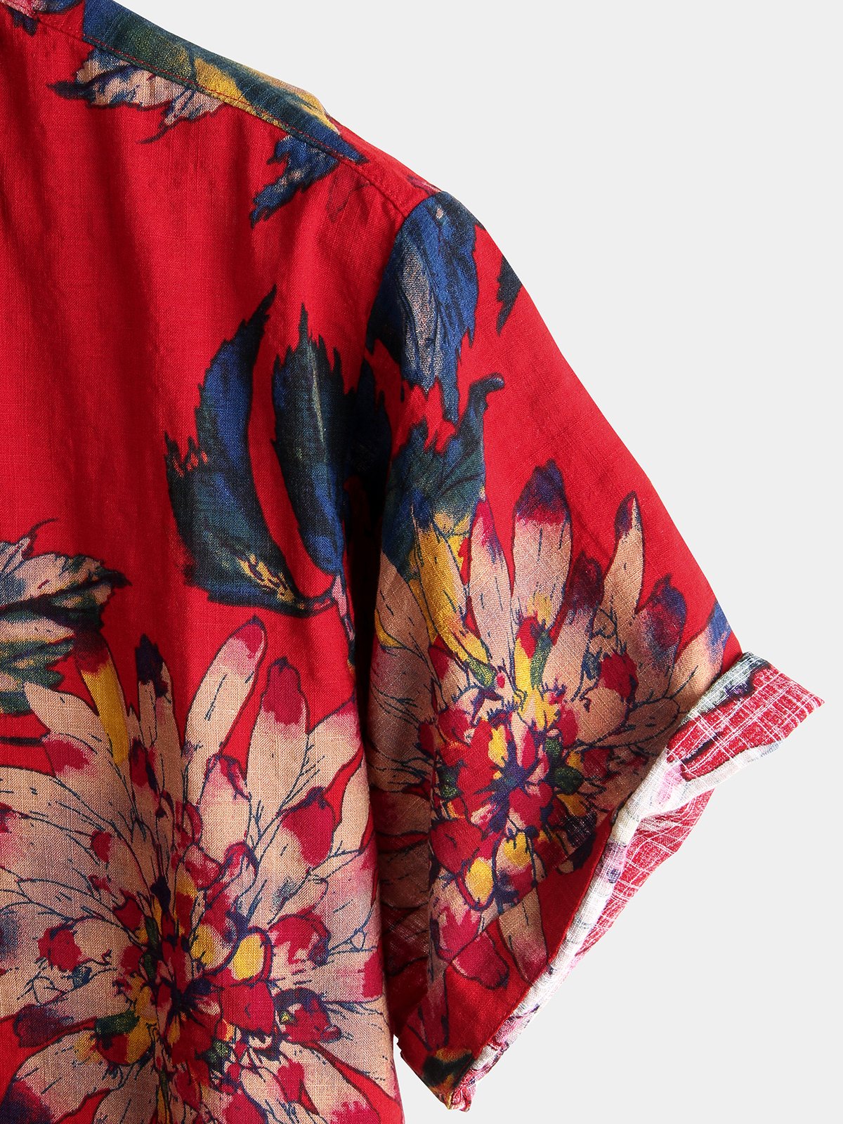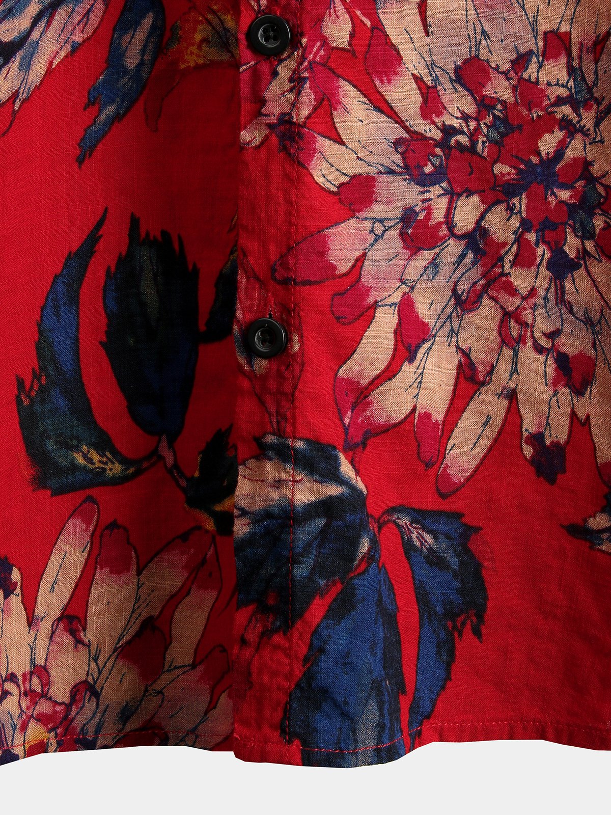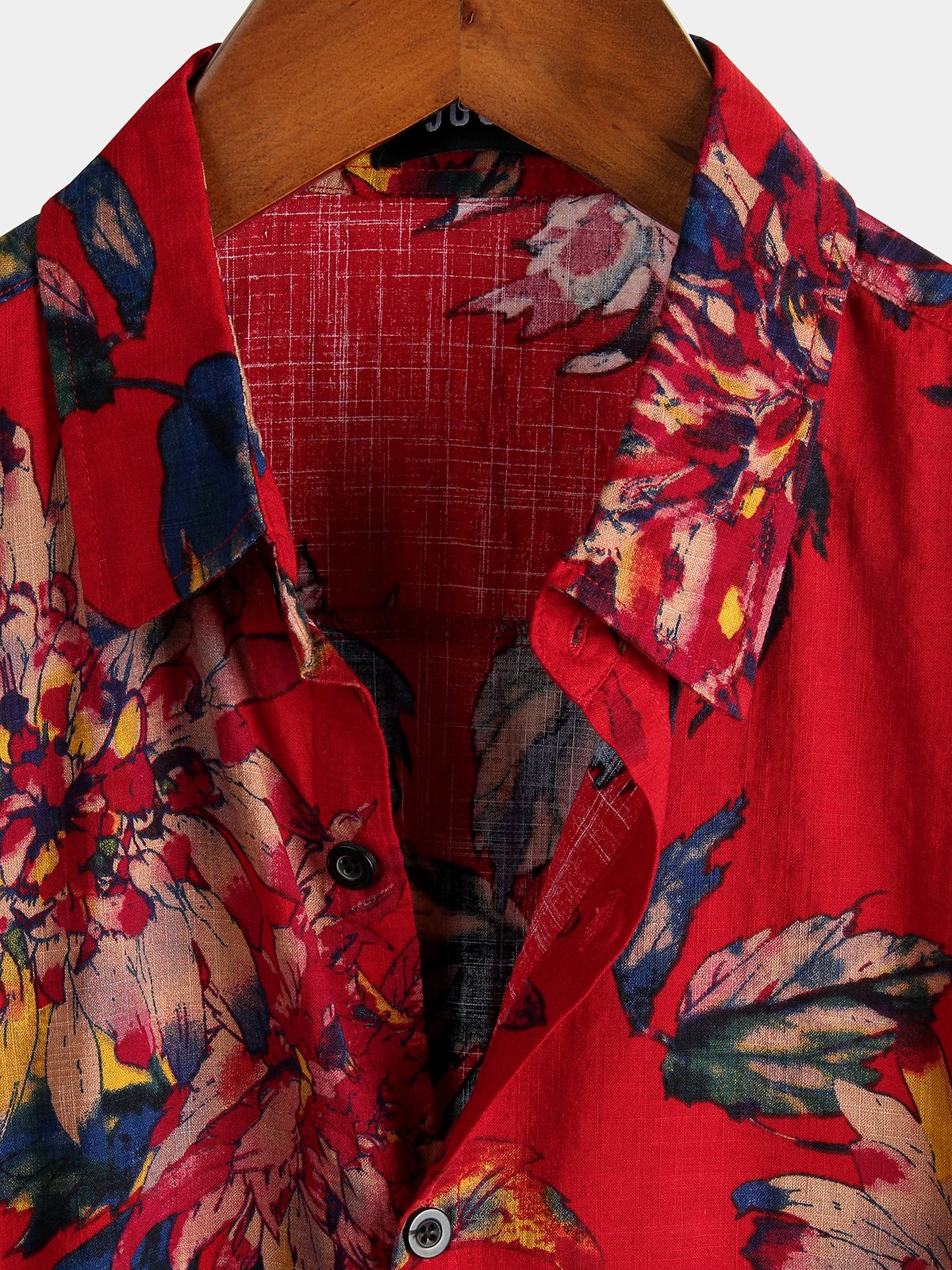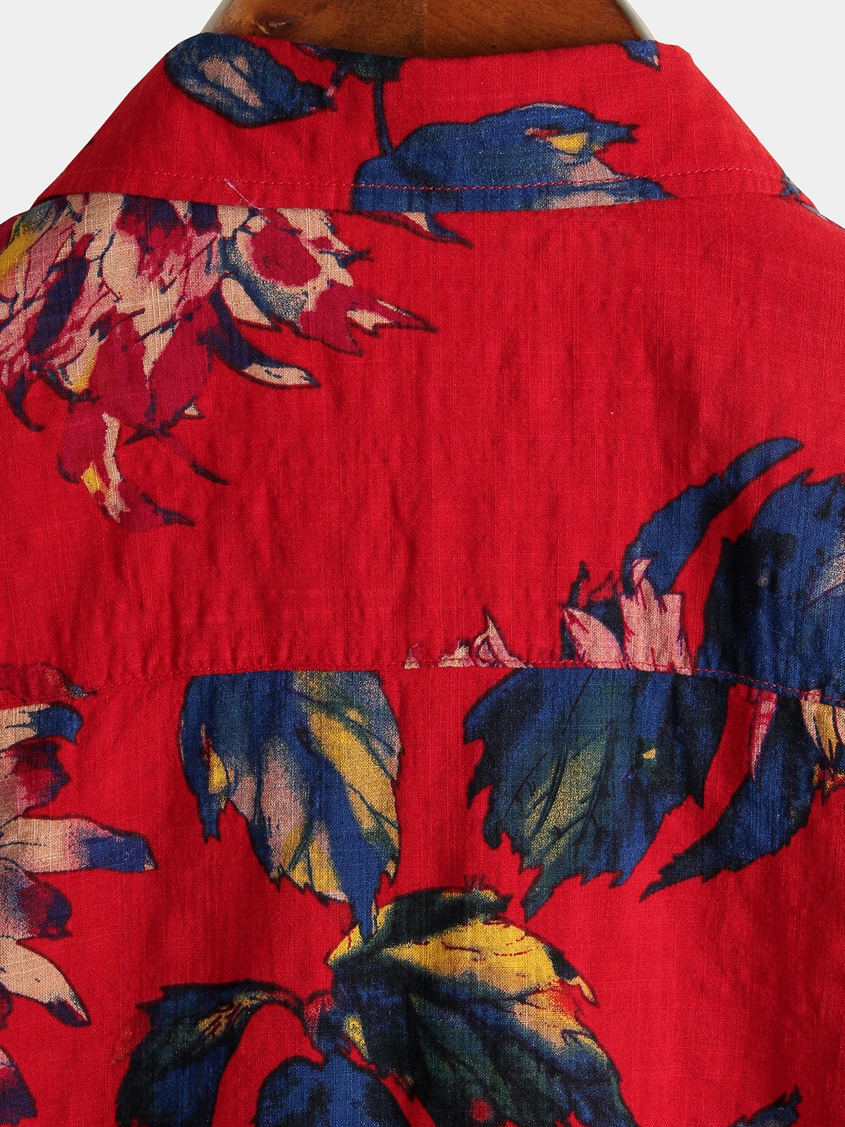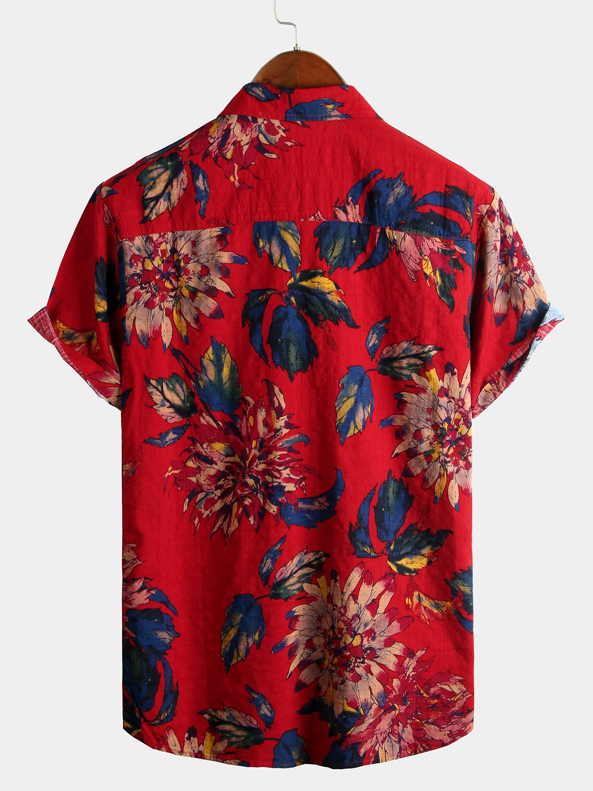 Men's Red Flower Tropical Hawaii Cotton Short Sleeve Shirt
