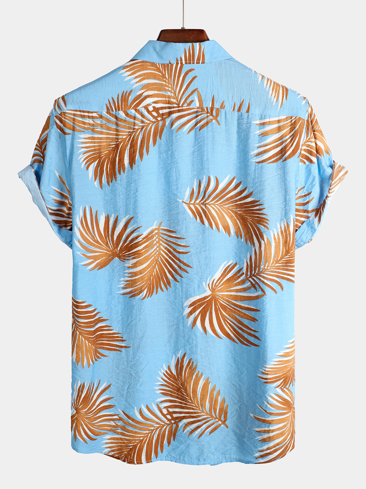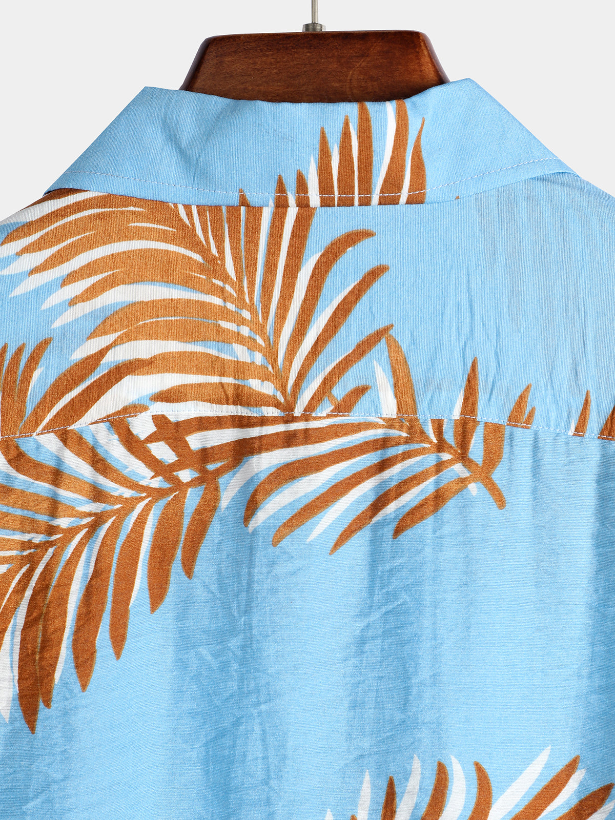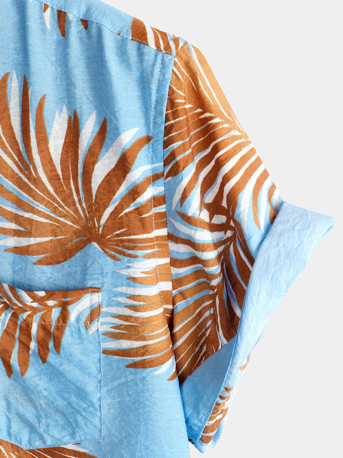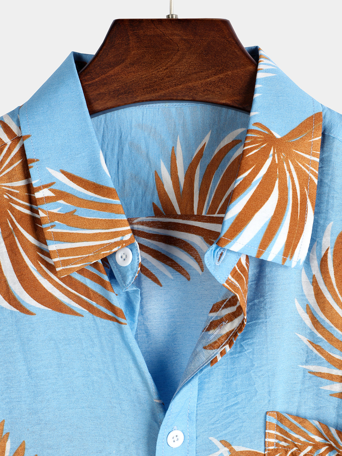 Men's Blue Tropical Leaf Print Pocket Short Sleeve Shirt