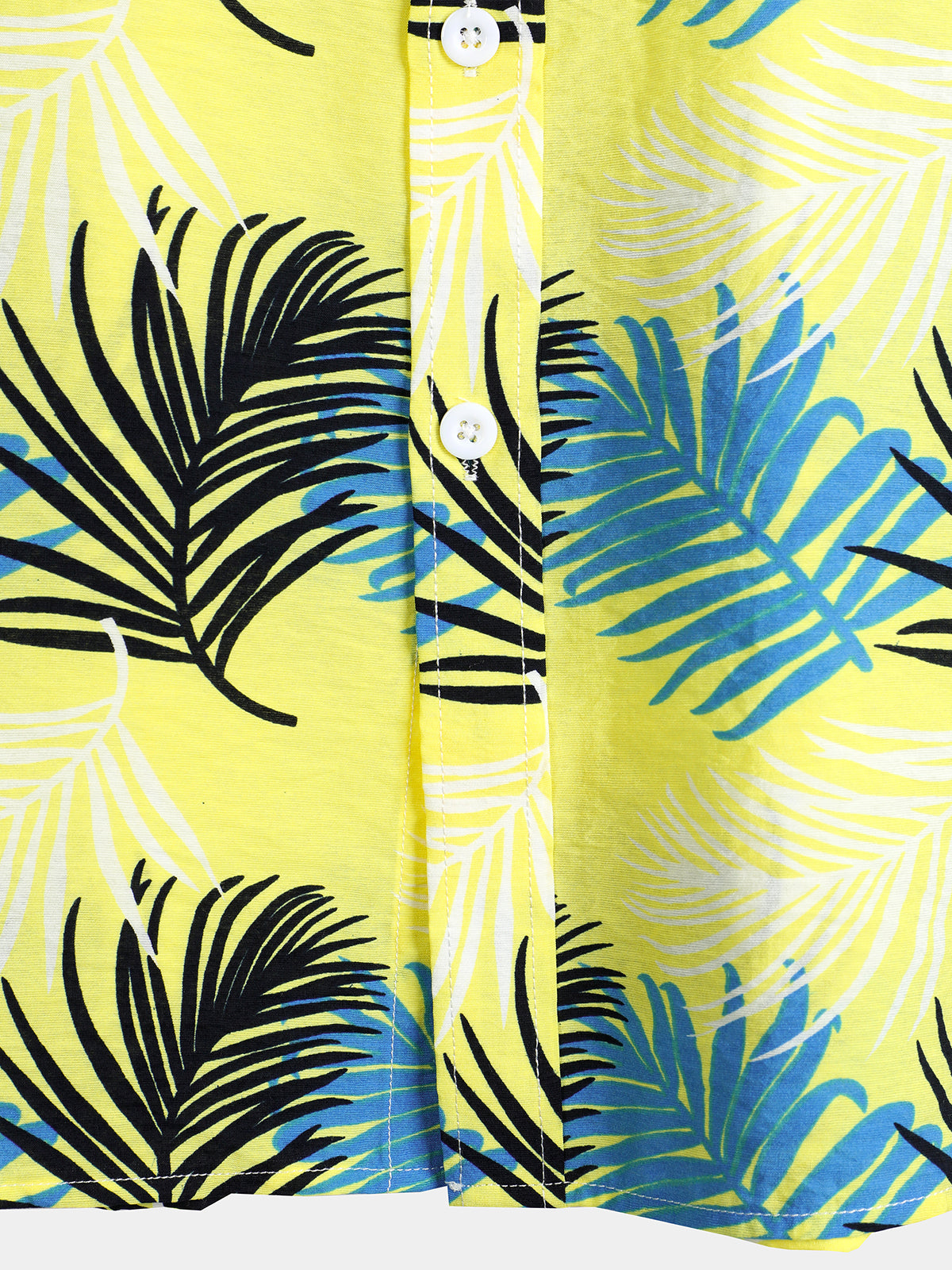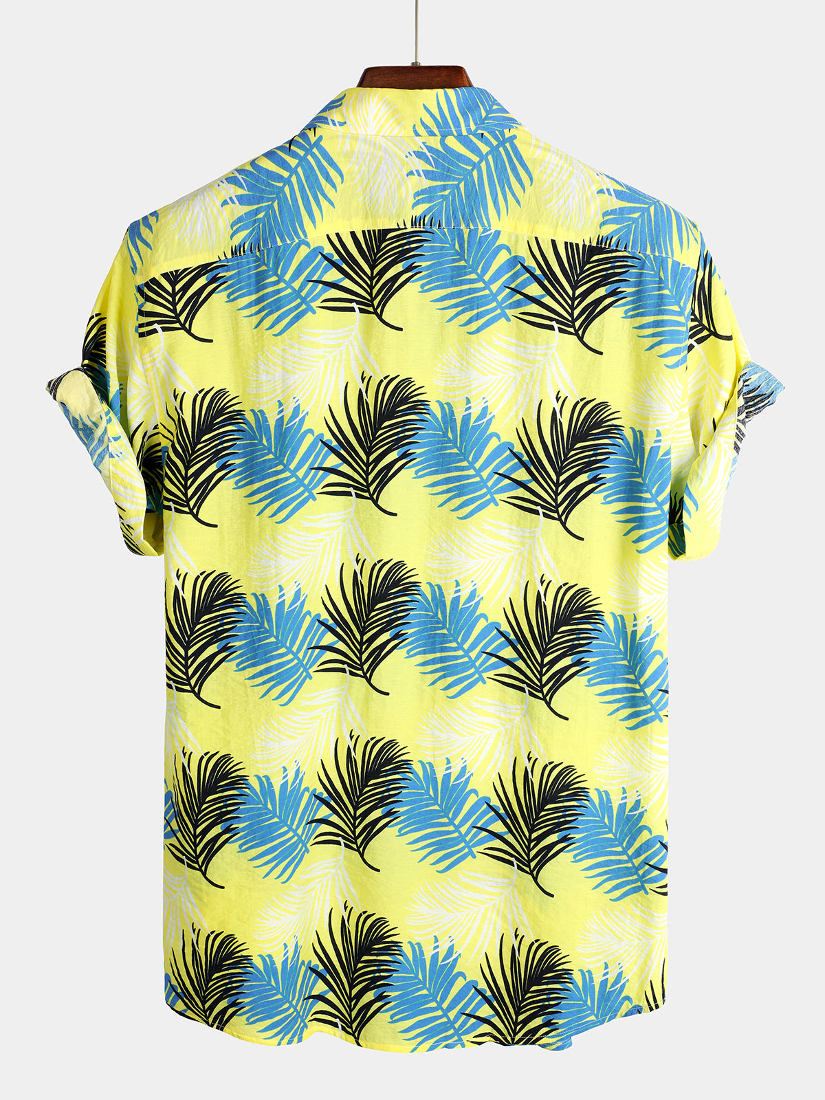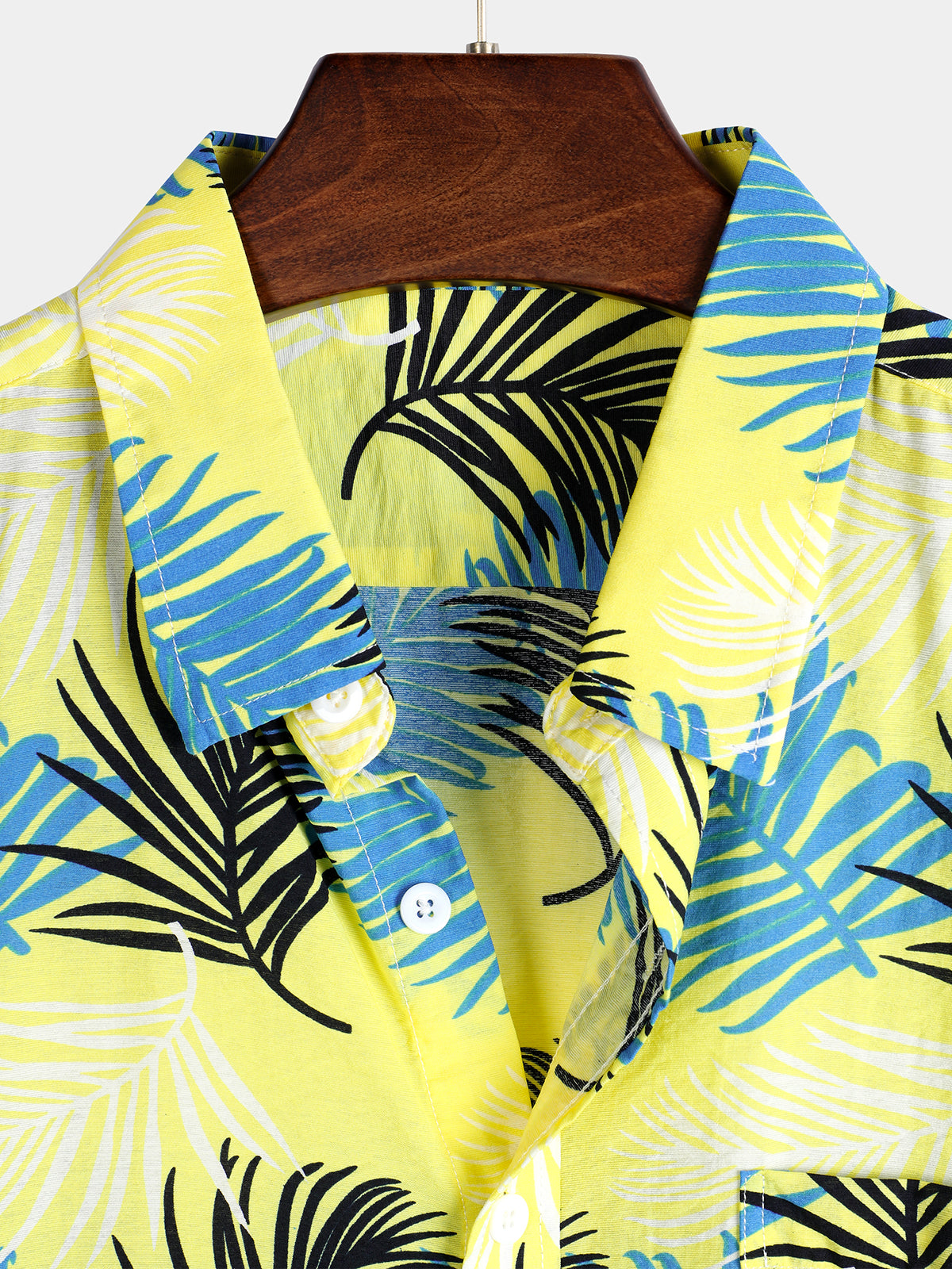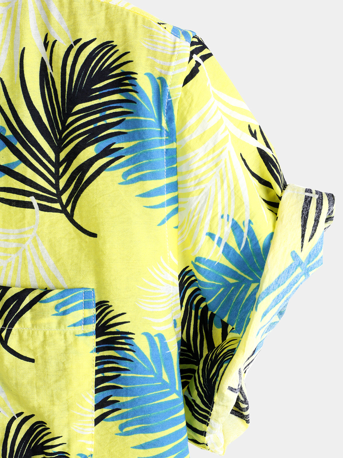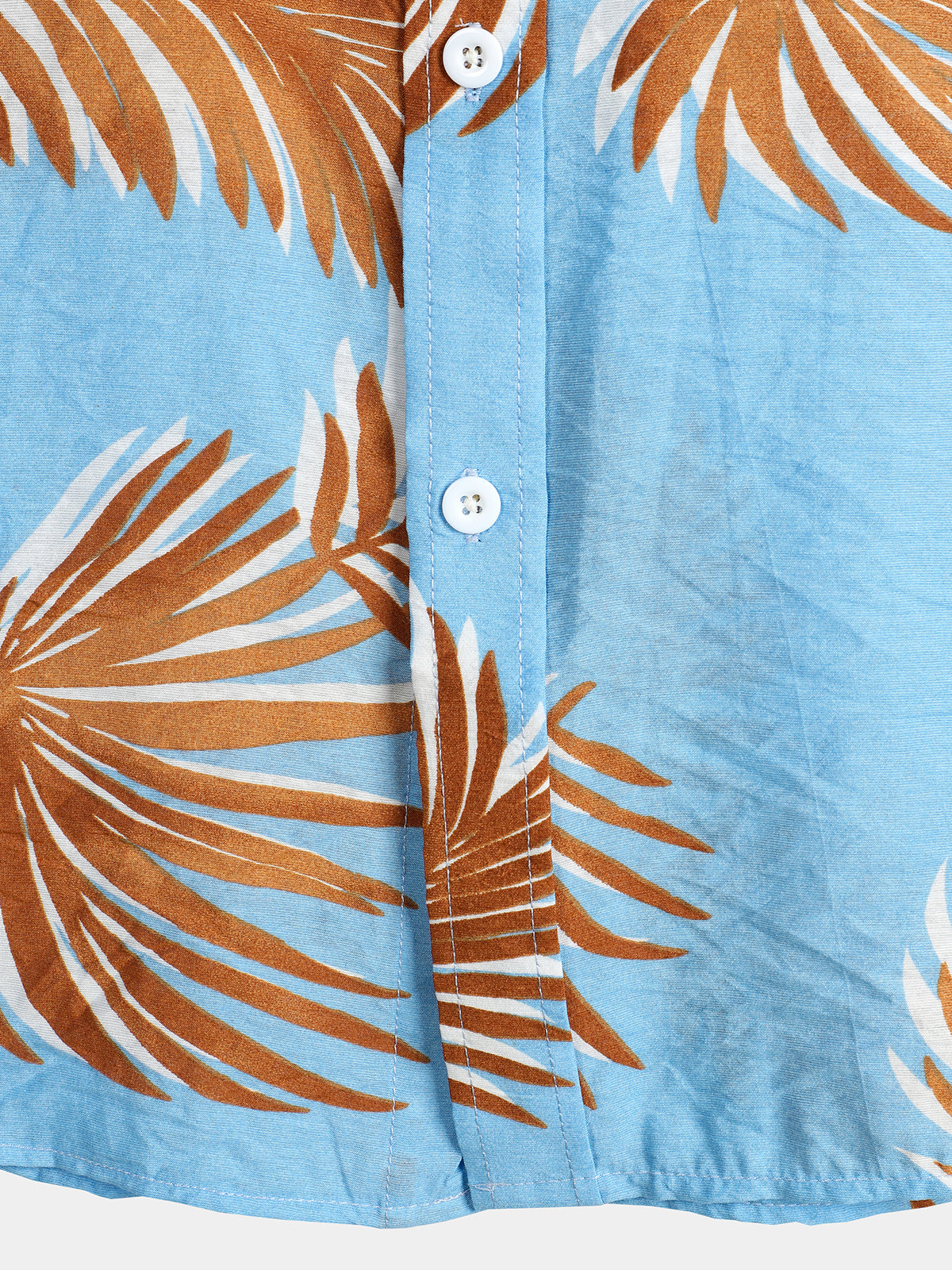 Men's Blue Tropical Leaf Print Pocket Short Sleeve Shirt