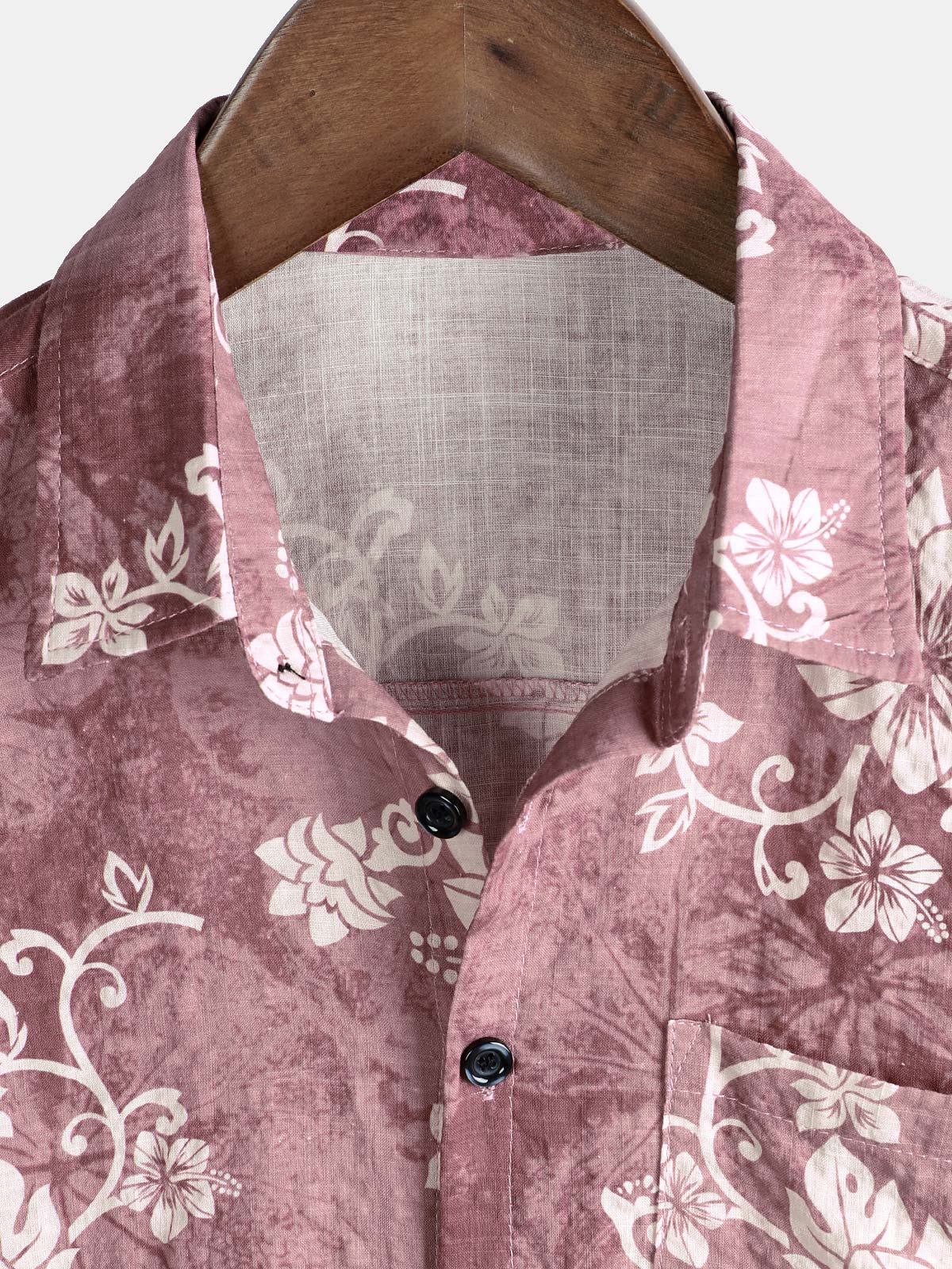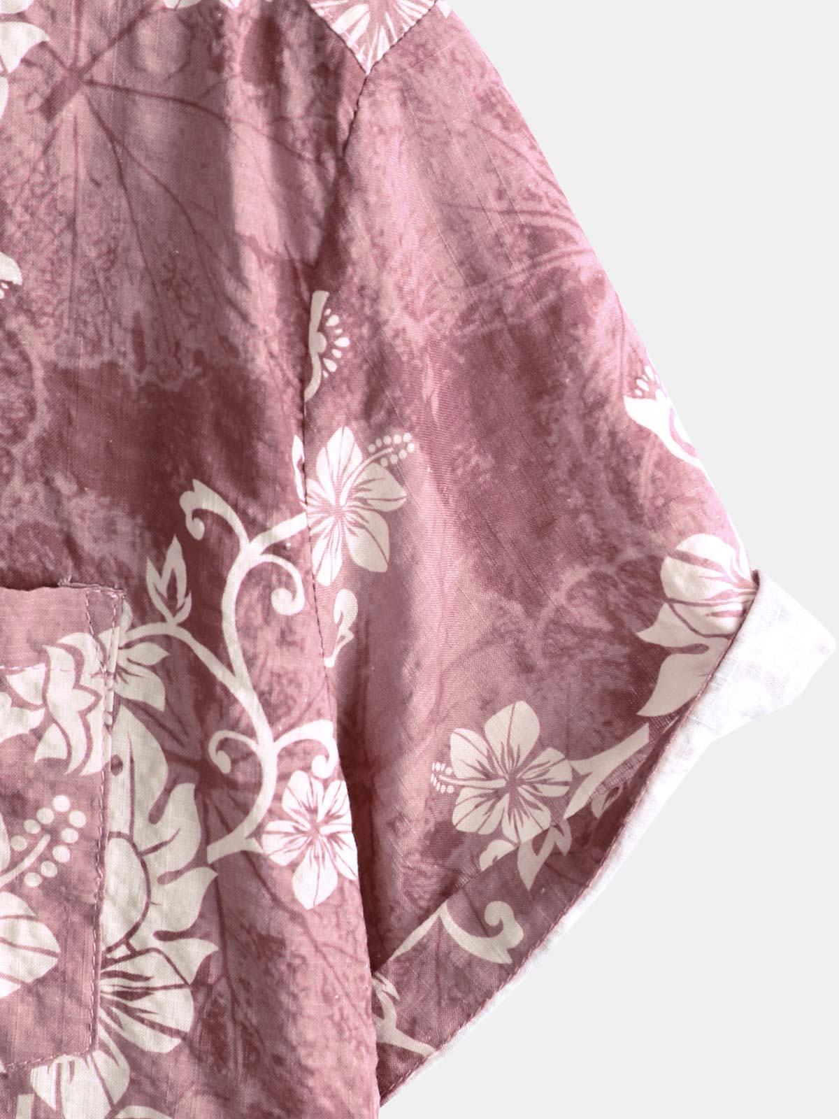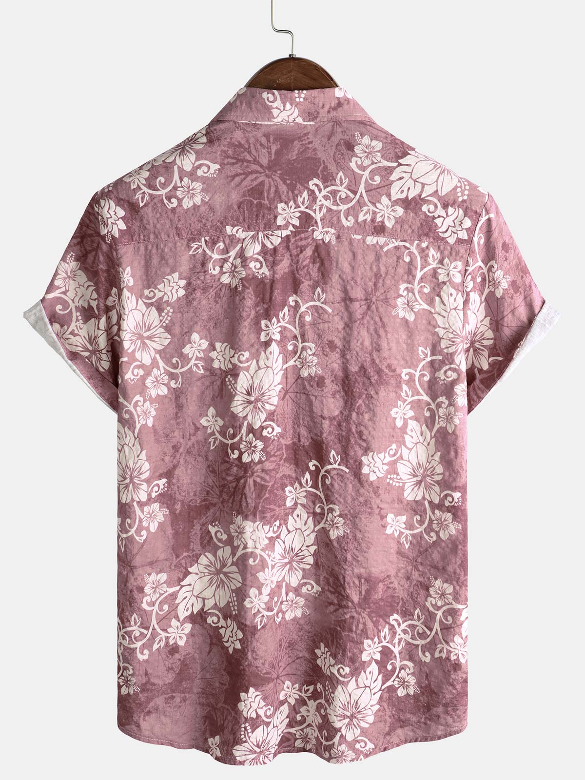 Men's Holiday Pink Floral Print Short Sleeve Pocket Shirt
