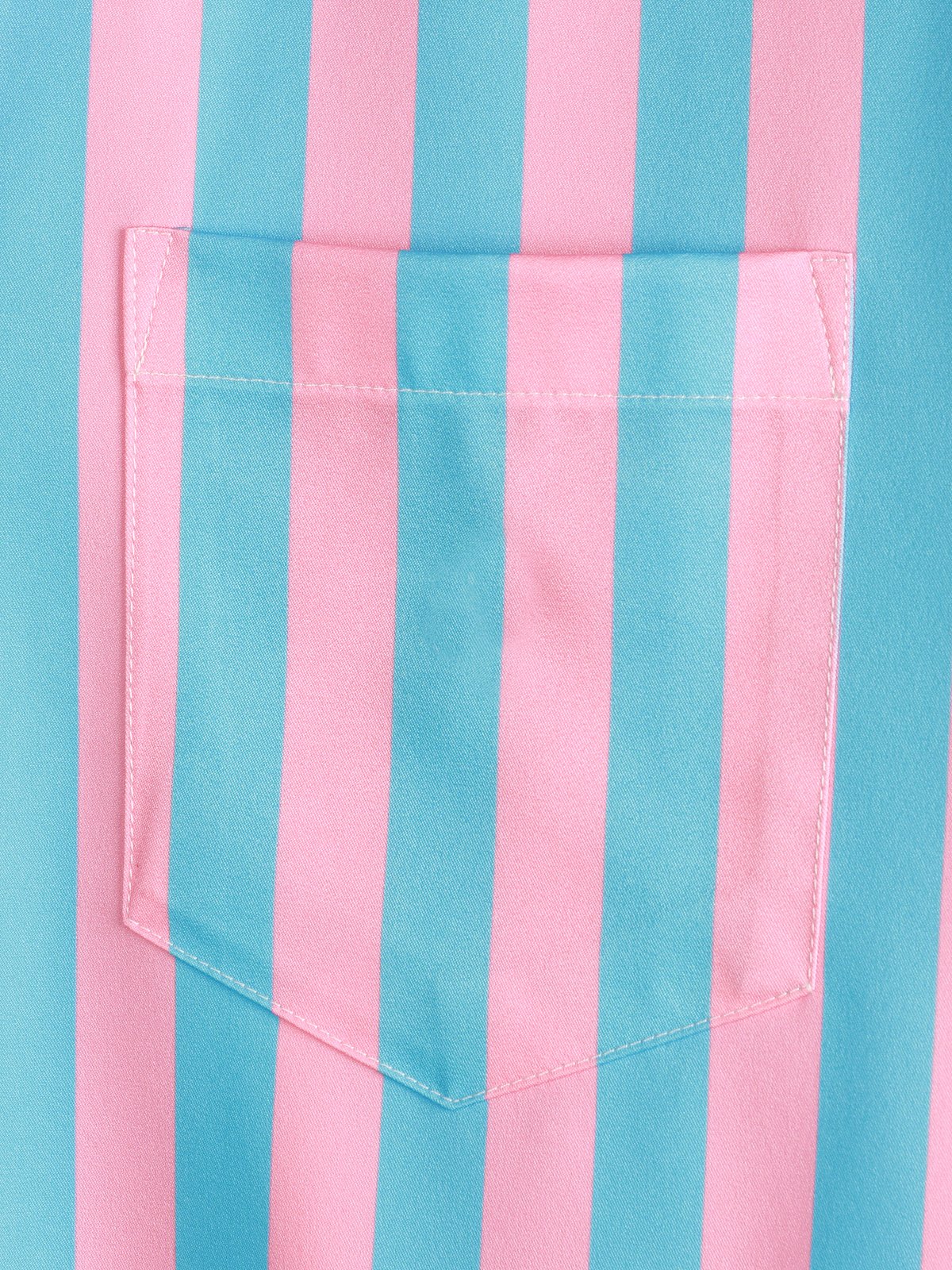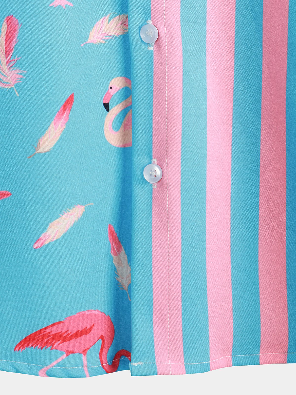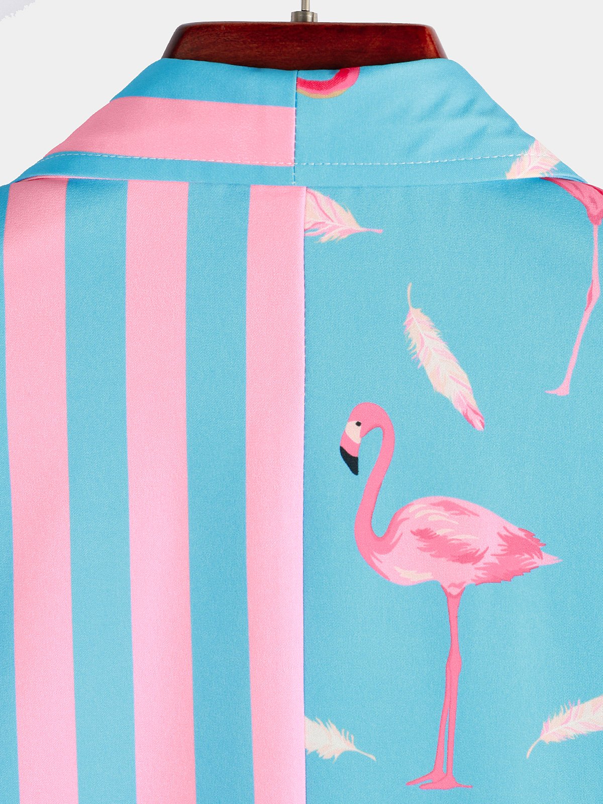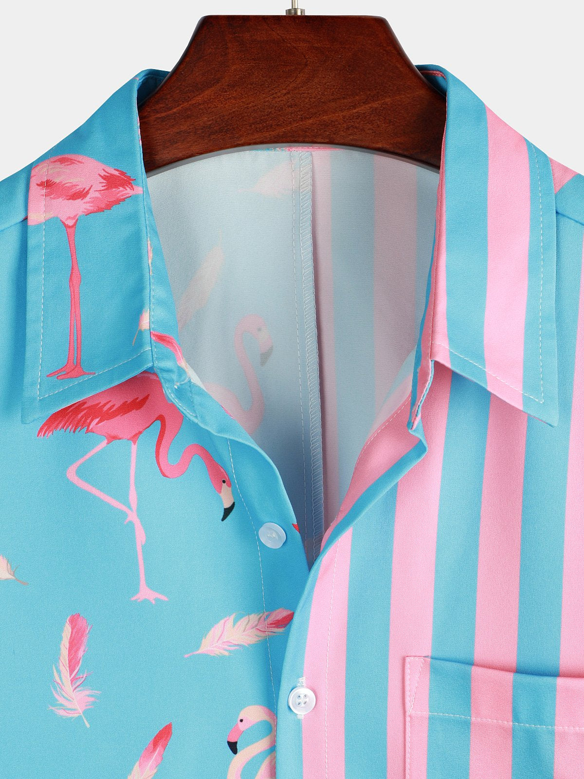 Men's Flamingo & Striped Print Pocket Short Sleeve Shirt
