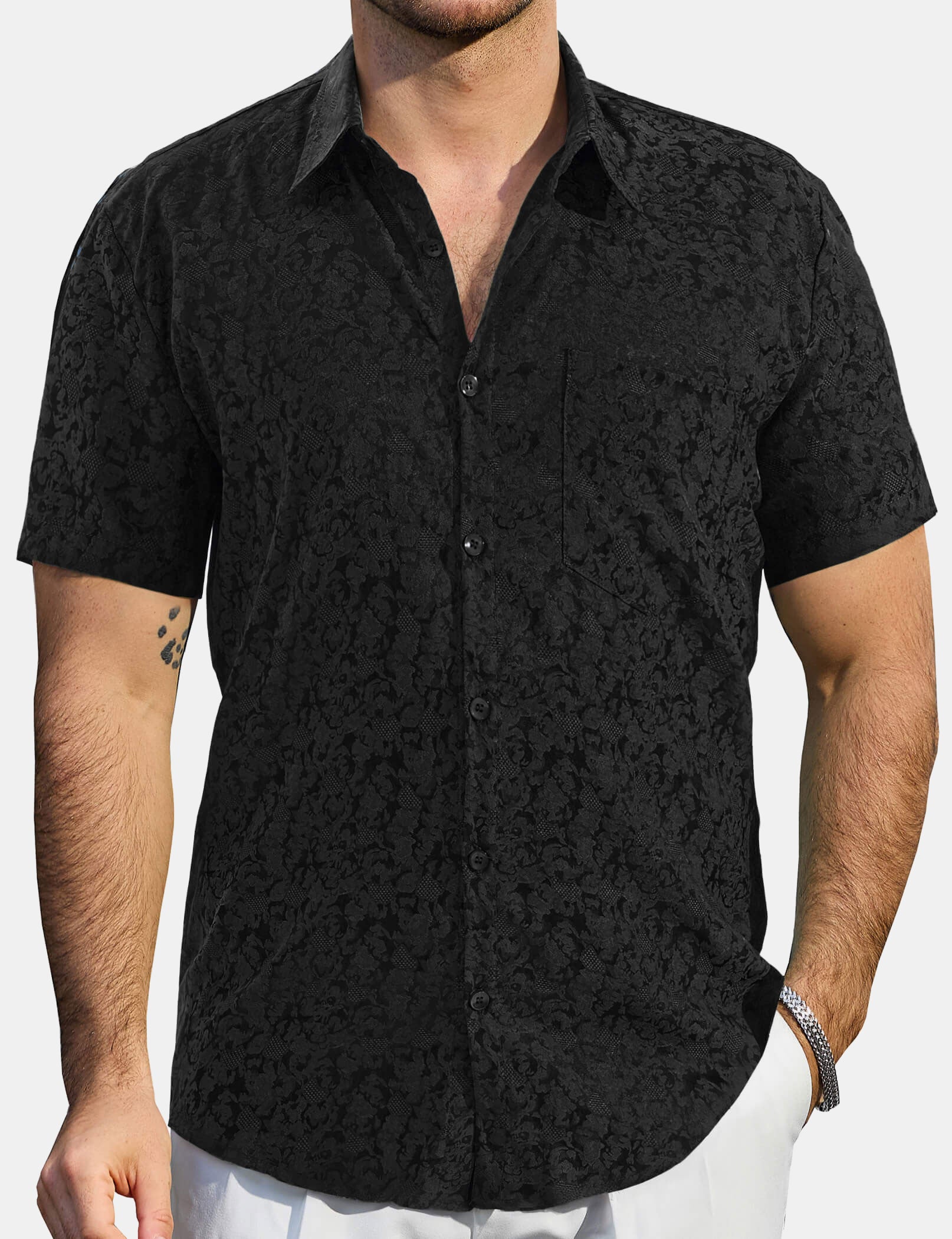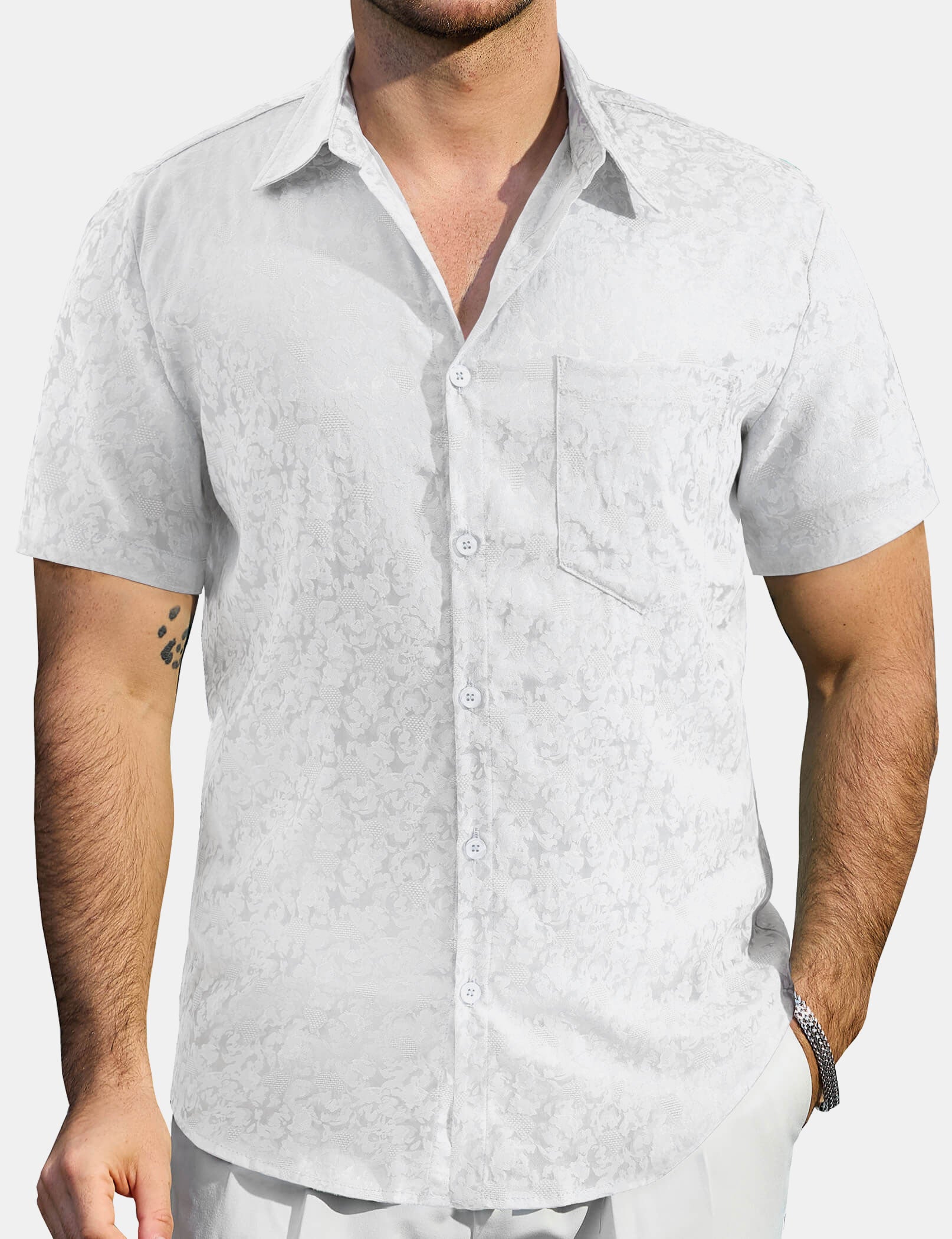 Men's Summer Jacquard Satin Casual Short Sleeve Button Up Shirts