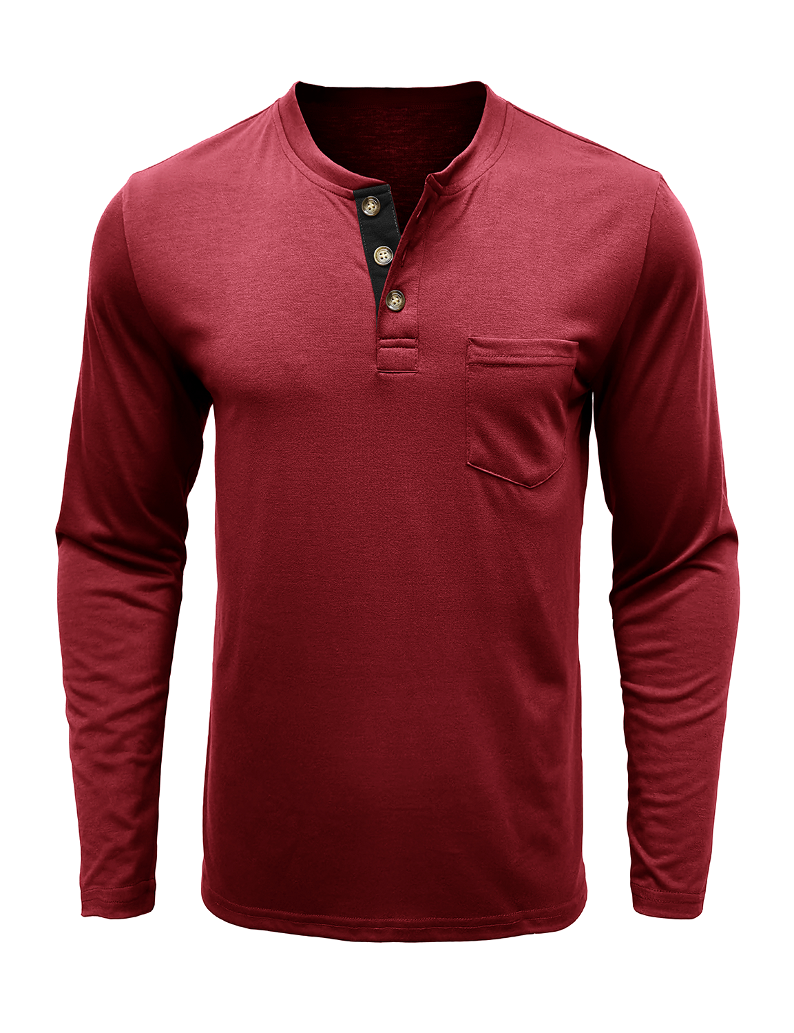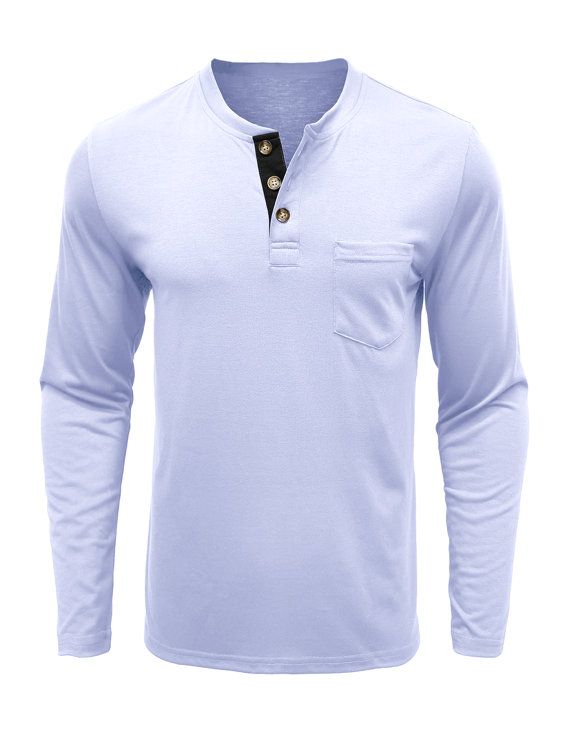Men's Solid Color Cotton Casual Henry Collar Pocket Long Sleeve T-Shirt