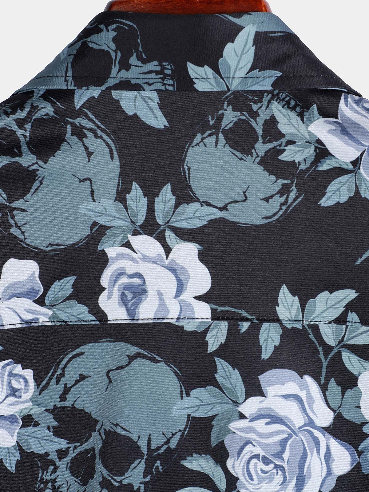 Men's Floral Print Cool Skull Vacation Button Short Sleeve Shirt