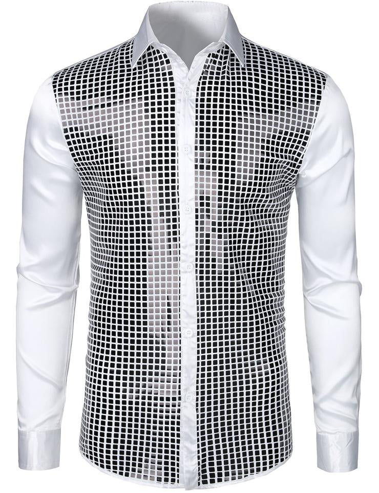 Mens Dress Shirt Silver Sequins Long Sleeve Button Down Disco Shirt Party Costume