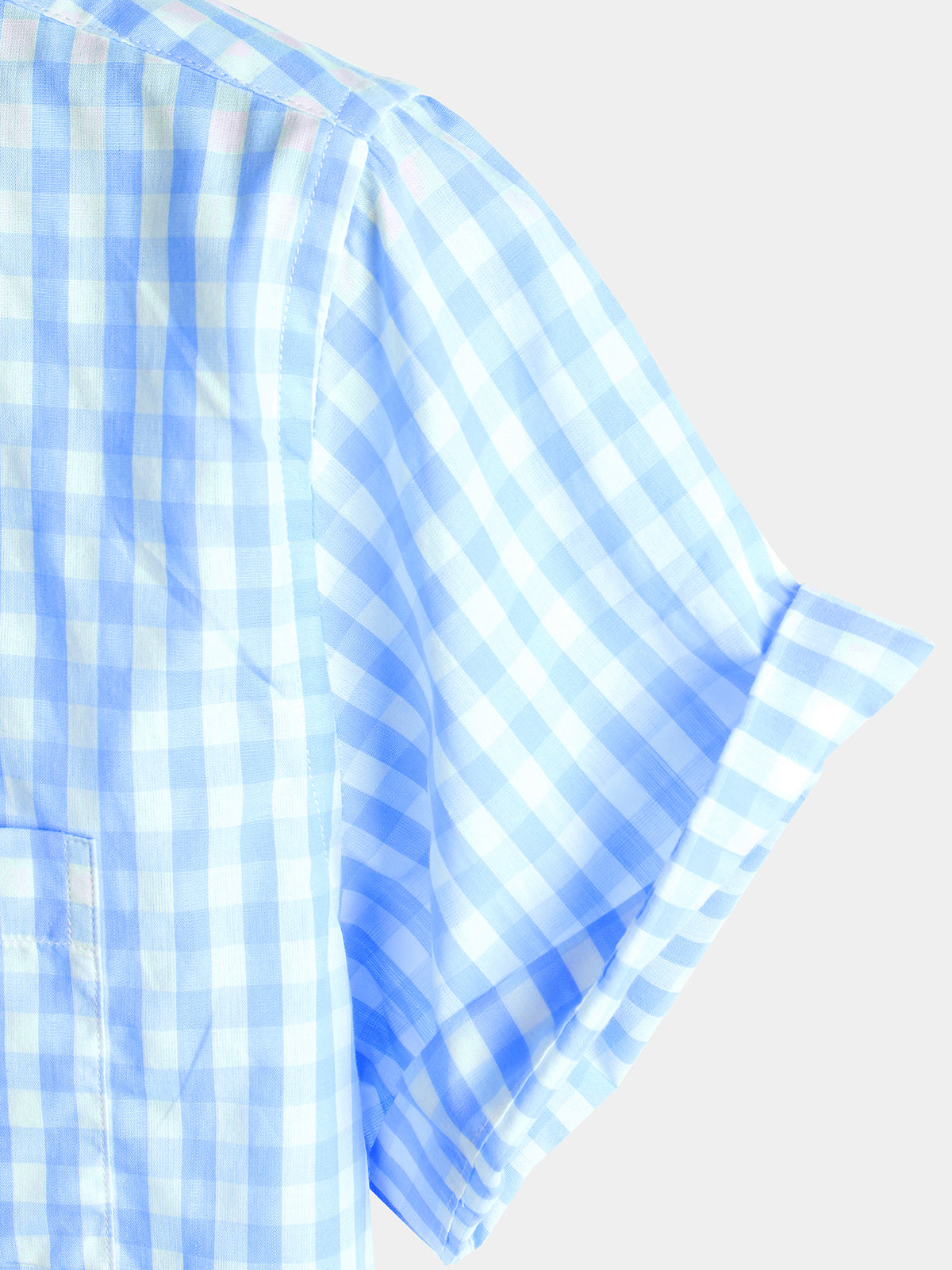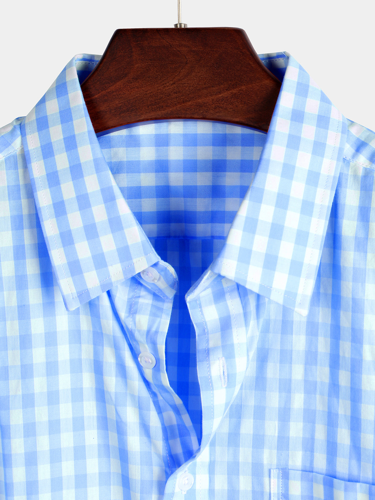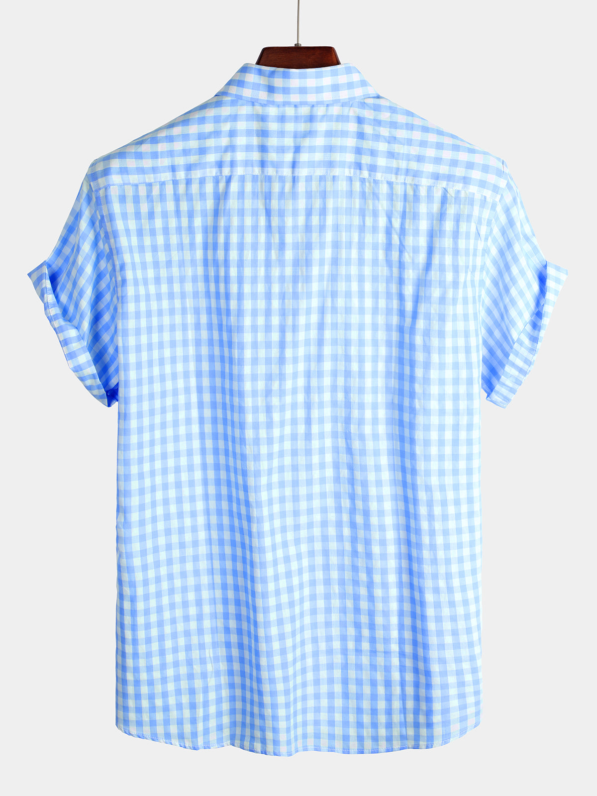 Men's Casual Solid Color Plaid Cotton Pocket Short Sleeve Shirt