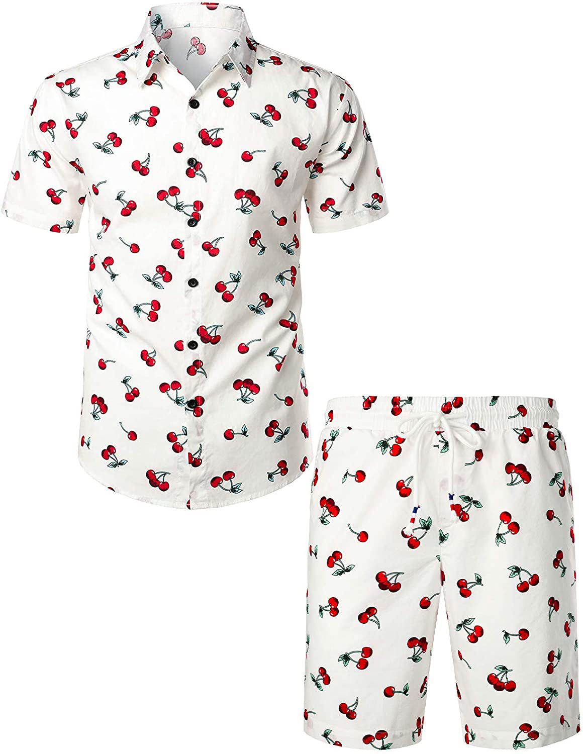 Men's Lemon Print Cotton Tropical Fruit Hawaiian Shirt and Shorts Set